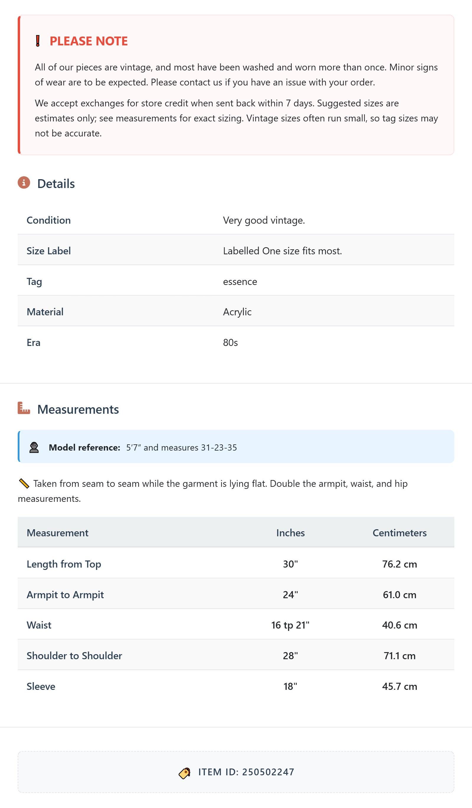 All of our pieces are vintage, and most have been washed and worn more than once. Minor signs of wear are to be expected. Please contact us if you have an issue with your order. We accept exchanges for store credit when sent back within 7 days.