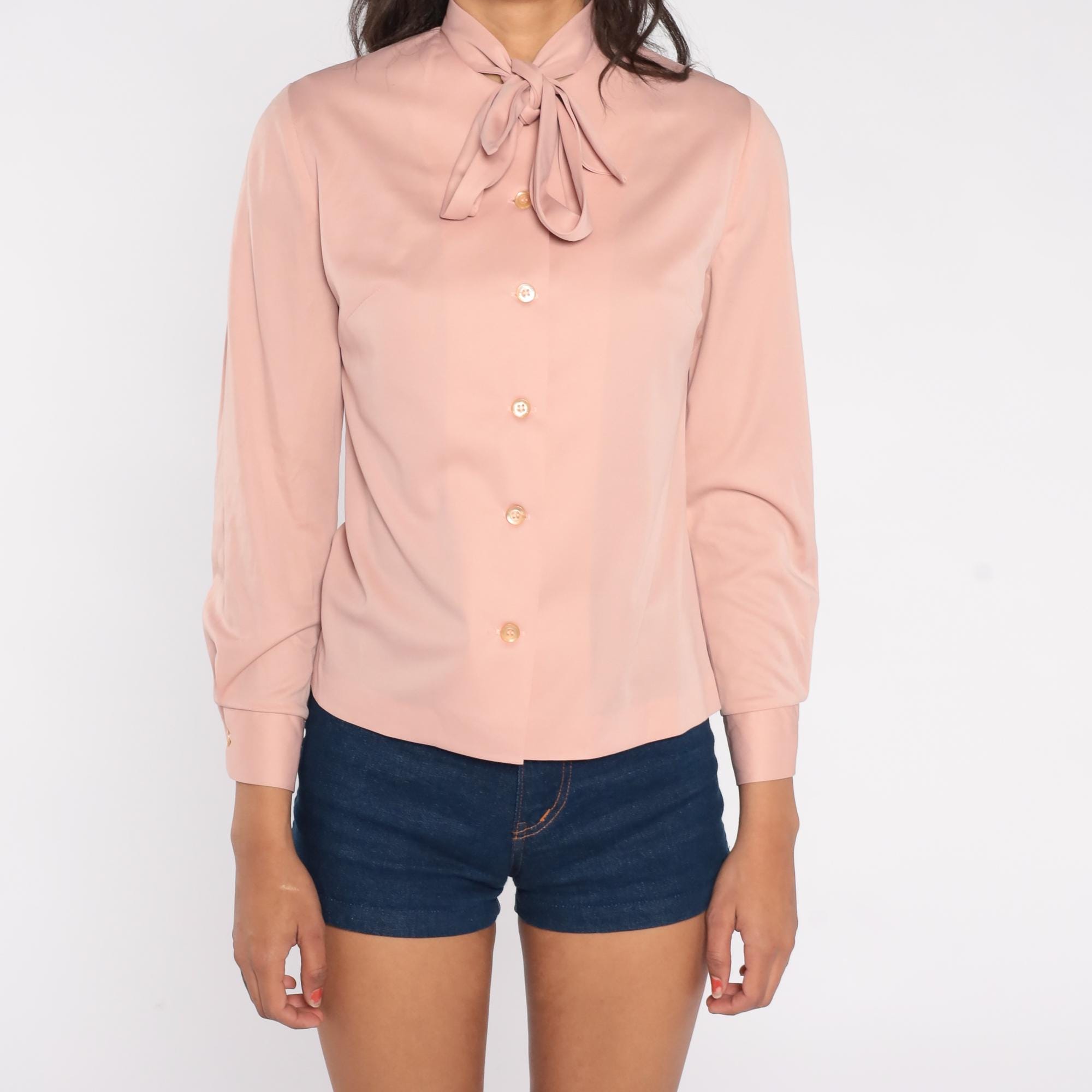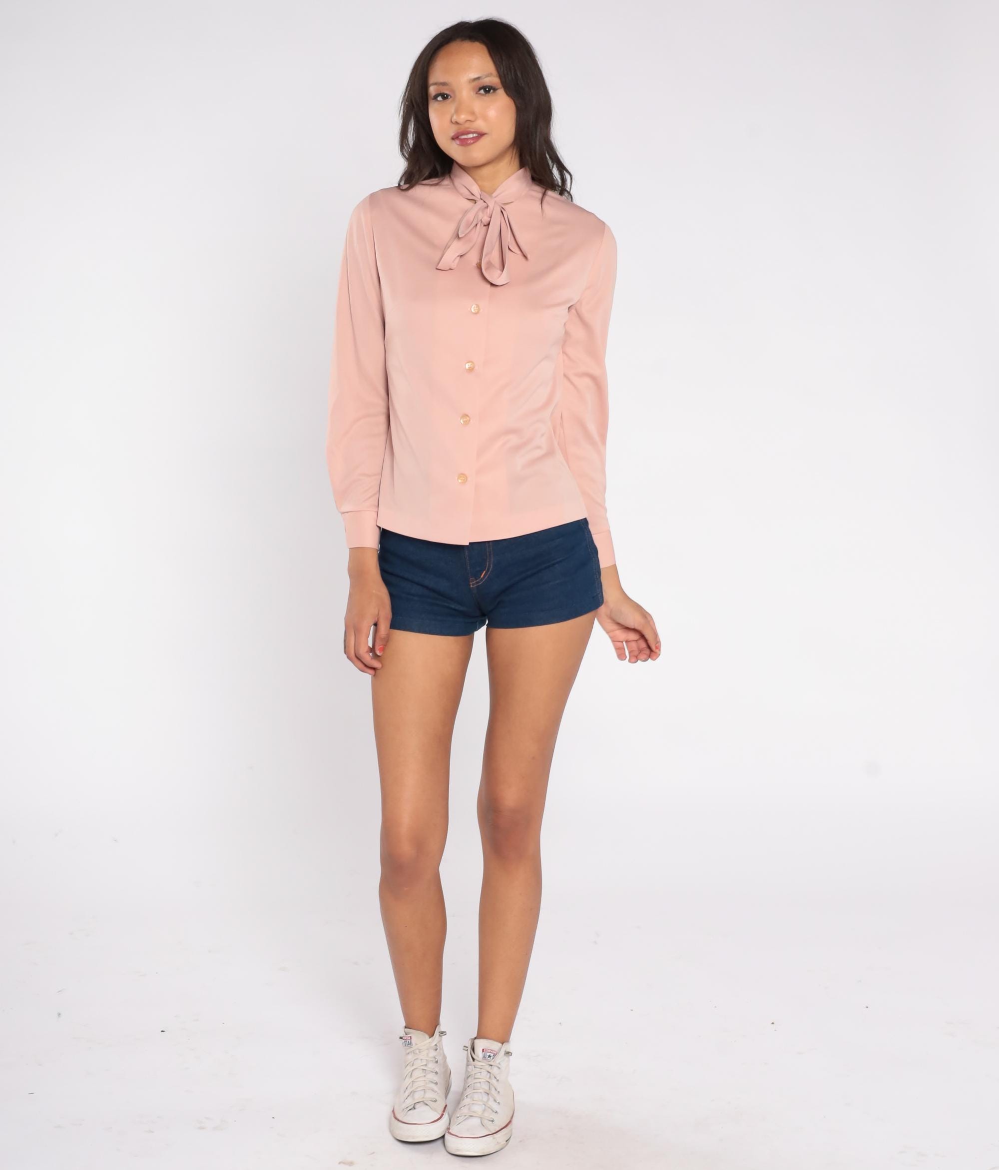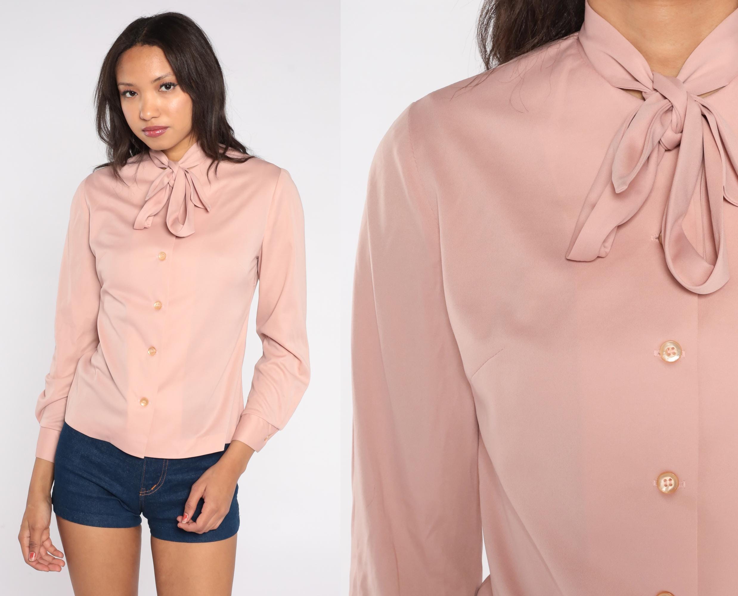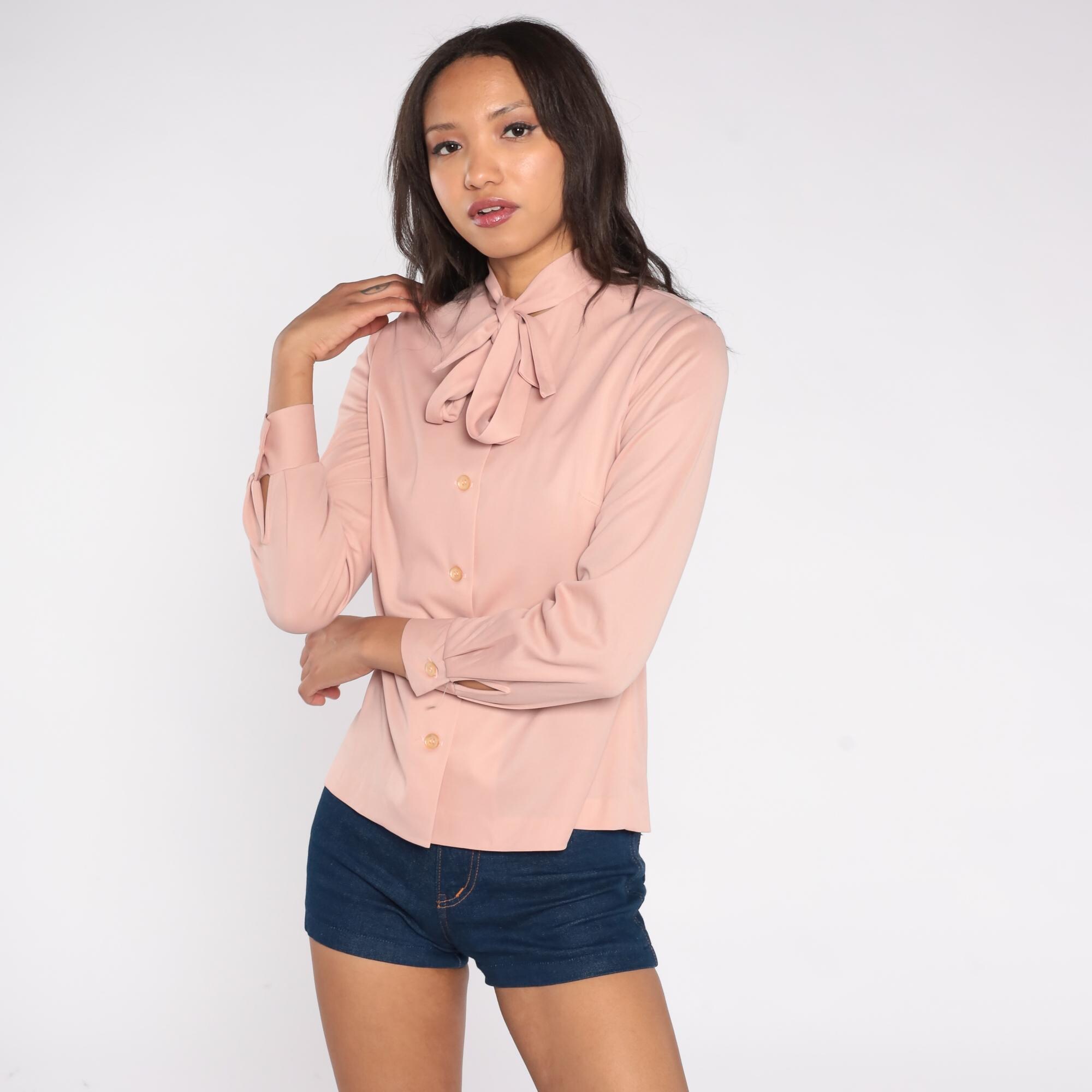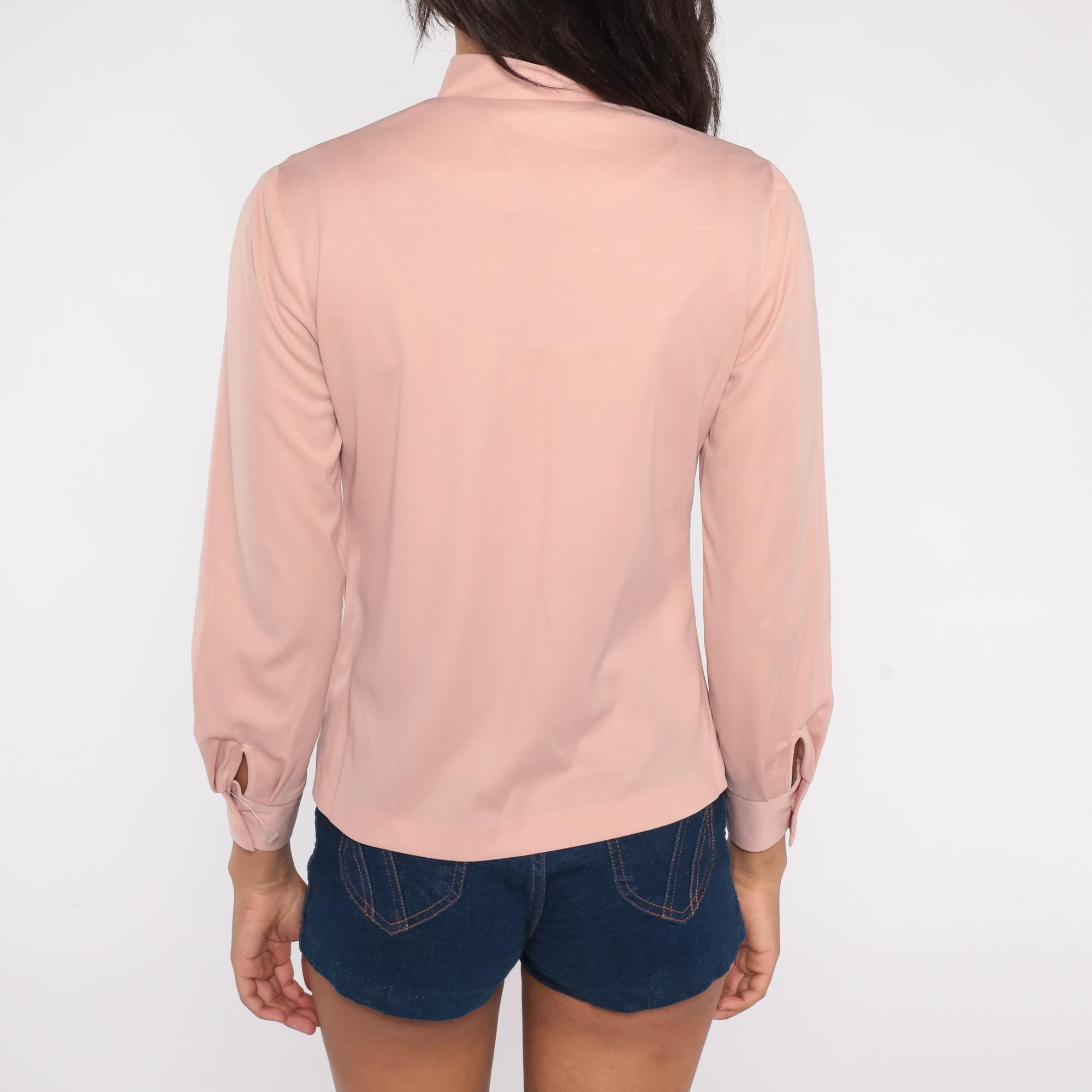 Elegant blush pink button-down blouse with pussy bow neck tie from Sir Julian, circa 1970s. Features pearly pink buttons down the front, long sleeves with button cuffs, and a soft, feminine silhouette.