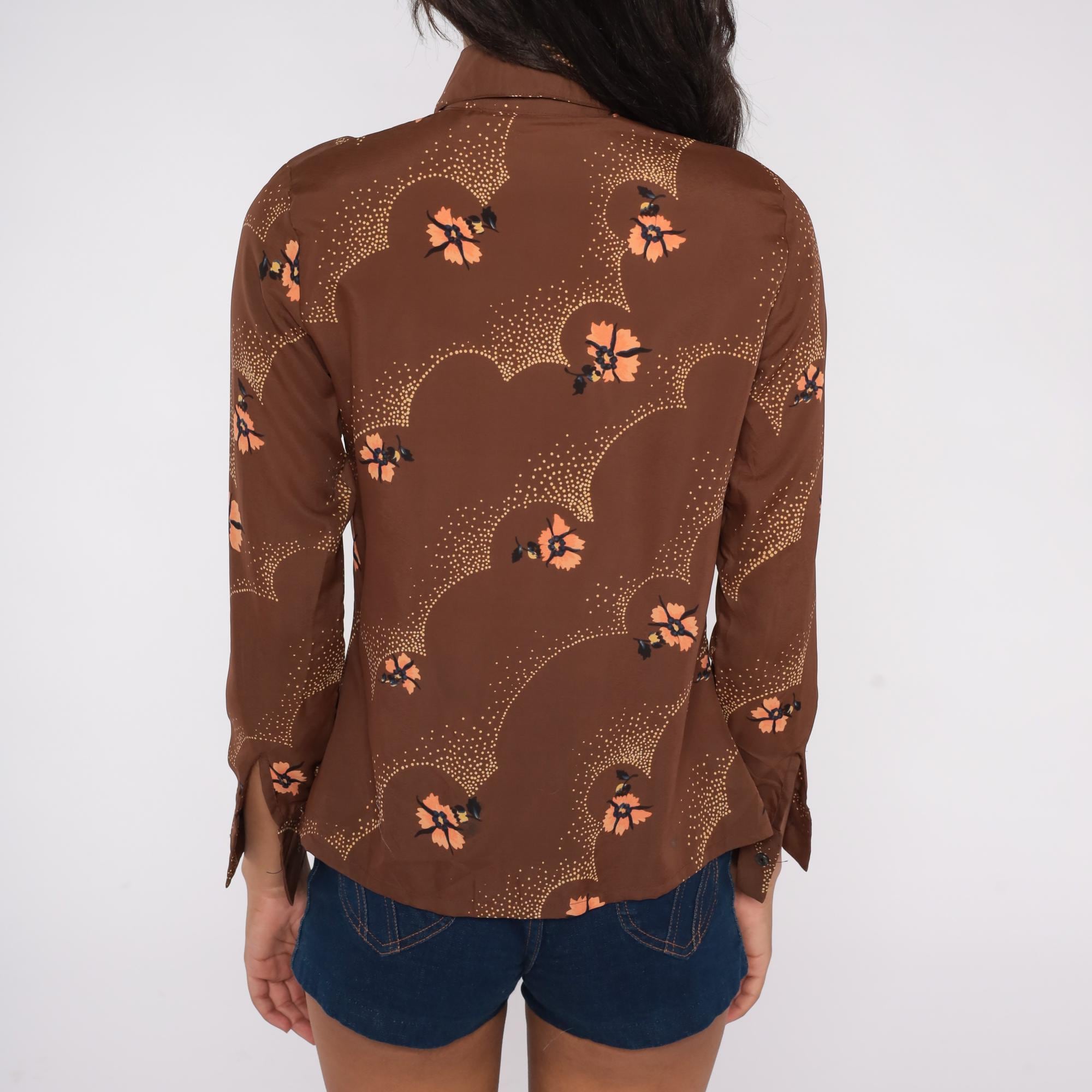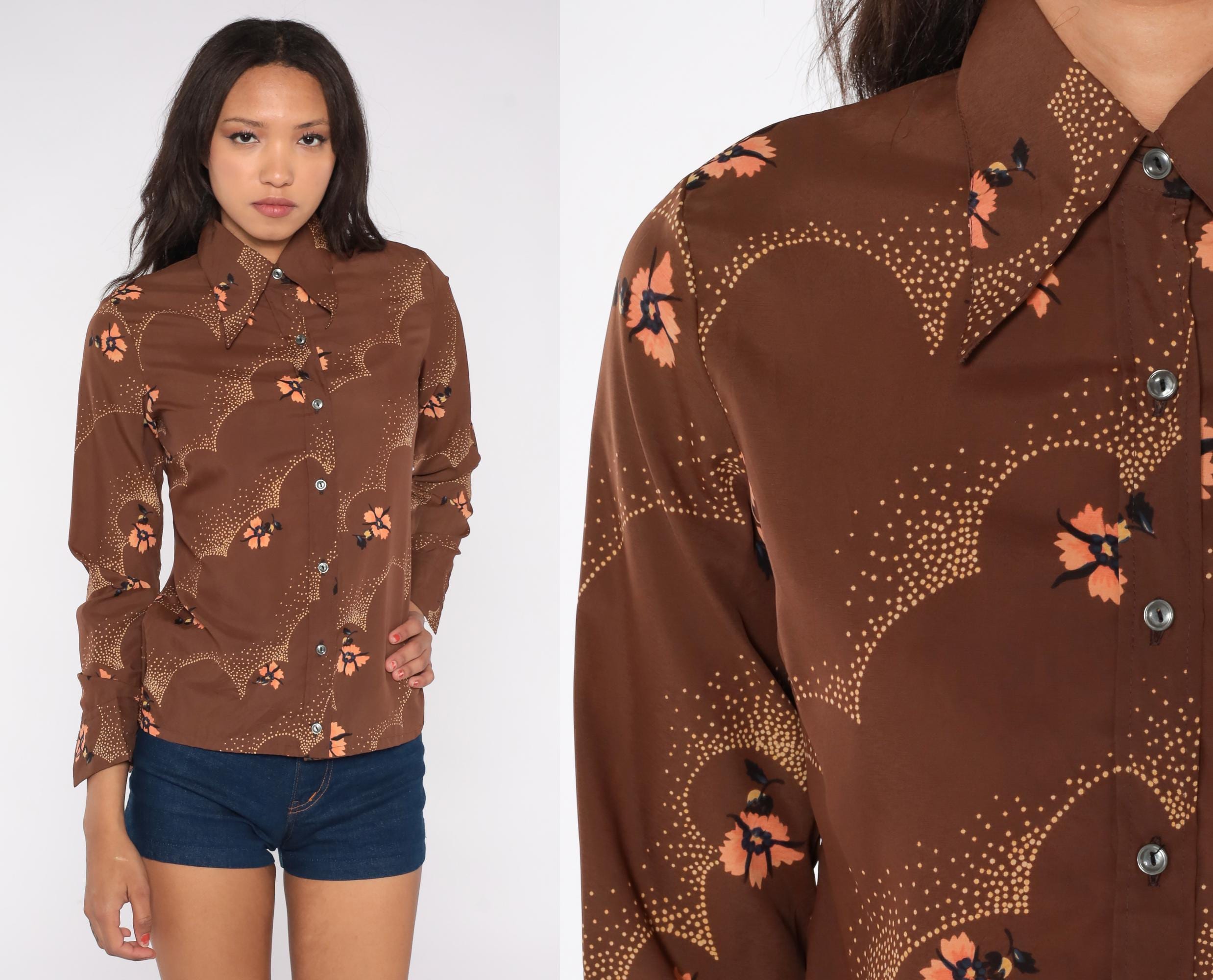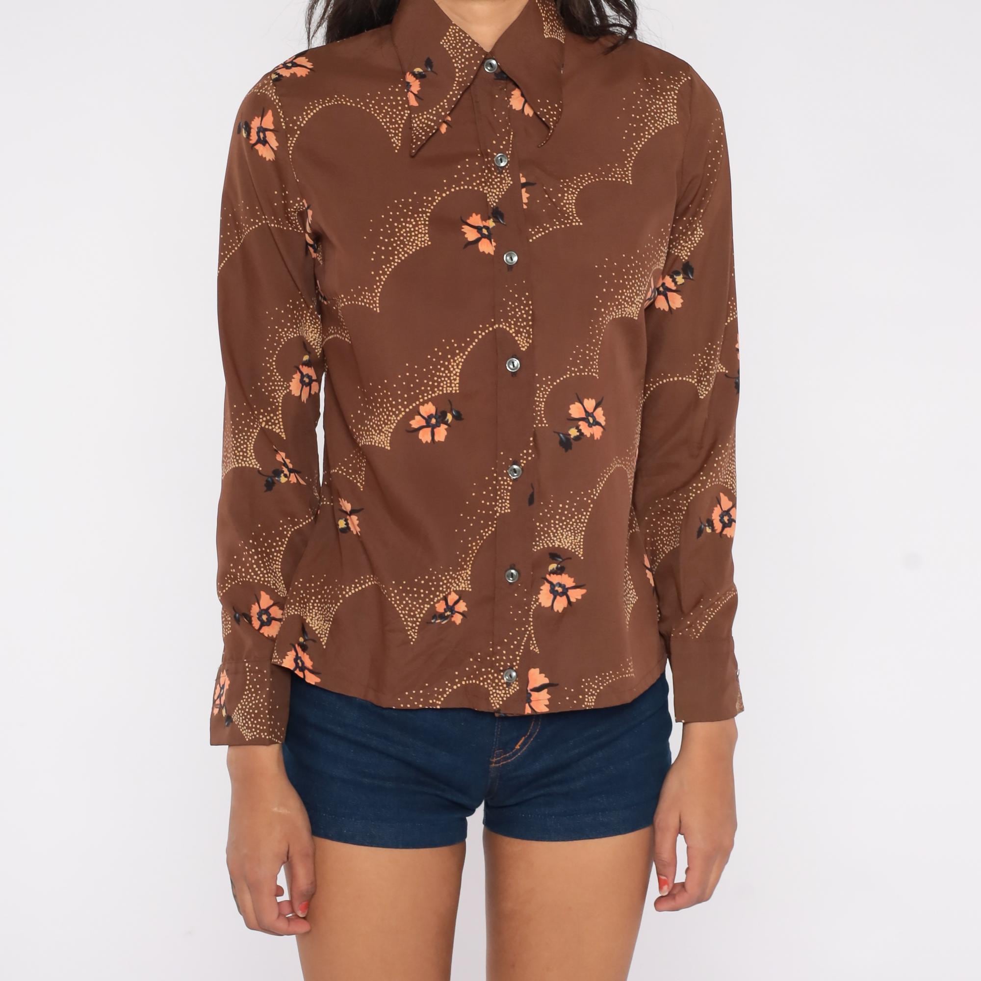 Rich chocolate brown button-down blouse with coral flower and gold dot pattern from Ecam Manifatture, circa 1970s. Features distinctive pointed collar, pearl-like buttons, and long sleeves with button cuffs.