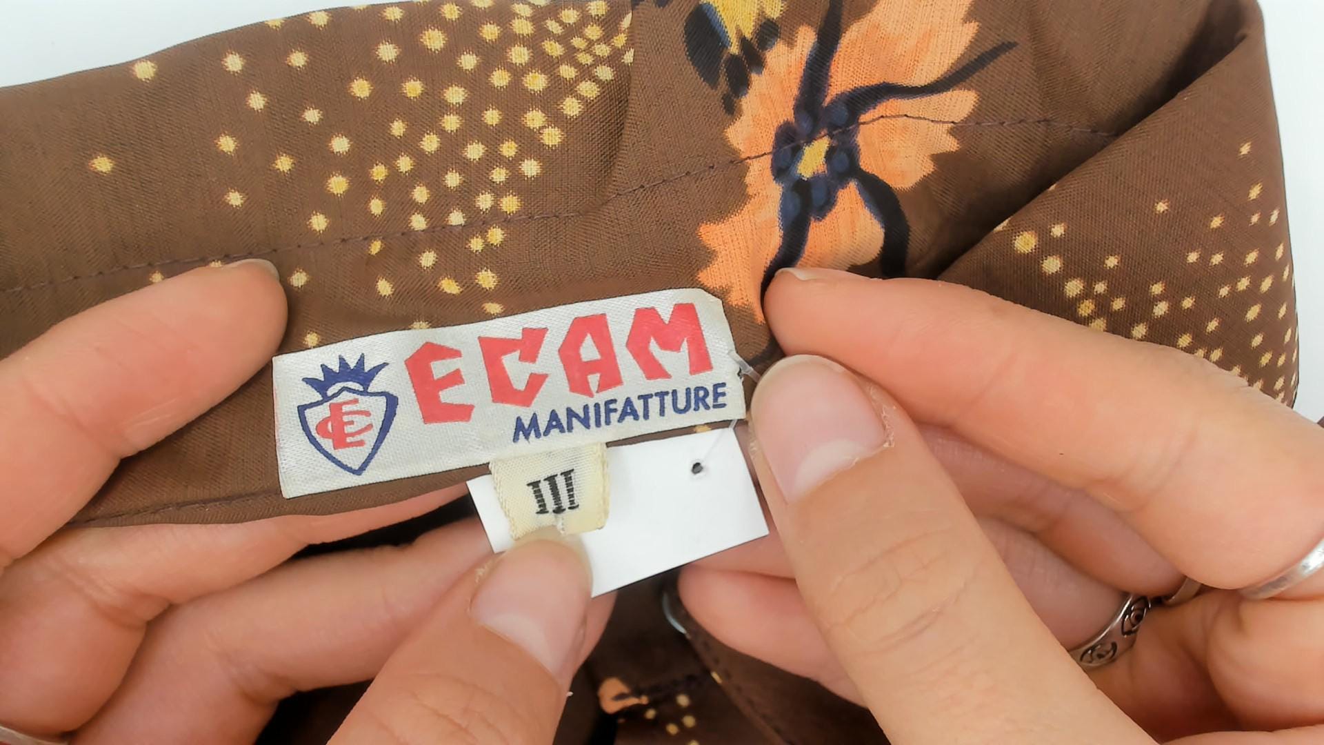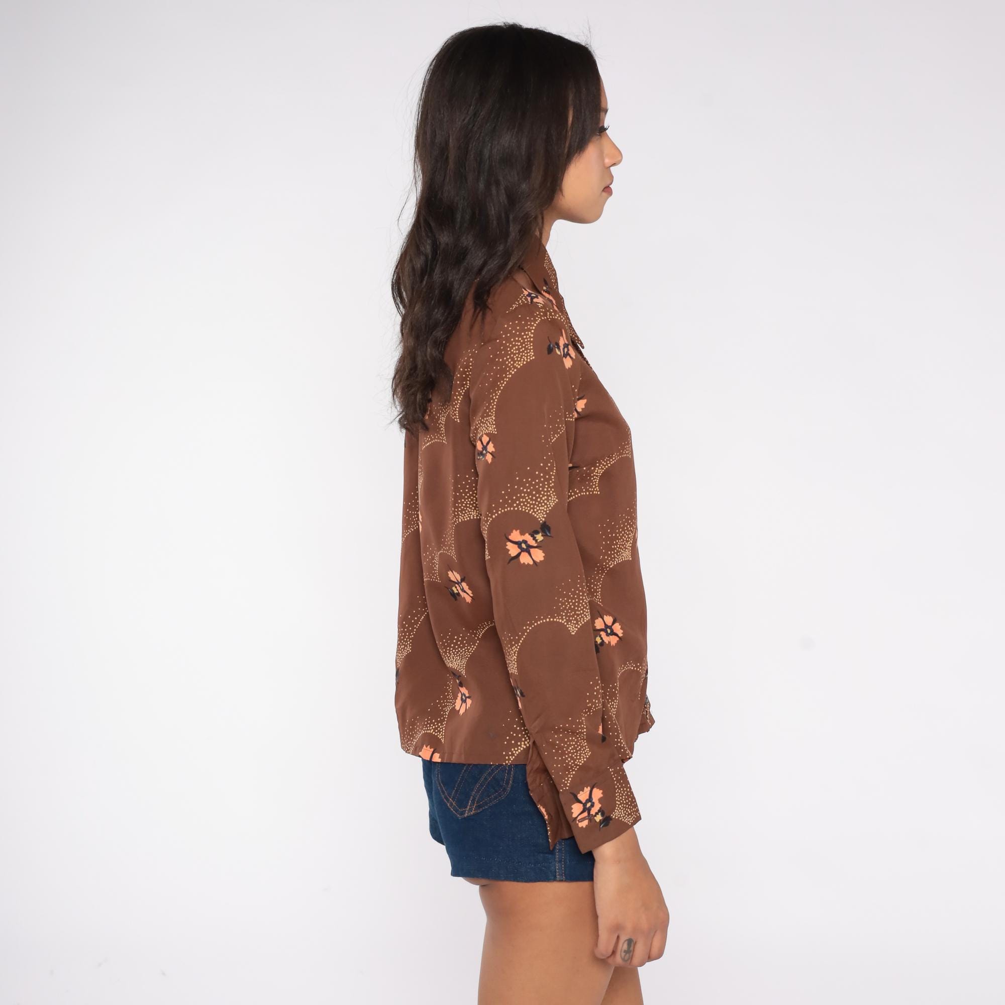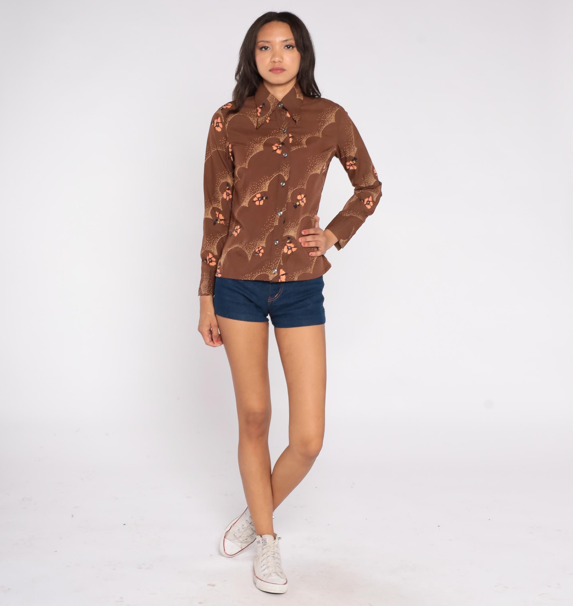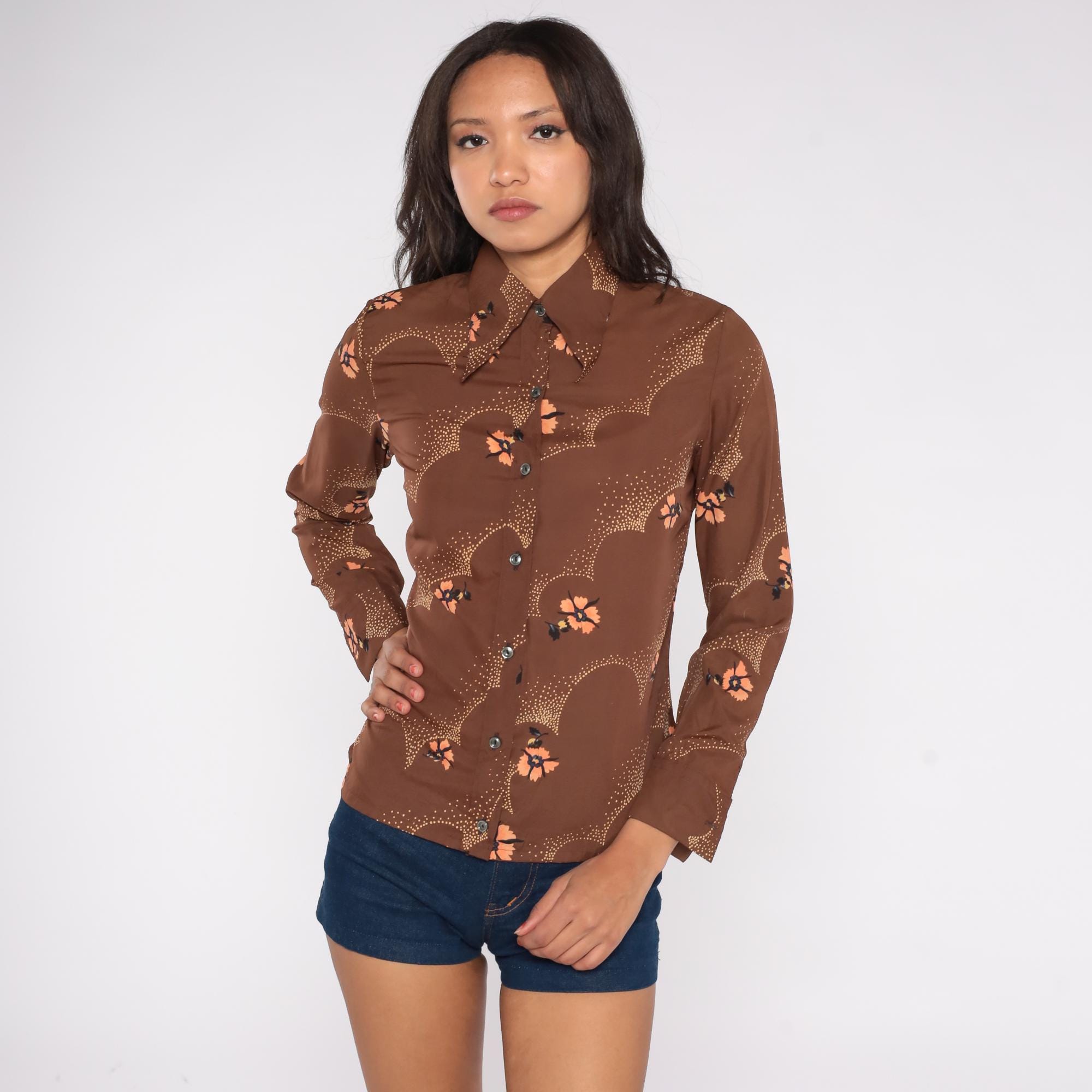 Rich chocolate brown button-down blouse with coral flower and gold dot pattern from Ecam Manifatture, circa 1970s. Features distinctive pointed collar, pearl-like buttons, and long sleeves with button cuffs.