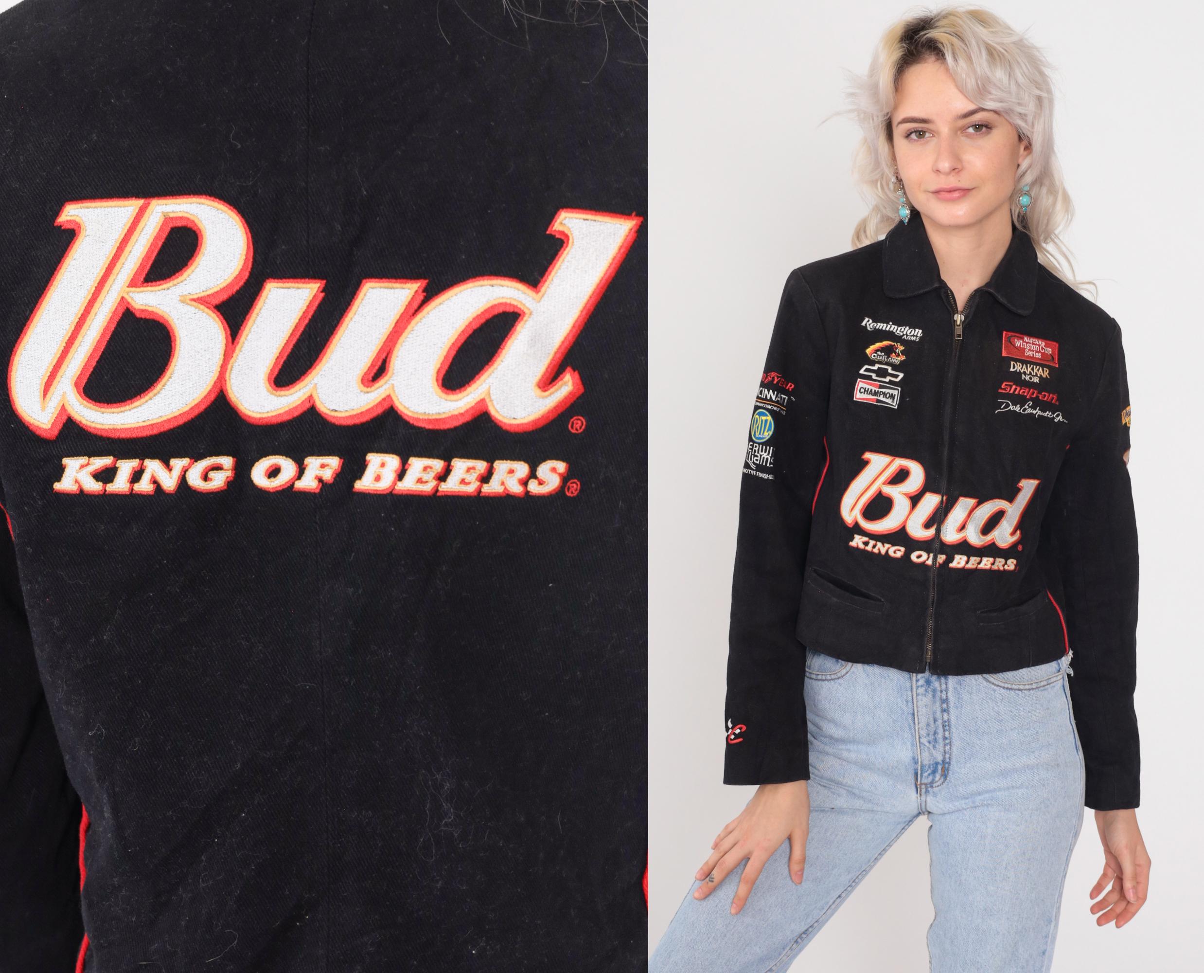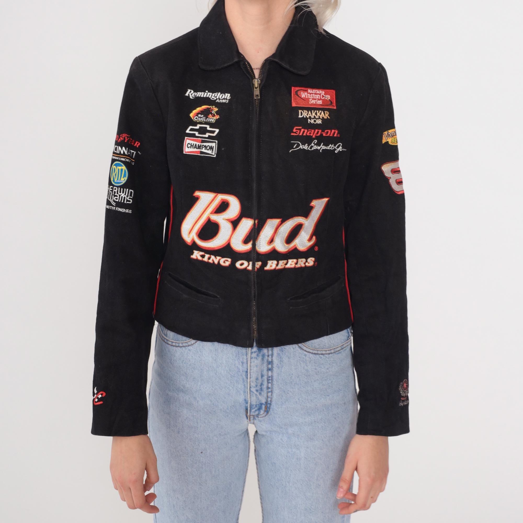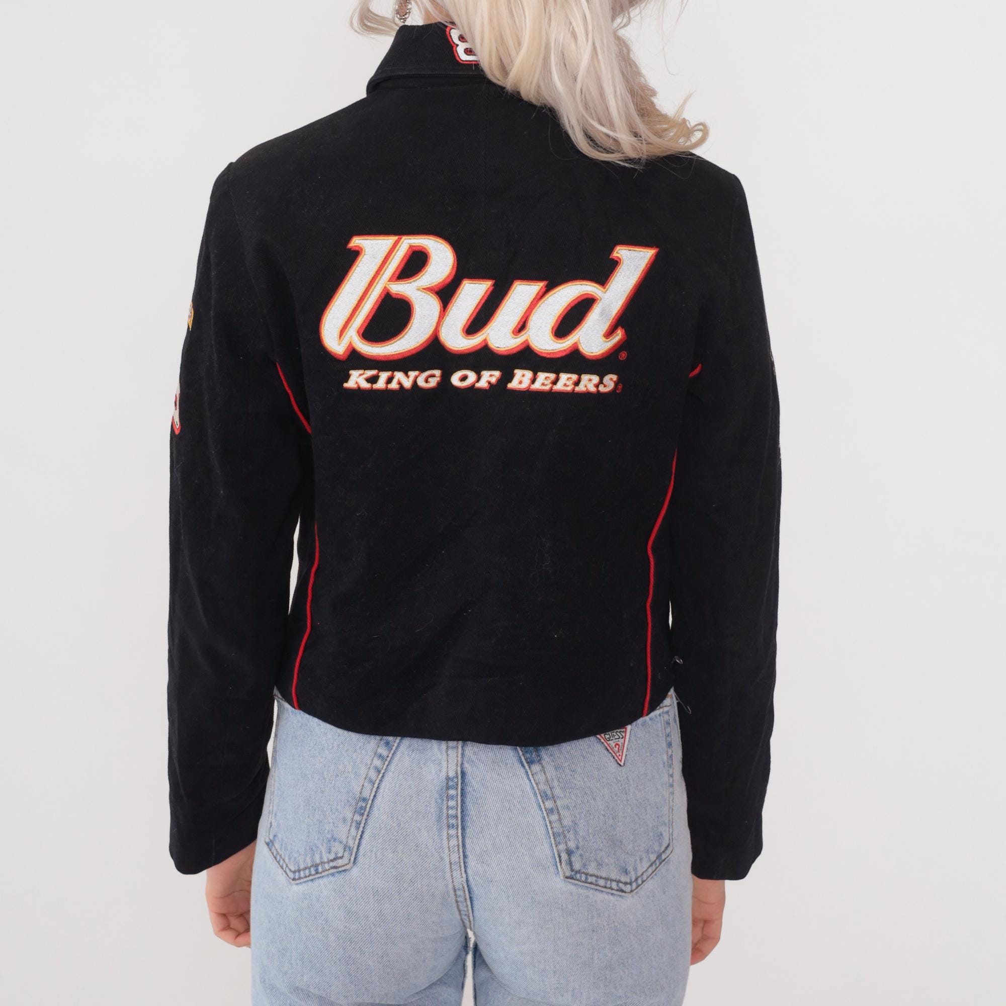 Black cotton NASCAR racing jacket from the 1990s featuring Dale Earnhardt Jr. with Budweiser King of Beers sponsorship. Large embroidered Bud logo on front and back with multiple embroidered sponsor patches. Zip front with collar, two front pockets, and red piping detail. Cropped racing jacket length. Official Chase Authentics by JH Design Group.