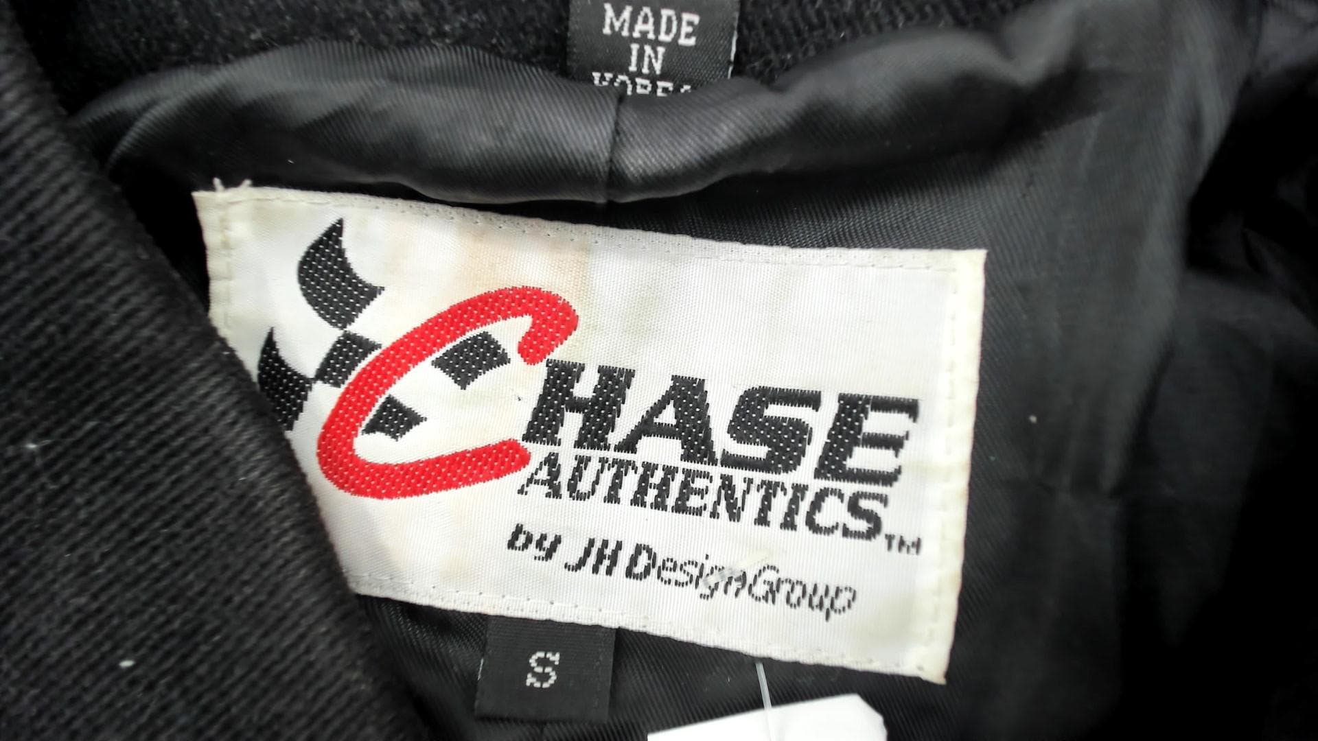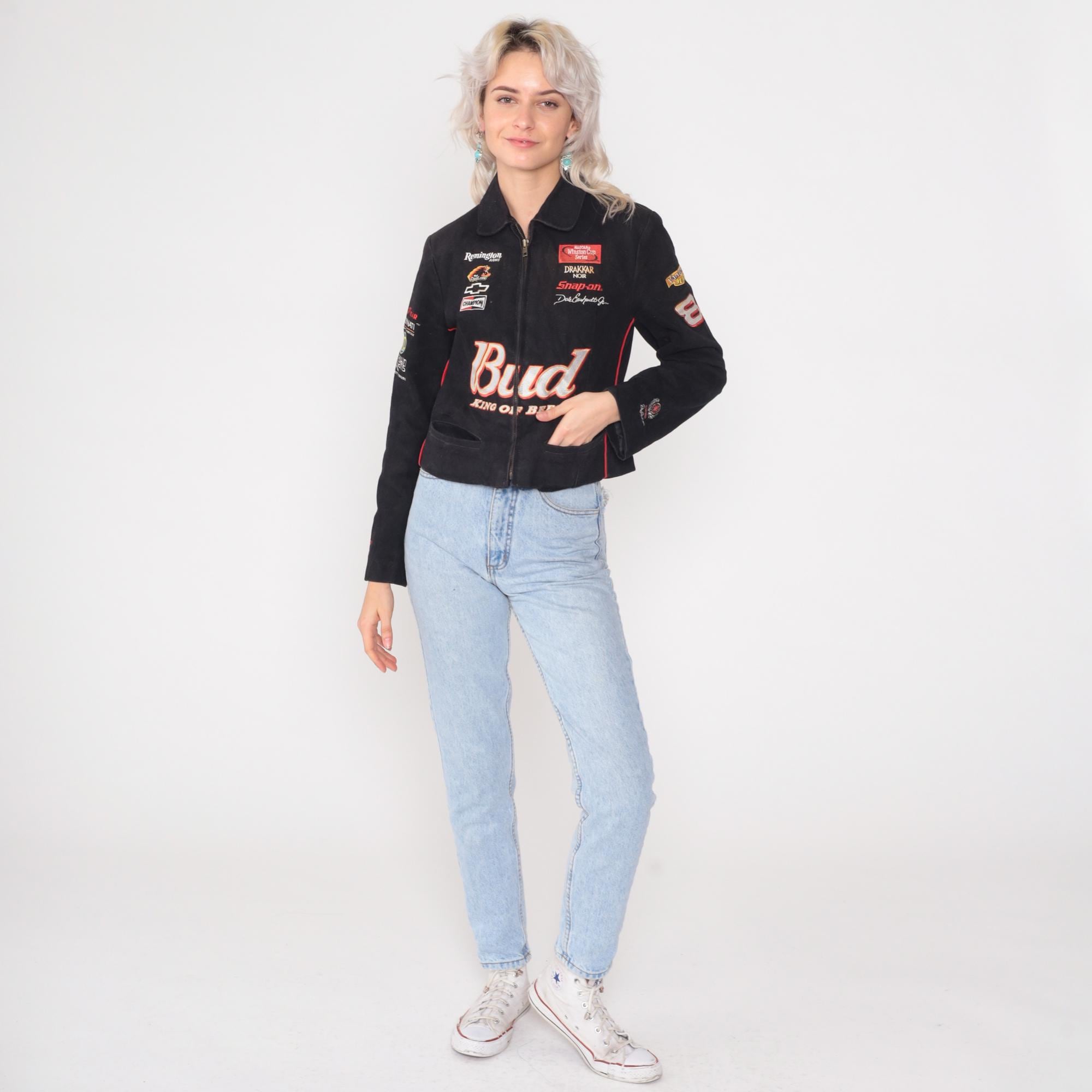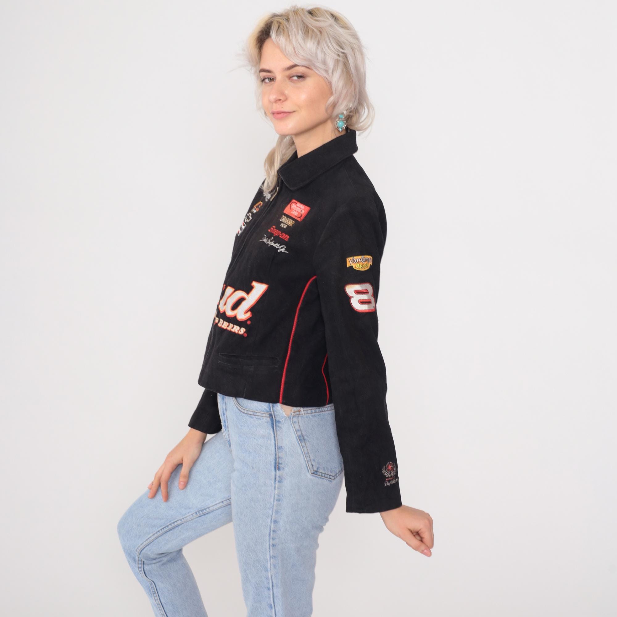 Black cotton NASCAR racing jacket from the 1990s featuring Dale Earnhardt Jr. with Budweiser King of Beers sponsorship. Large embroidered Bud logo on front and back with multiple embroidered sponsor patches. Zip front with collar, two front pockets, and red piping detail. Cropped racing jacket length. Official Chase Authentics by JH Design Group.