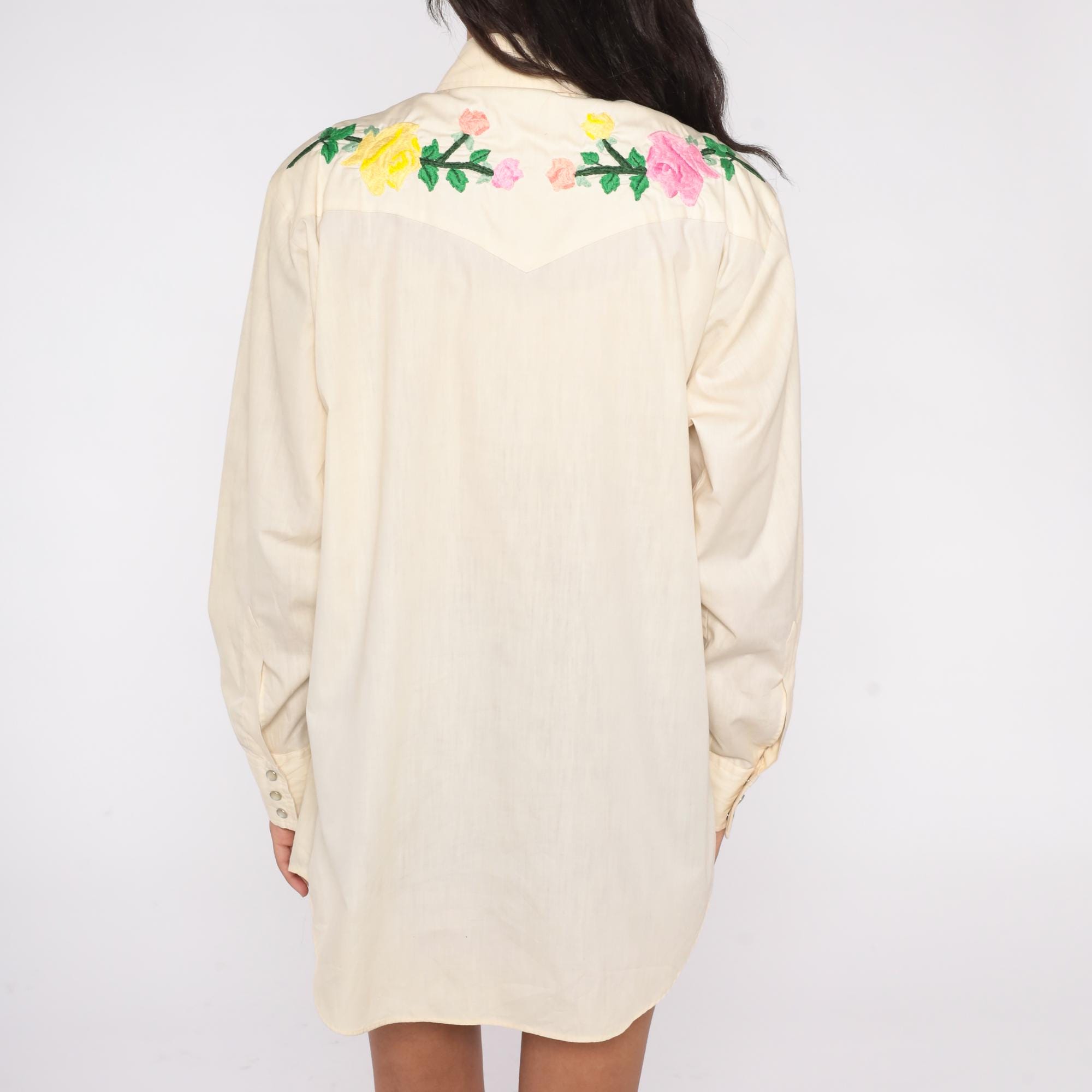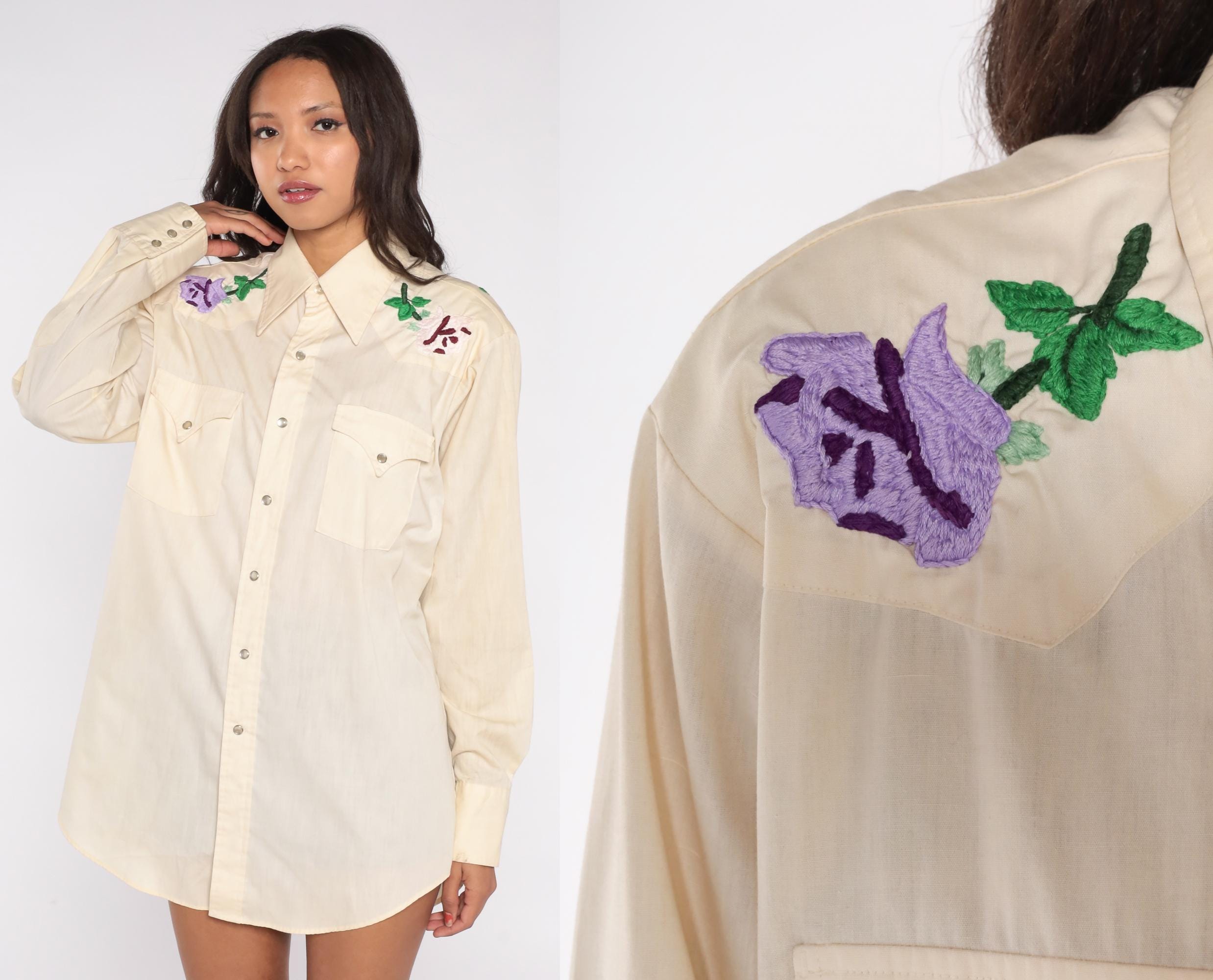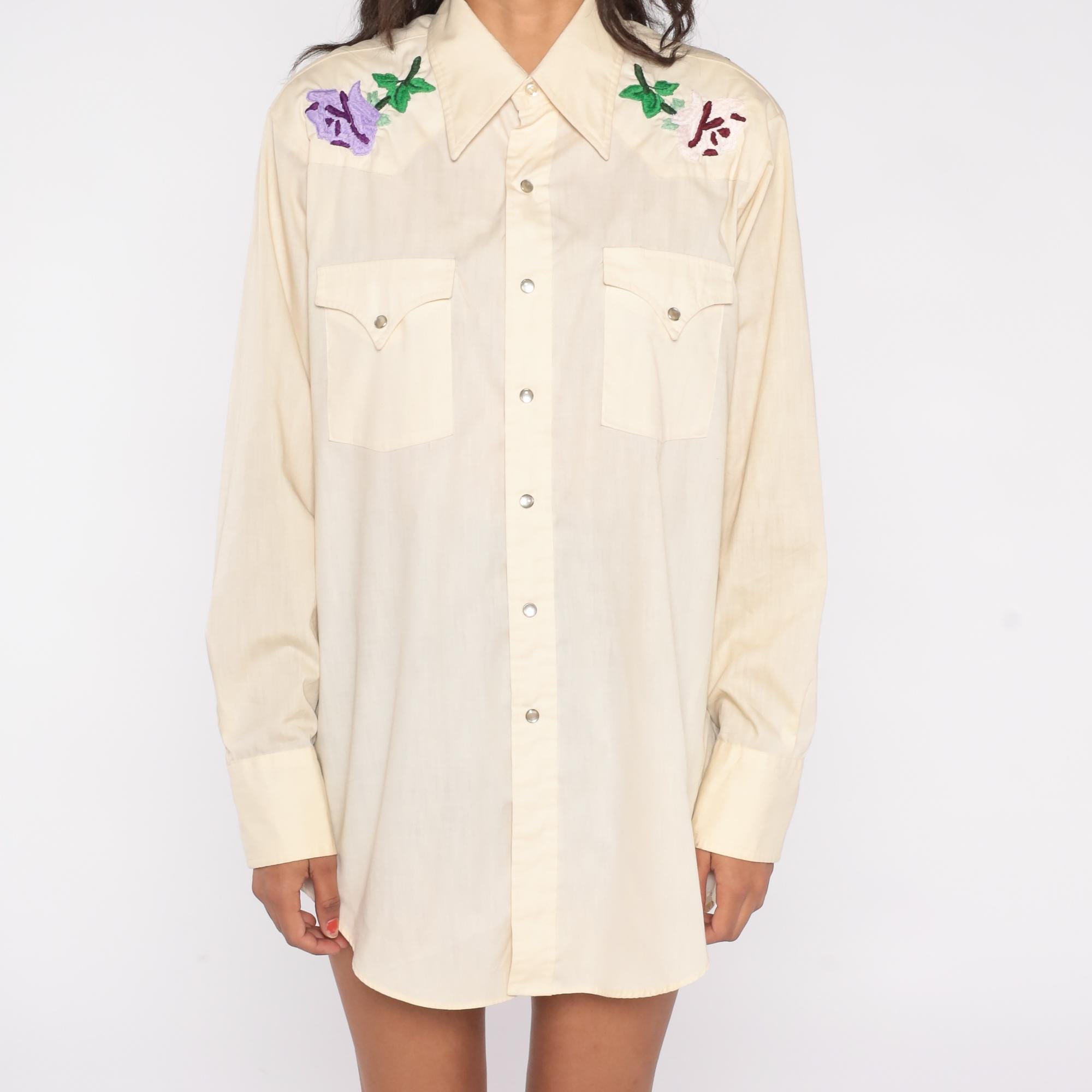 Stunning cream western shirt with beautiful floral embroidery from Lee Authentic Western, circa 1970s. Features purple, pink, and yellow roses with green leaves embroidered on shoulders and upper back yoke.