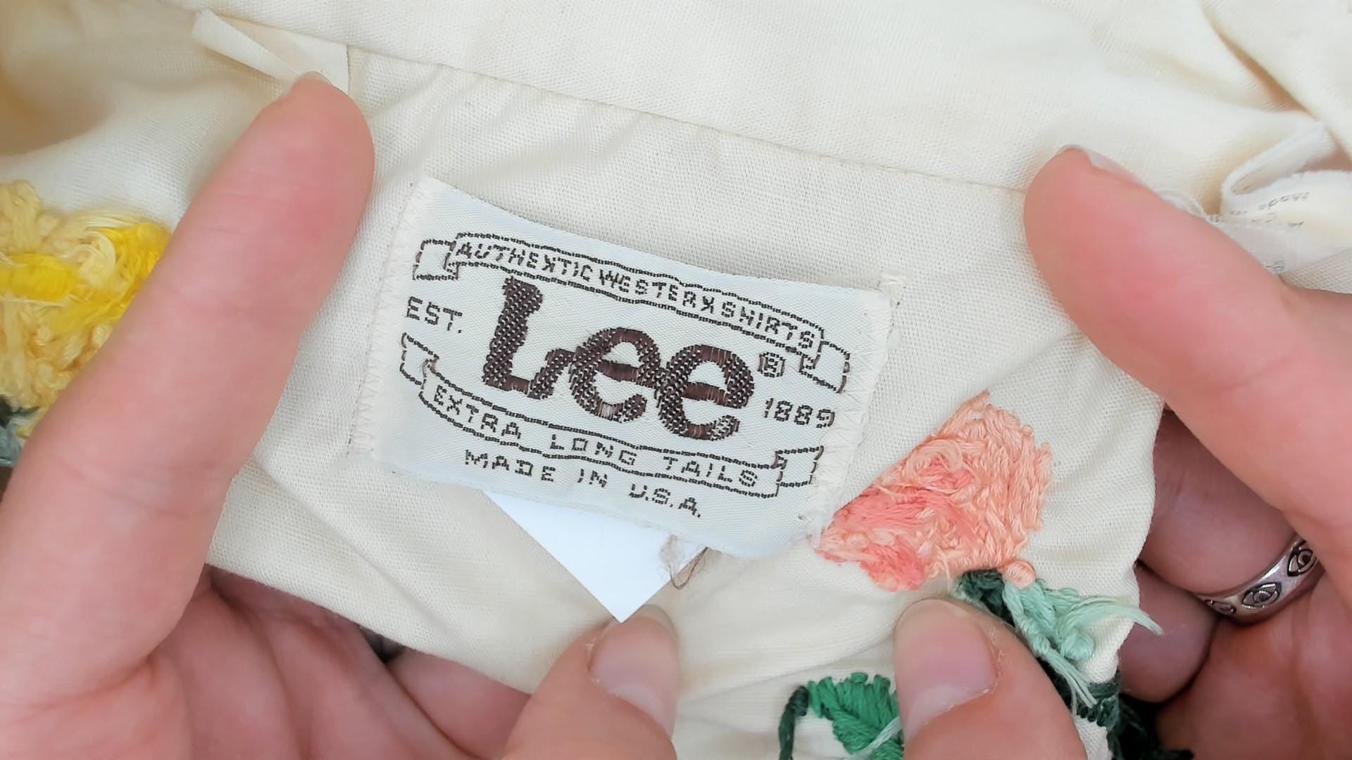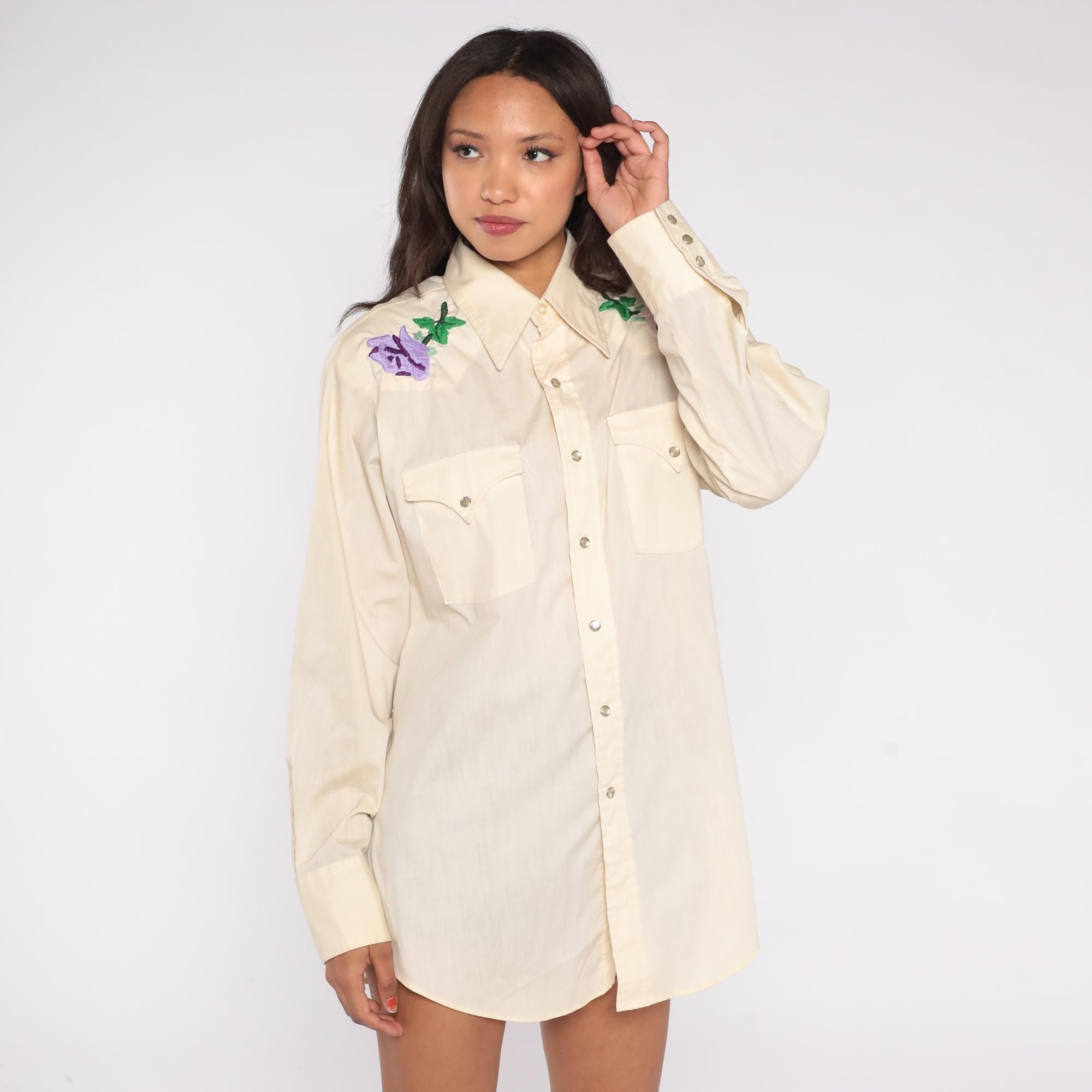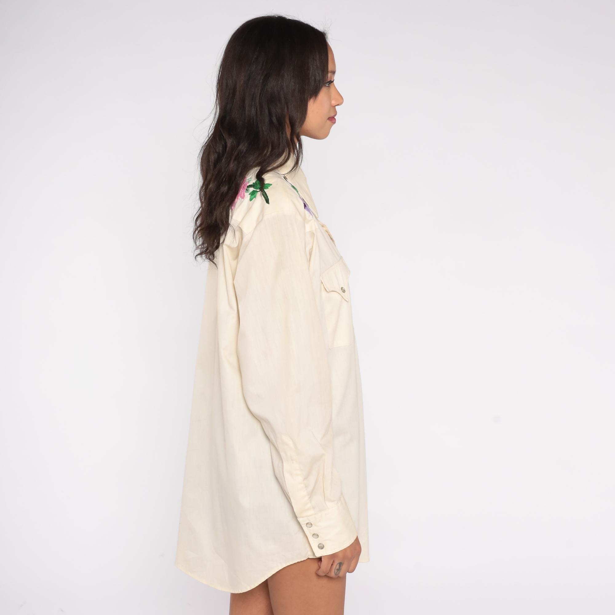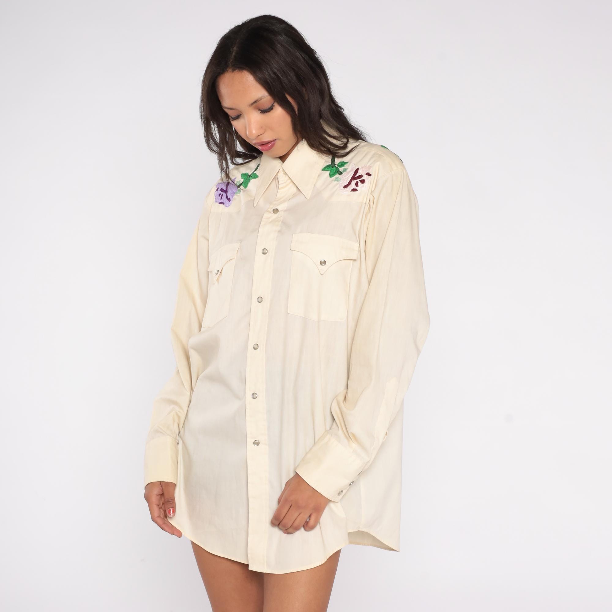 Stunning cream western shirt with beautiful floral embroidery from Lee Authentic Western, circa 1970s. Features purple, pink, and yellow roses with green leaves embroidered on shoulders and upper back yoke.