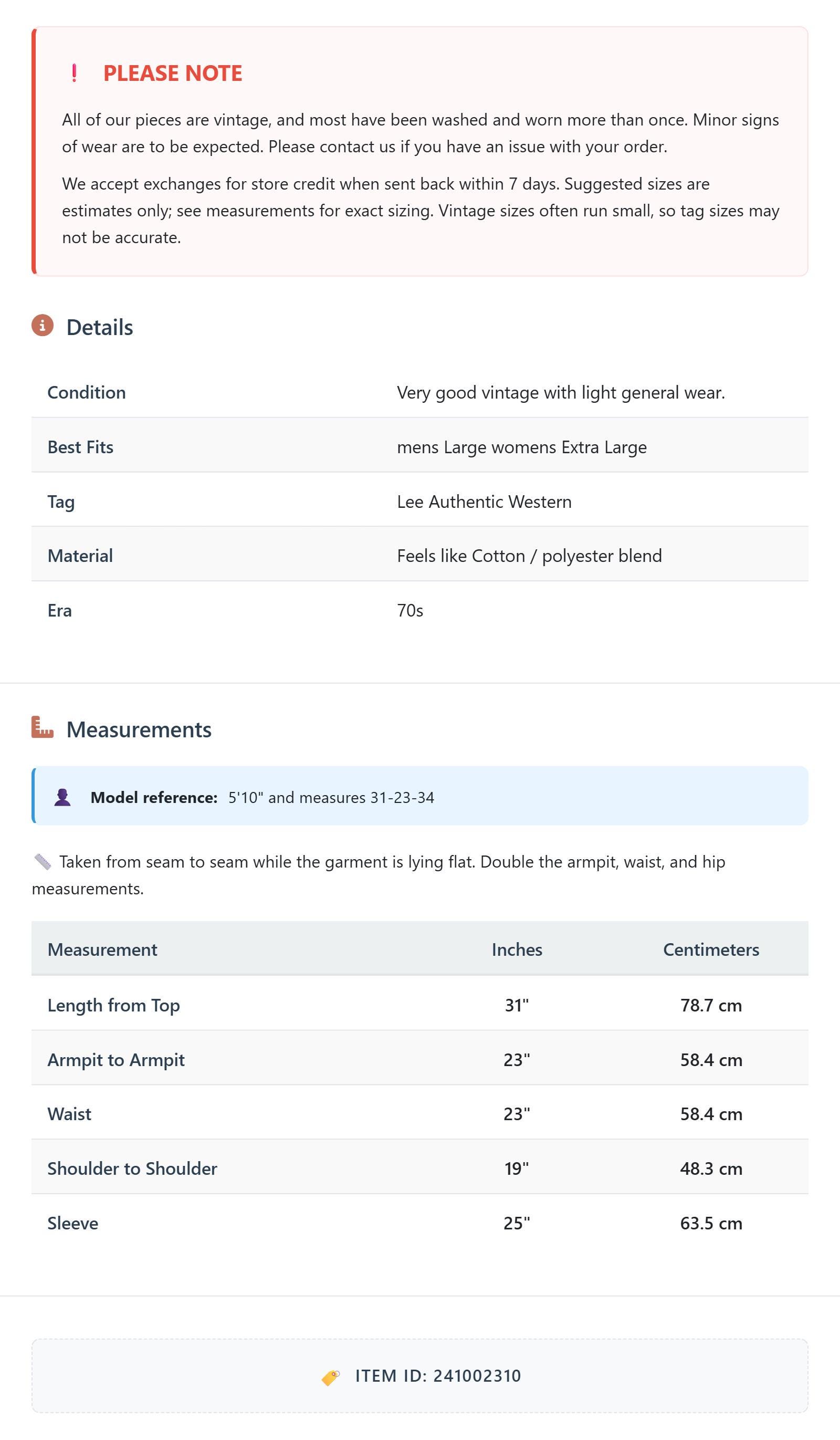 All of our pieces are vintage, and most have been washed and worn more than once. Minor signs of wear are to be expected. Please contact us if you have an issue with your order. We accept exchanges for store credit when sent back within 7 days.