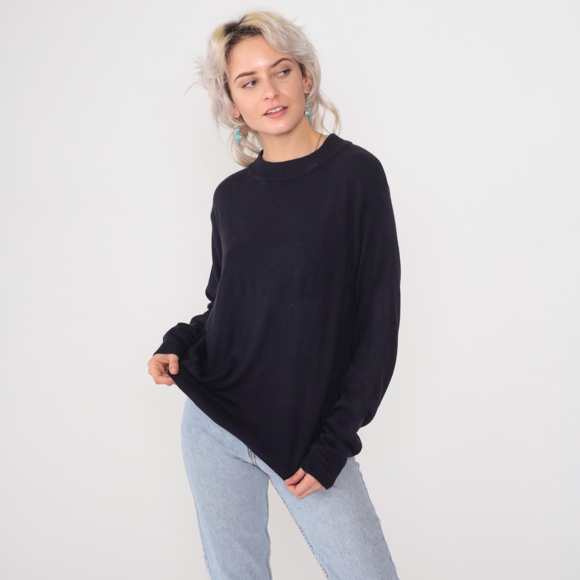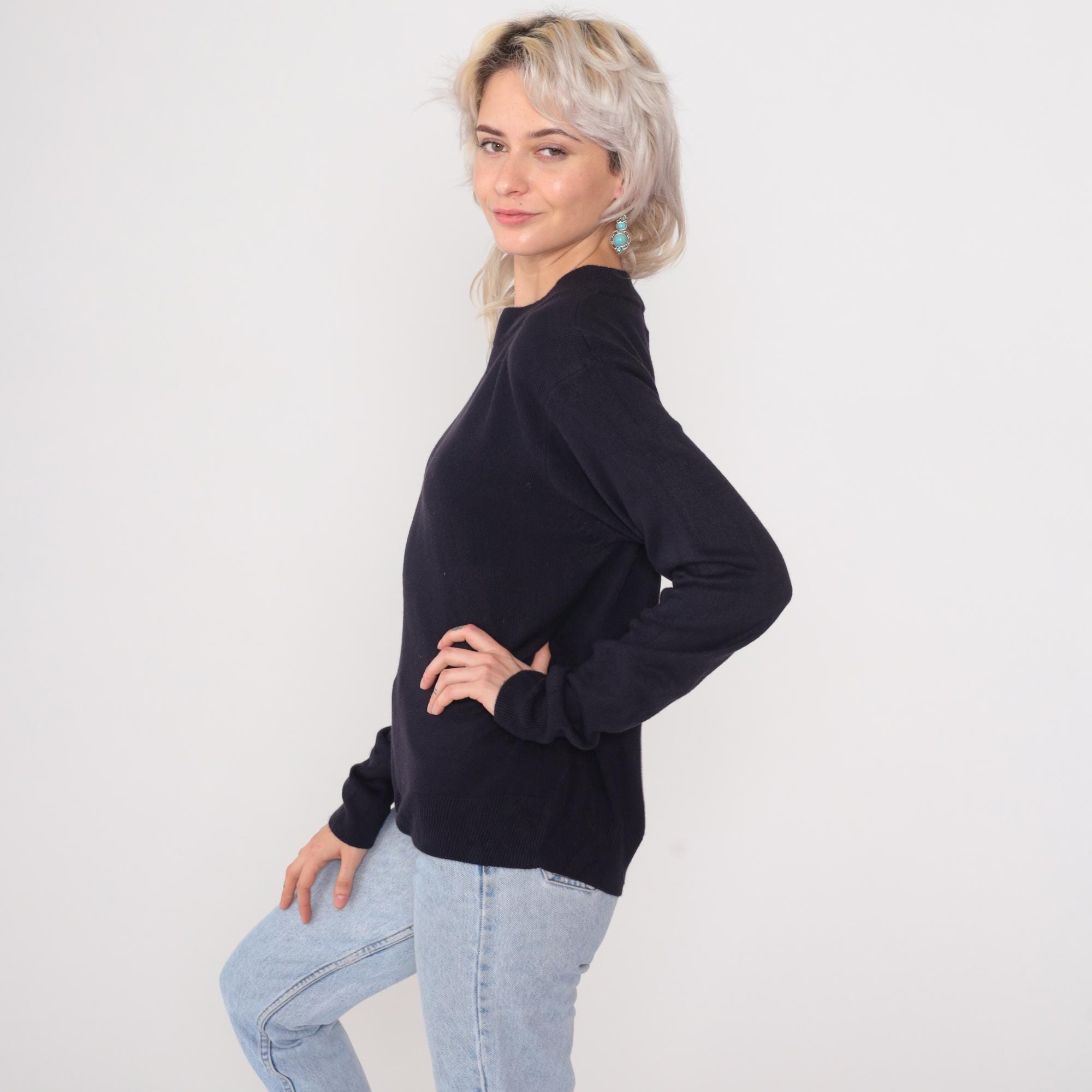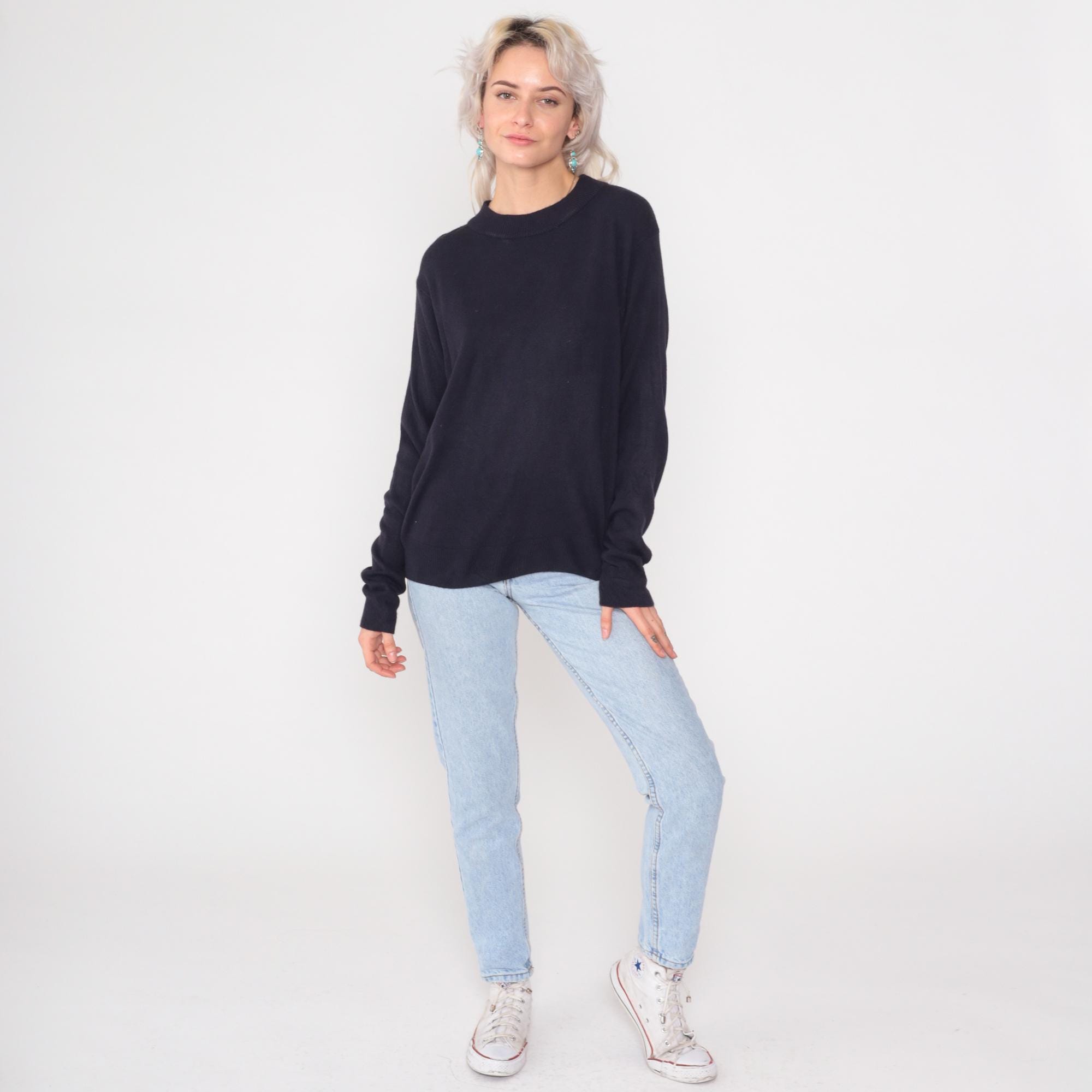 Black crew neck sweater from the 1990s. Features ribbed crew neck, cuffs, and hem with long sleeves and drop shoulders. Simple oversized slouchy fit.