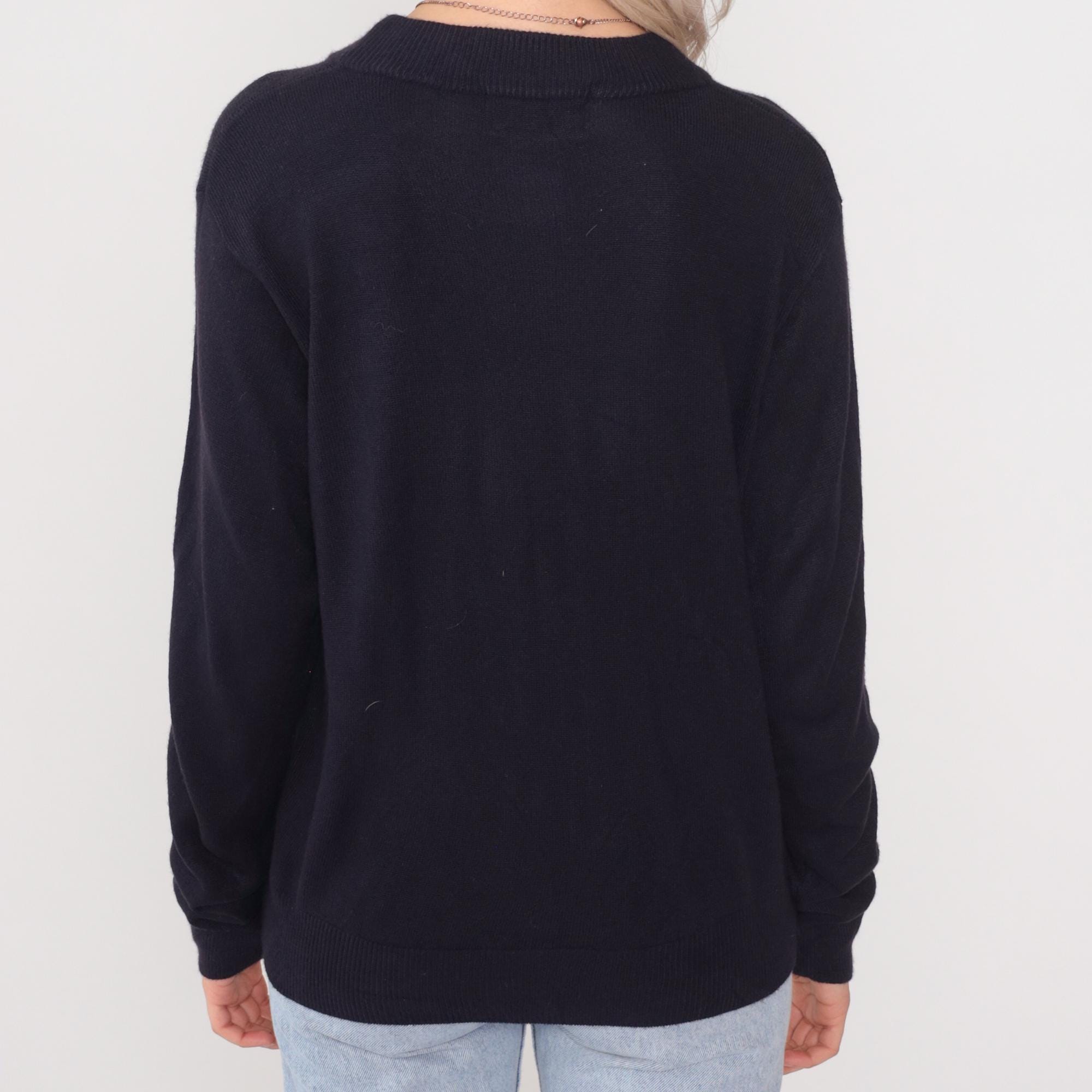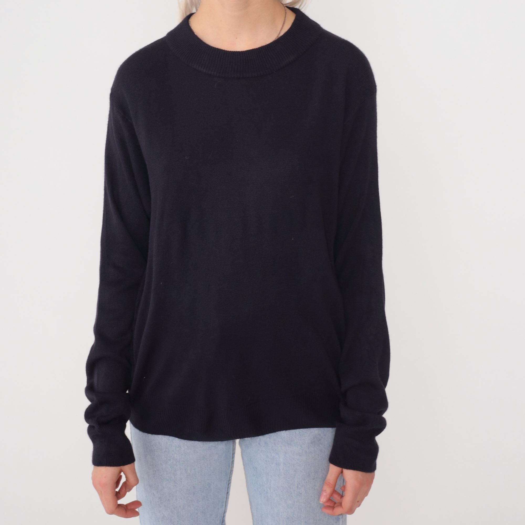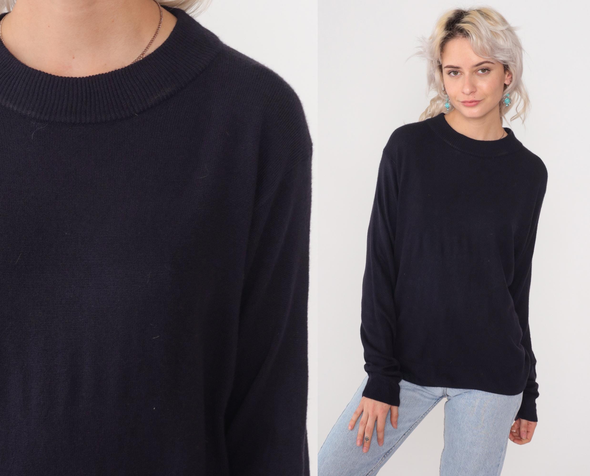 Black crew neck sweater from the 1990s. Features ribbed crew neck, cuffs, and hem with long sleeves and drop shoulders. Simple oversized slouchy fit.