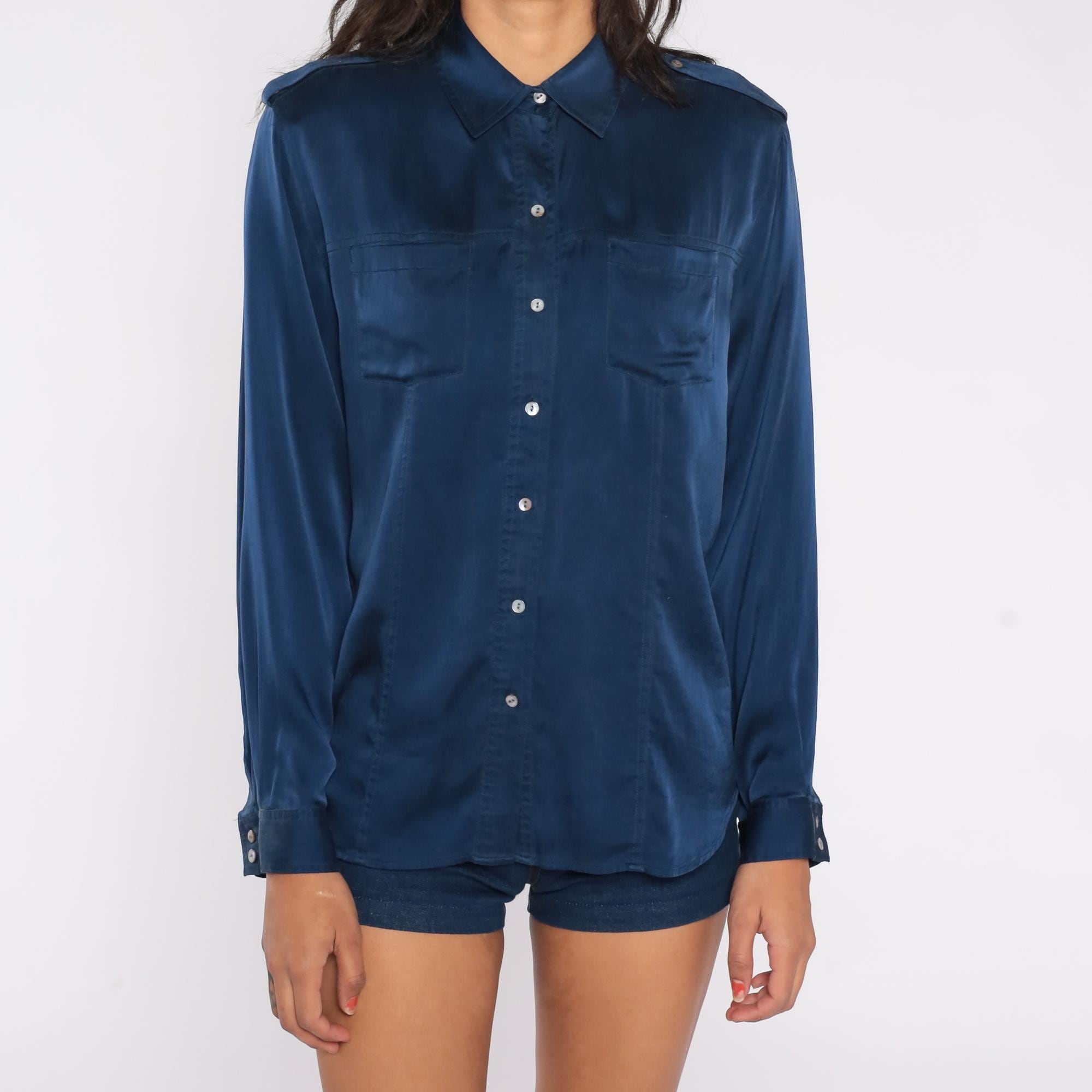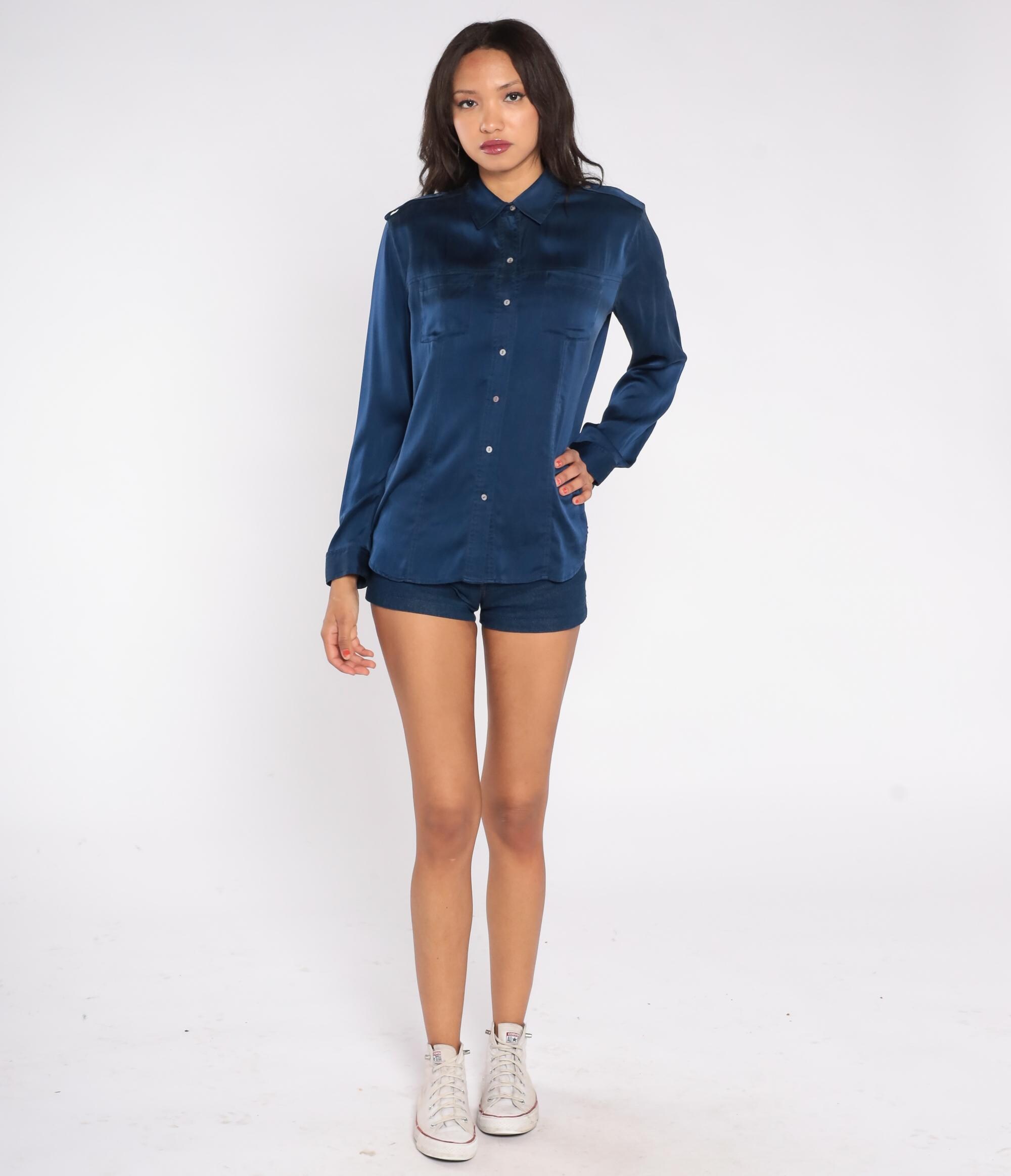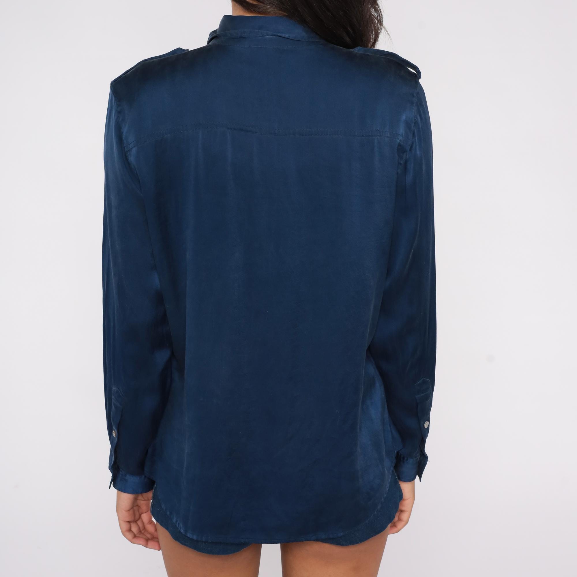 Luxurious navy blue button-down shirt in silky fabric, circa 1990s. Features military-inspired styling with epaulets (shoulder tabs), pointed collar, and front patch pockets.
