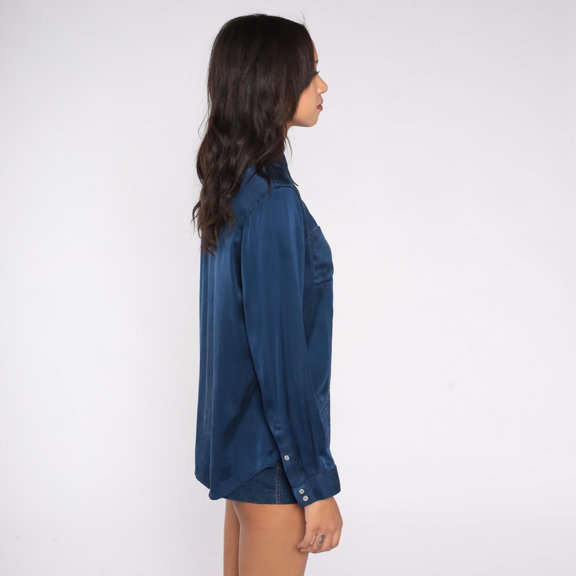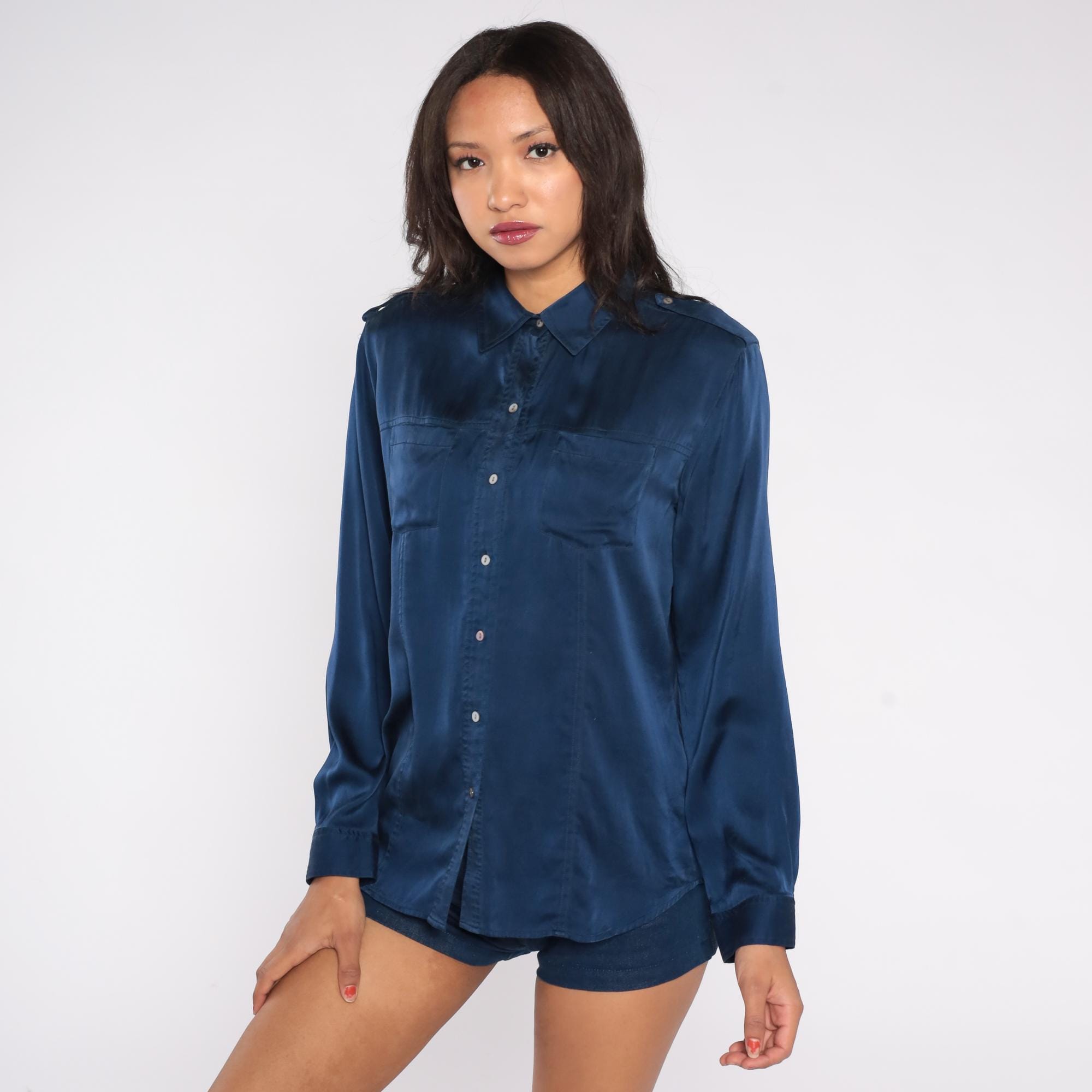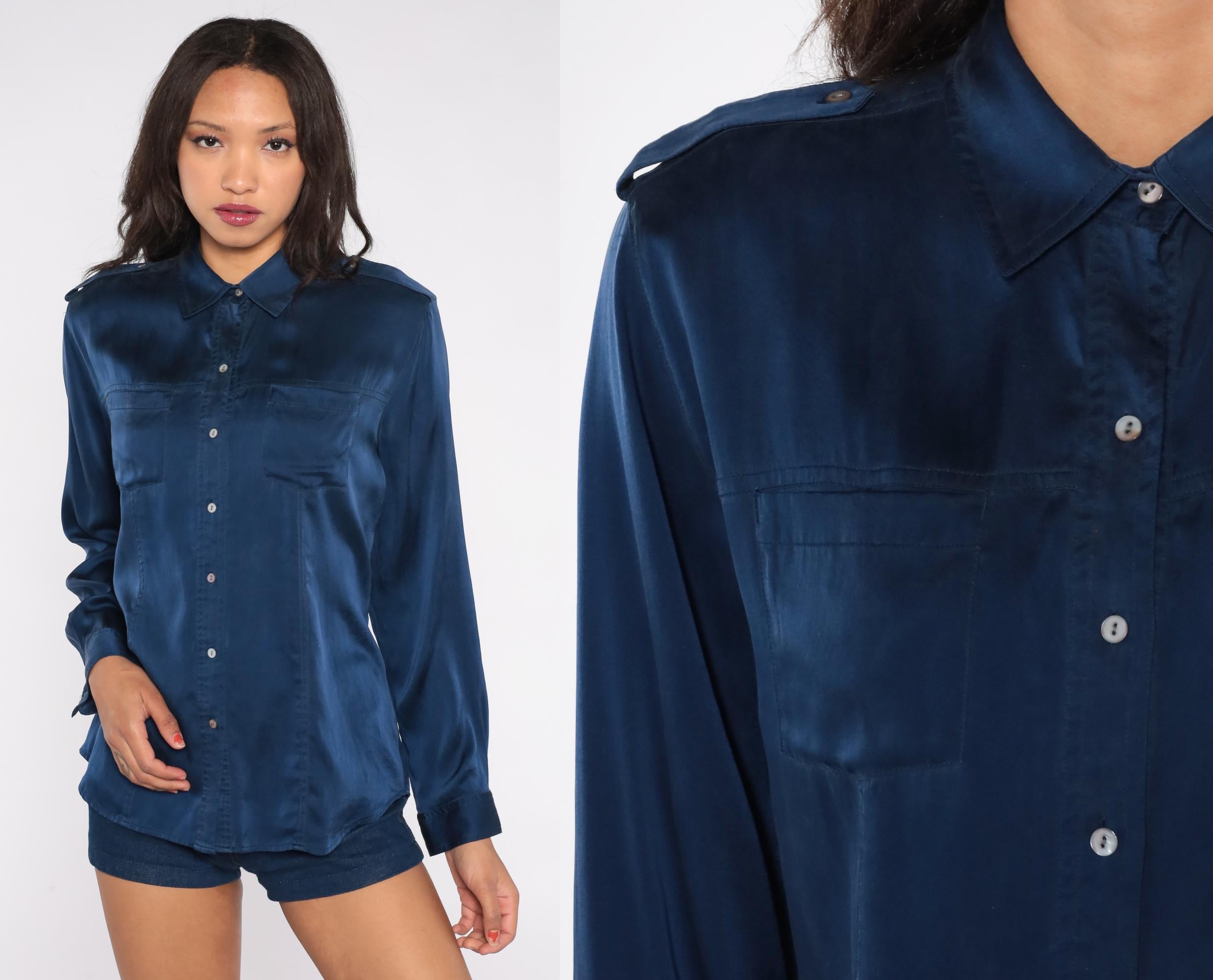 Luxurious navy blue button-down shirt in silky fabric, circa 1990s. Features military-inspired styling with epaulets (shoulder tabs), pointed collar, and front patch pockets.