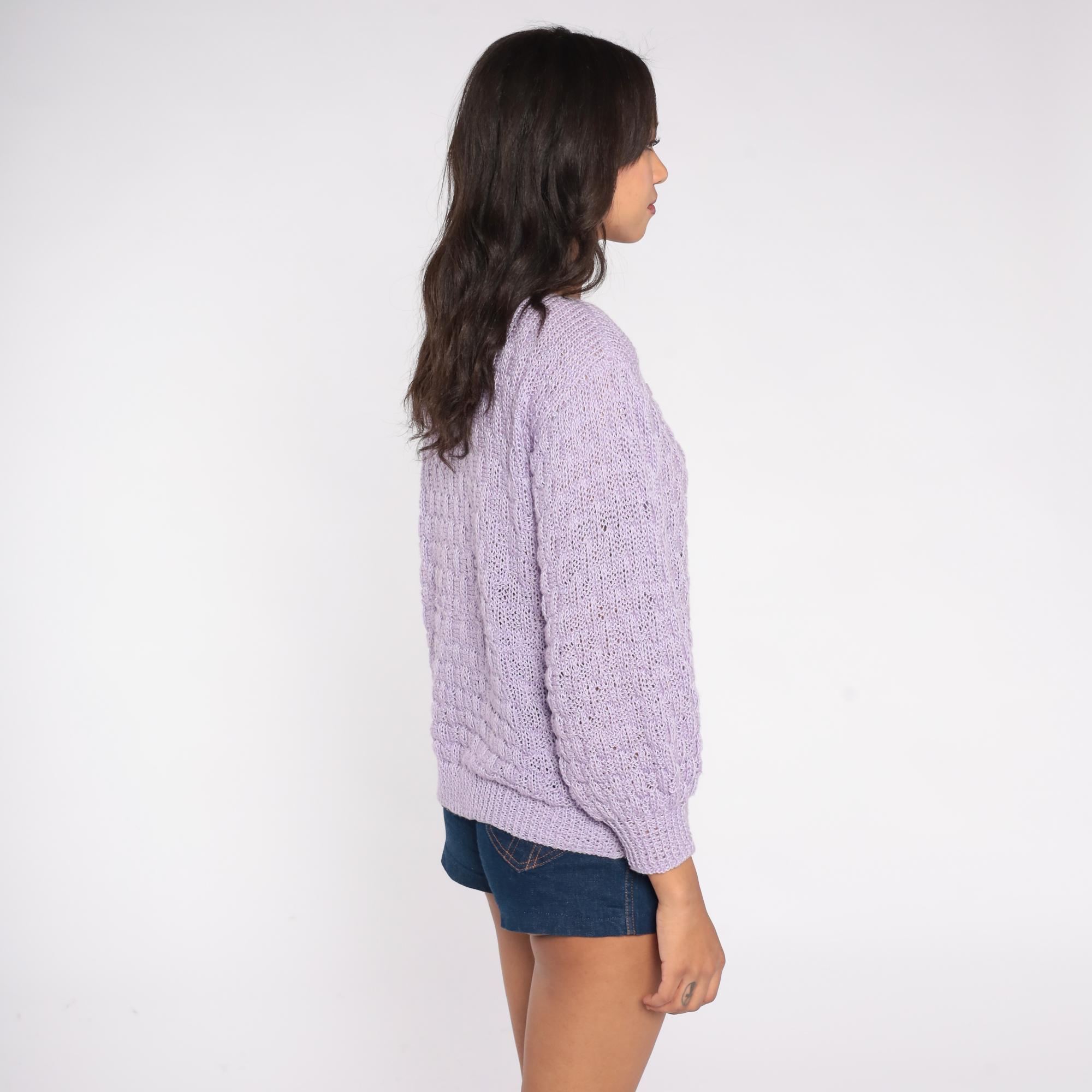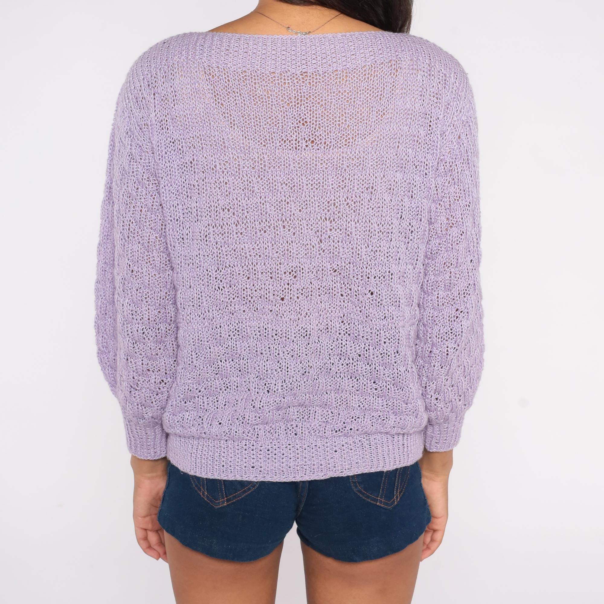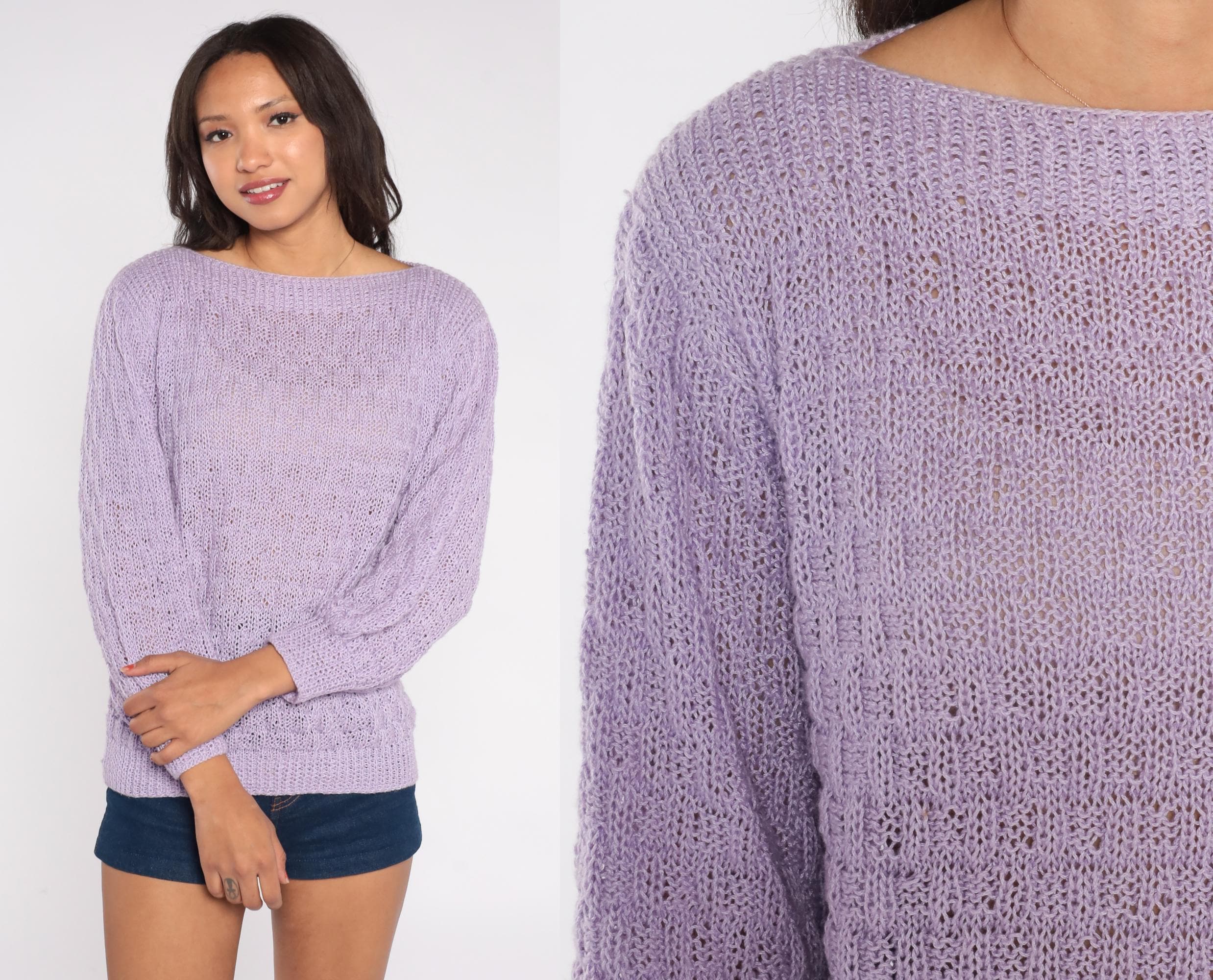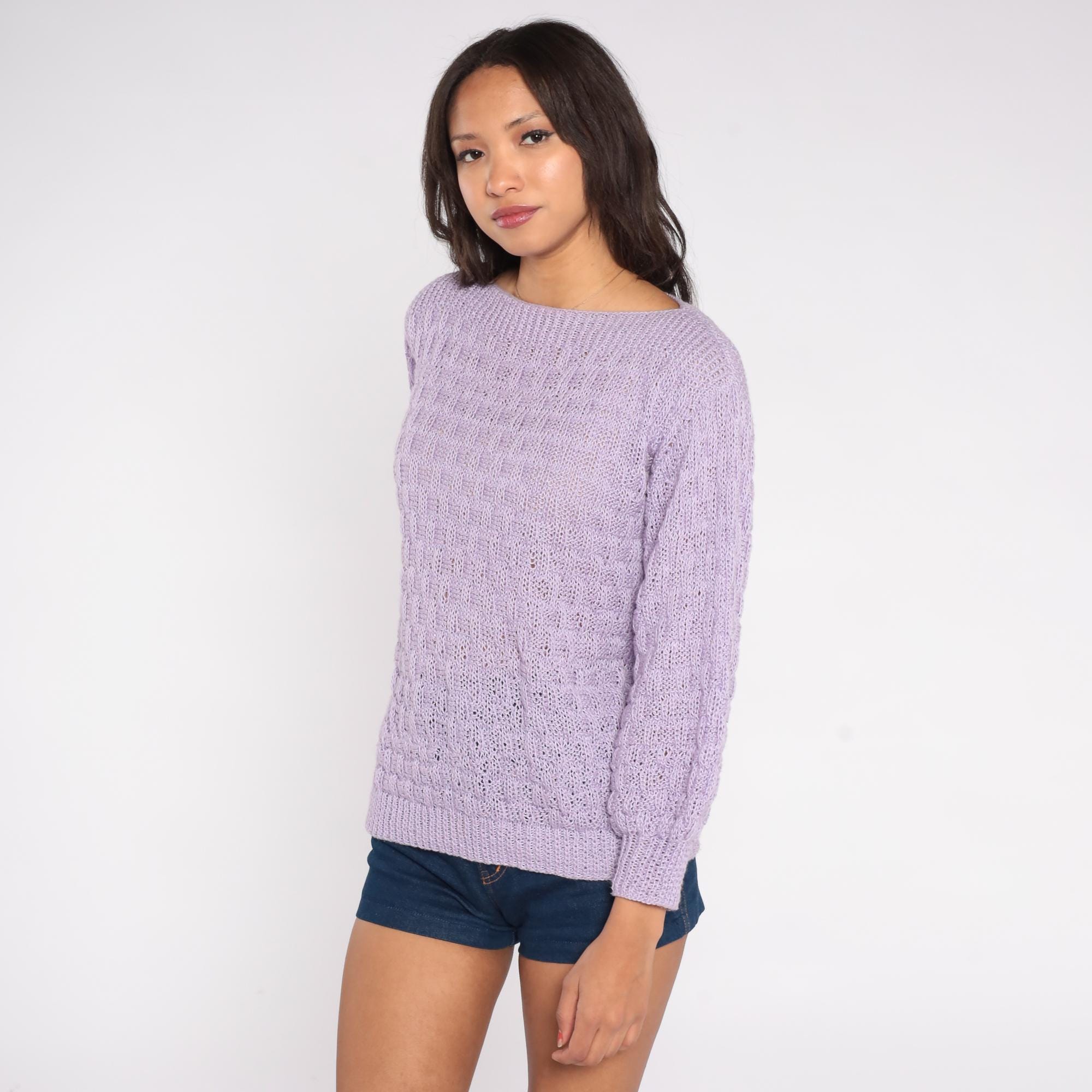 1980s lavender knit sweater featuring a loose open weave with a soft textured finish. This pullover has a crew neckline, long sleeves, and ribbed trim at the cuffs and hem.