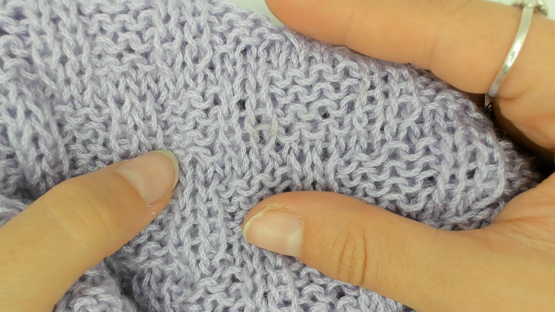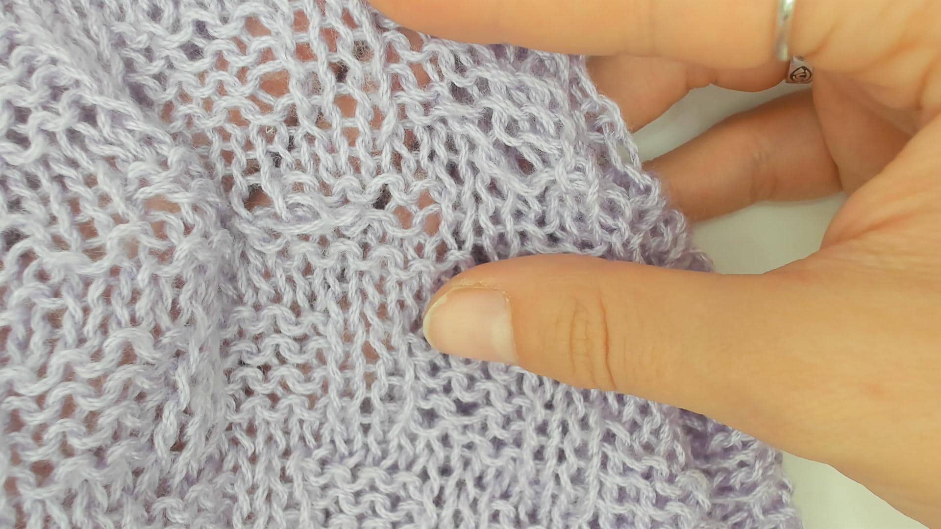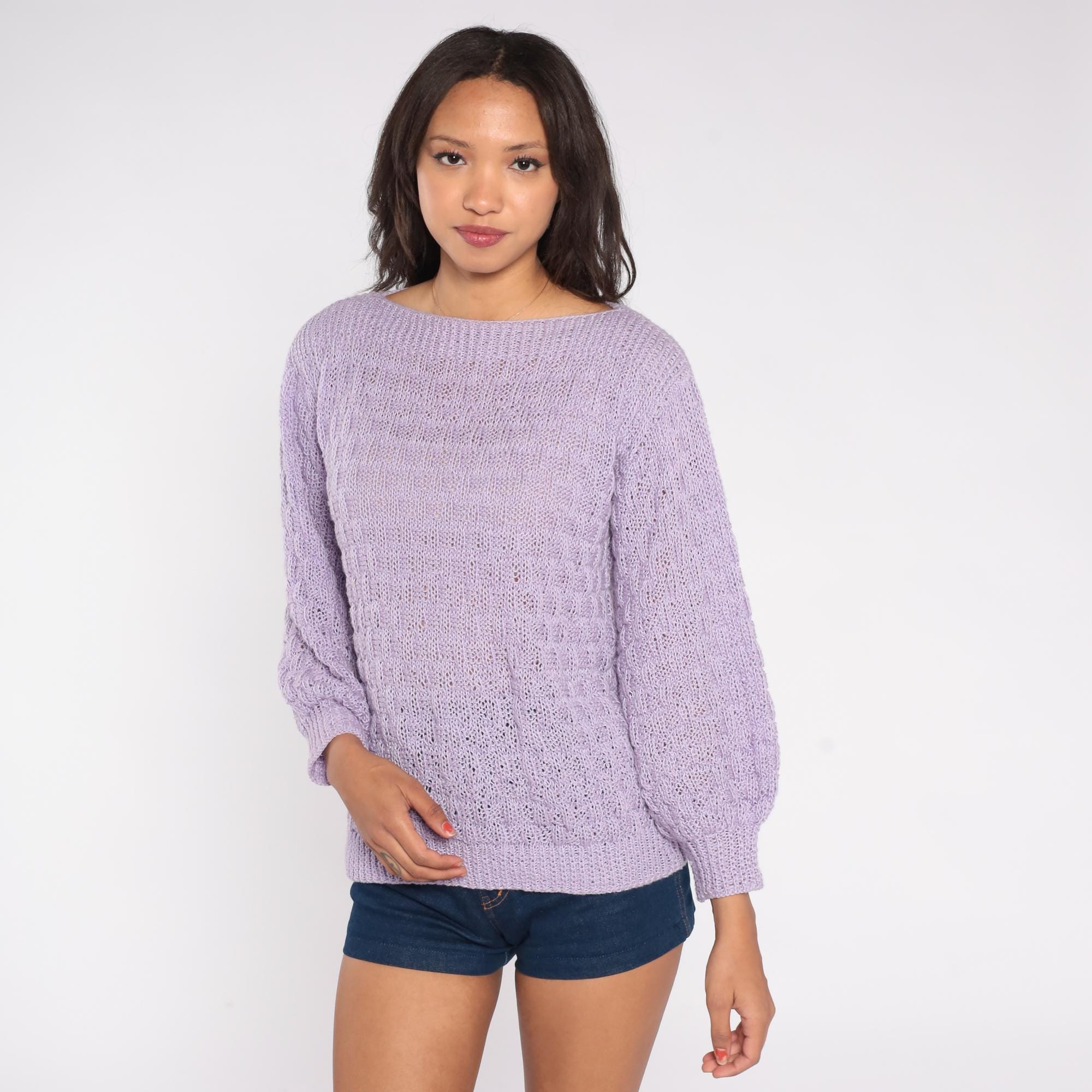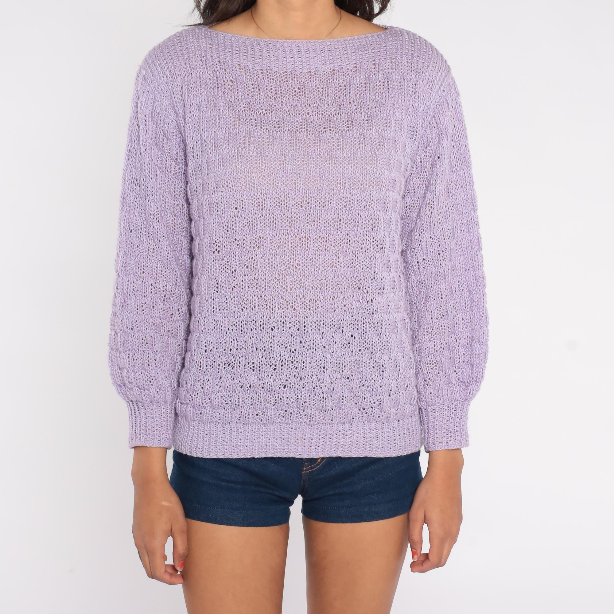 1980s lavender knit sweater featuring a loose open weave with a soft textured finish. This pullover has a crew neckline, long sleeves, and ribbed trim at the cuffs and hem.