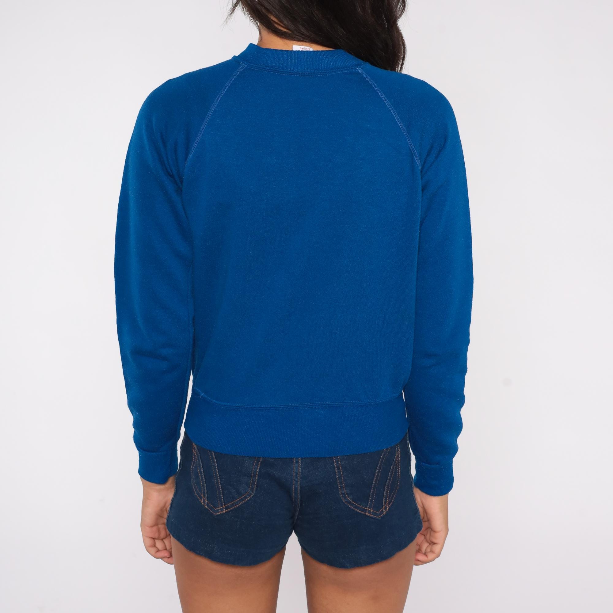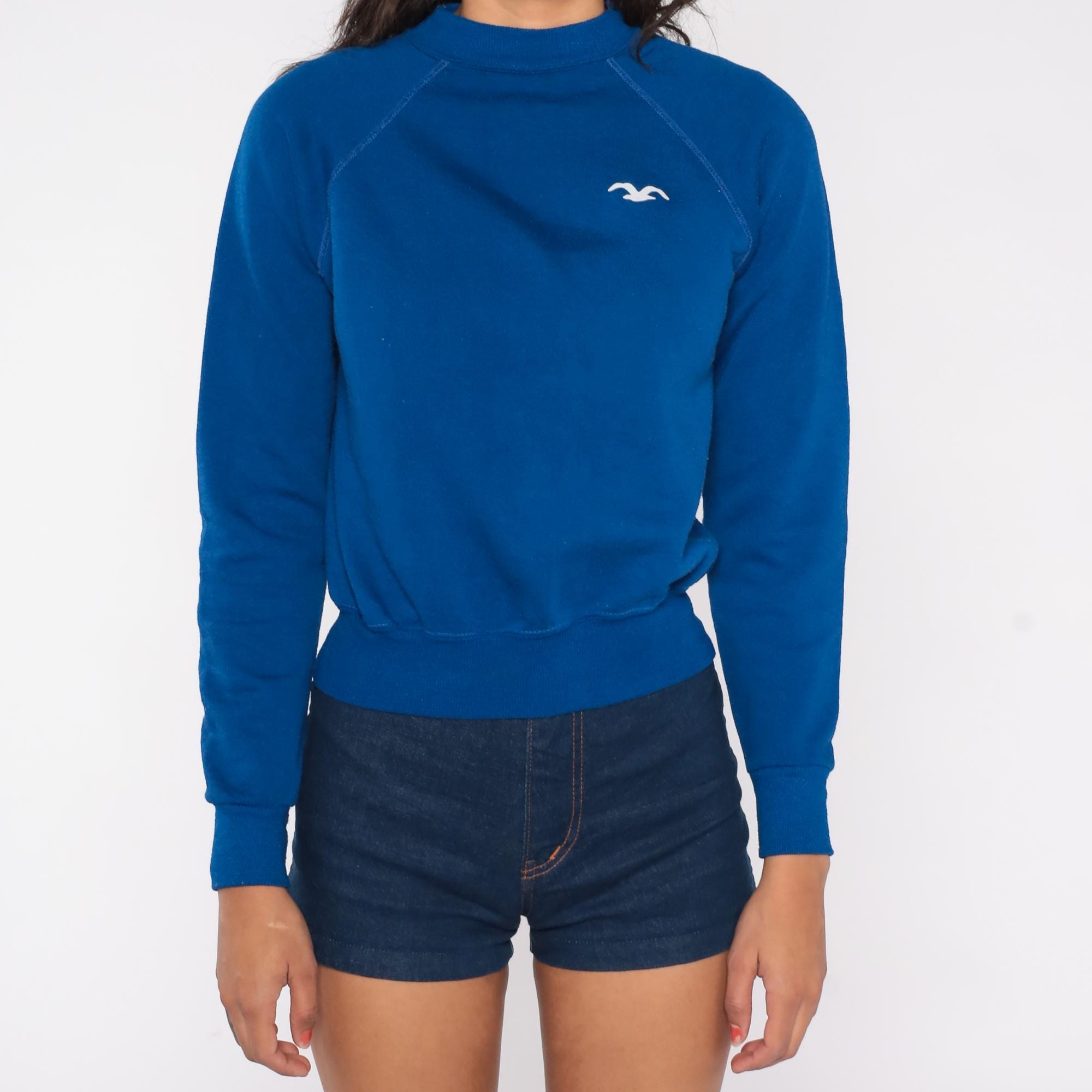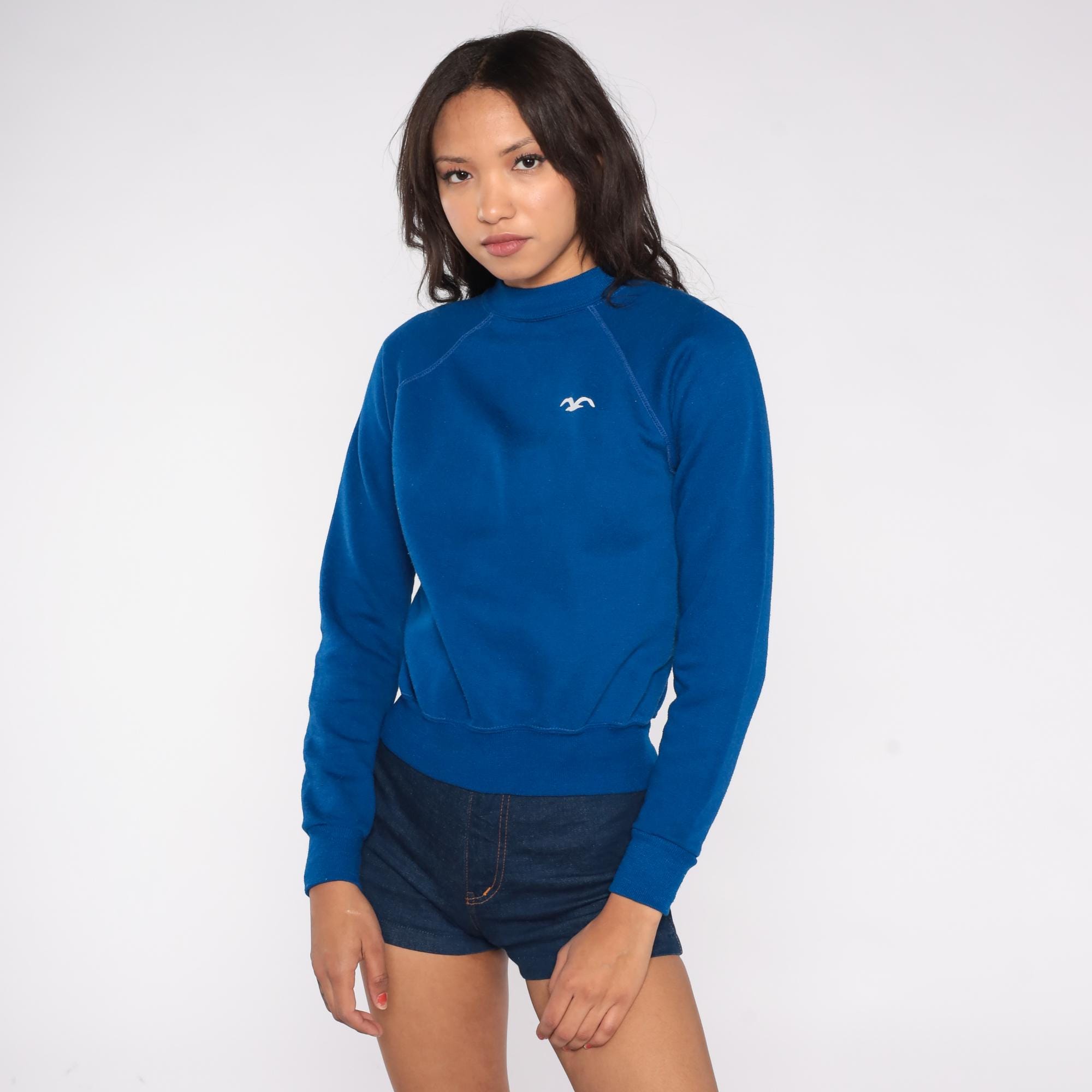 80s Wrangler Juniors sweatshirt in vibrant royal blue with iconic white seagull/bird logo. Features classic raglan sleeve construction with visible stitching, ribbed crew neck, cuffs, and hem.