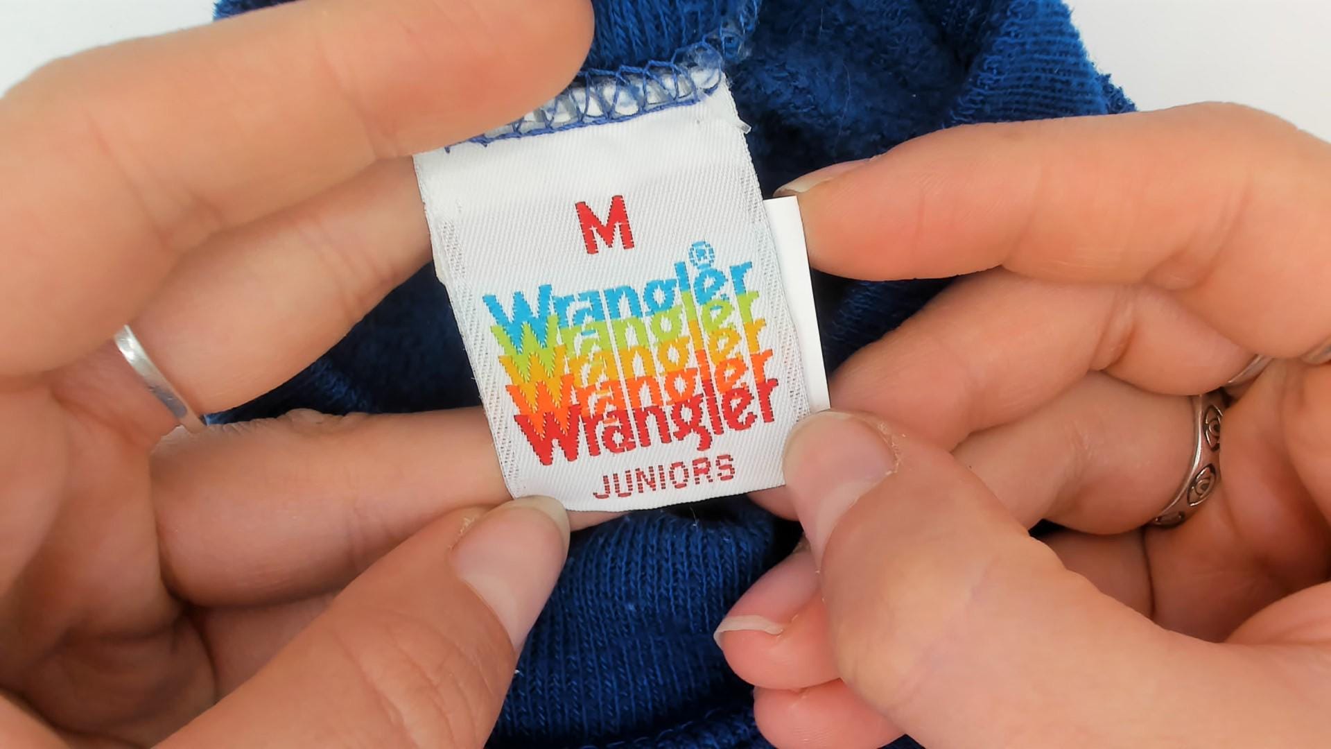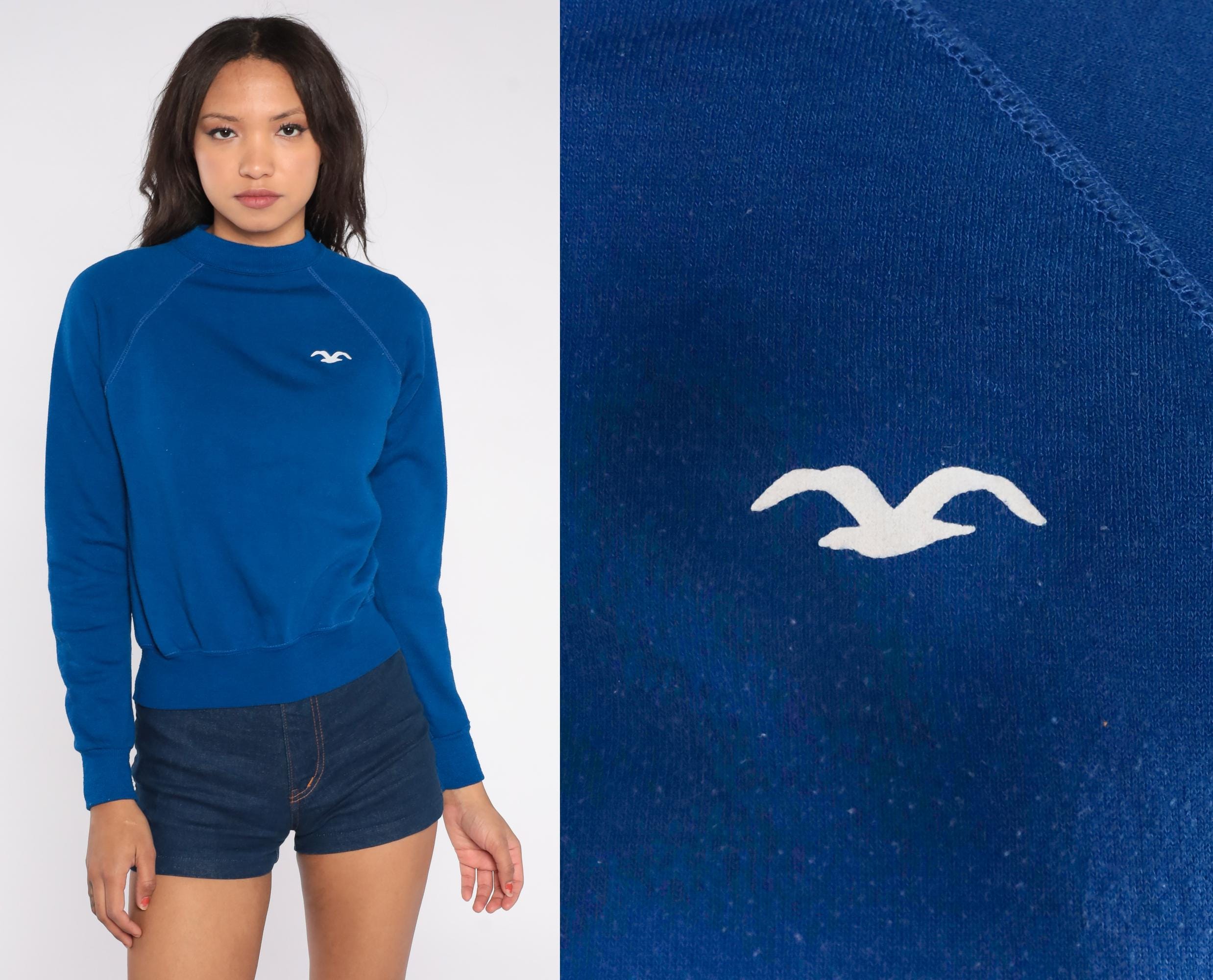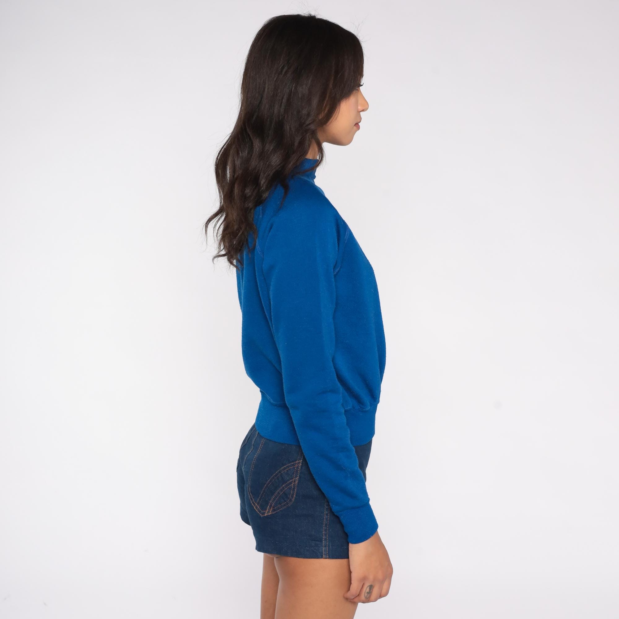 80s Wrangler Juniors sweatshirt in vibrant royal blue with iconic white seagull/bird logo. Features classic raglan sleeve construction with visible stitching, ribbed crew neck, cuffs, and hem.