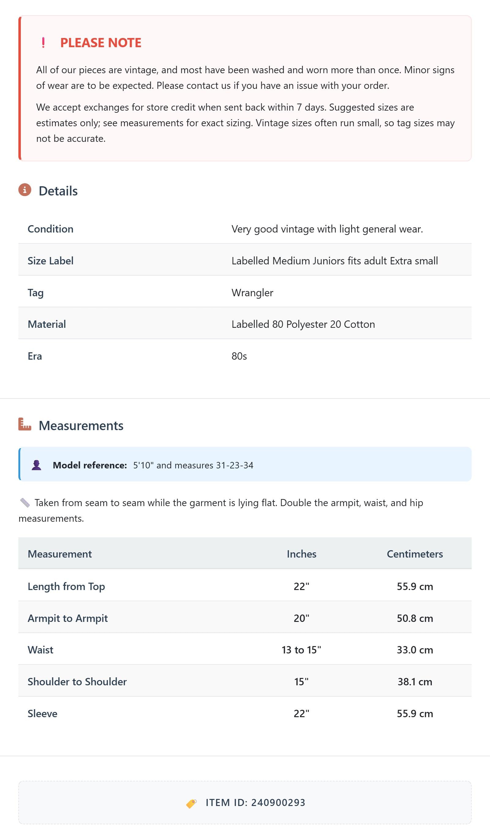 All of our pieces are vintage, and most have been washed and worn more than once. Minor signs of wear are to be expected. Please contact us if you have an issue with your order. We accept exchanges for store credit when sent back within 7 days.