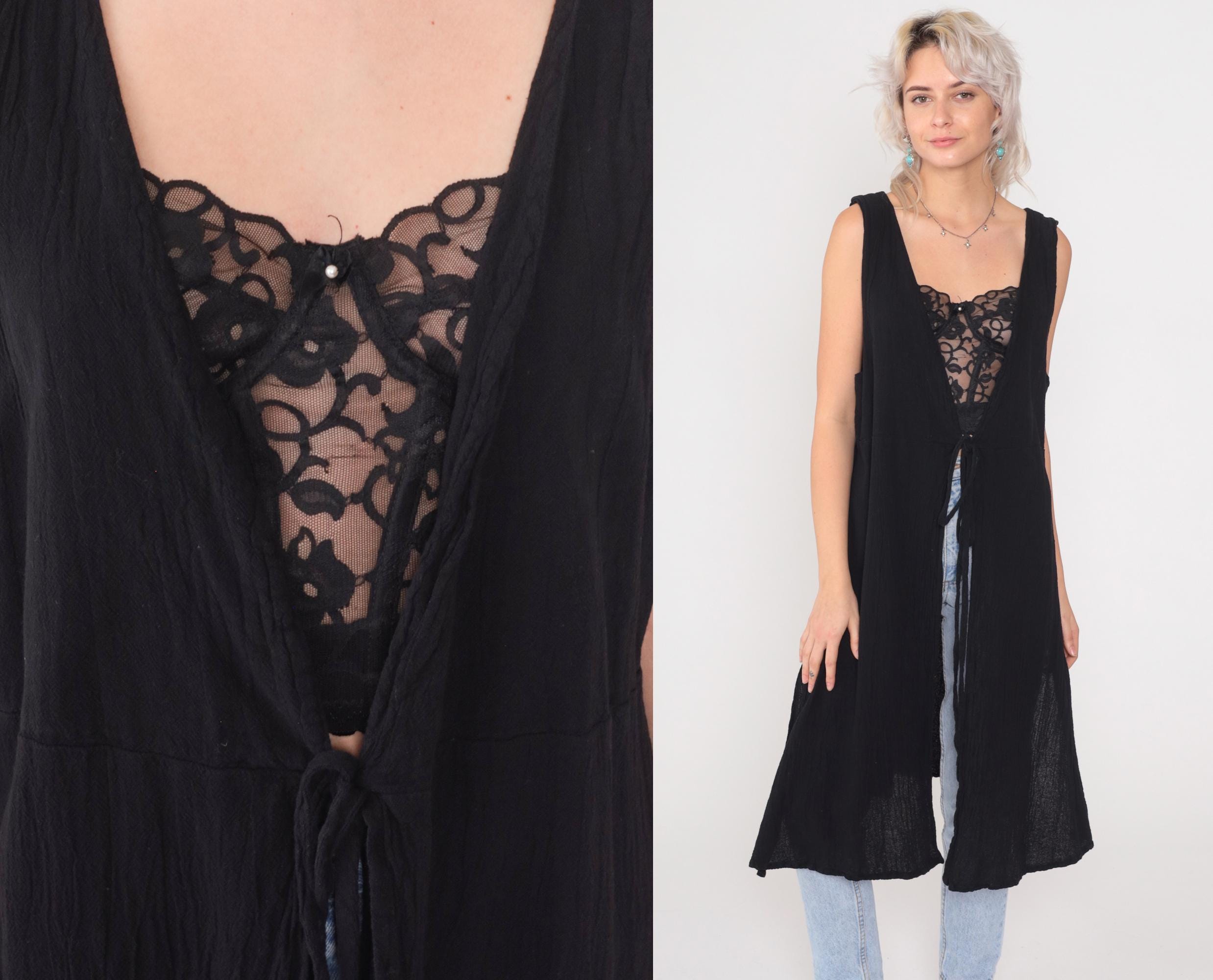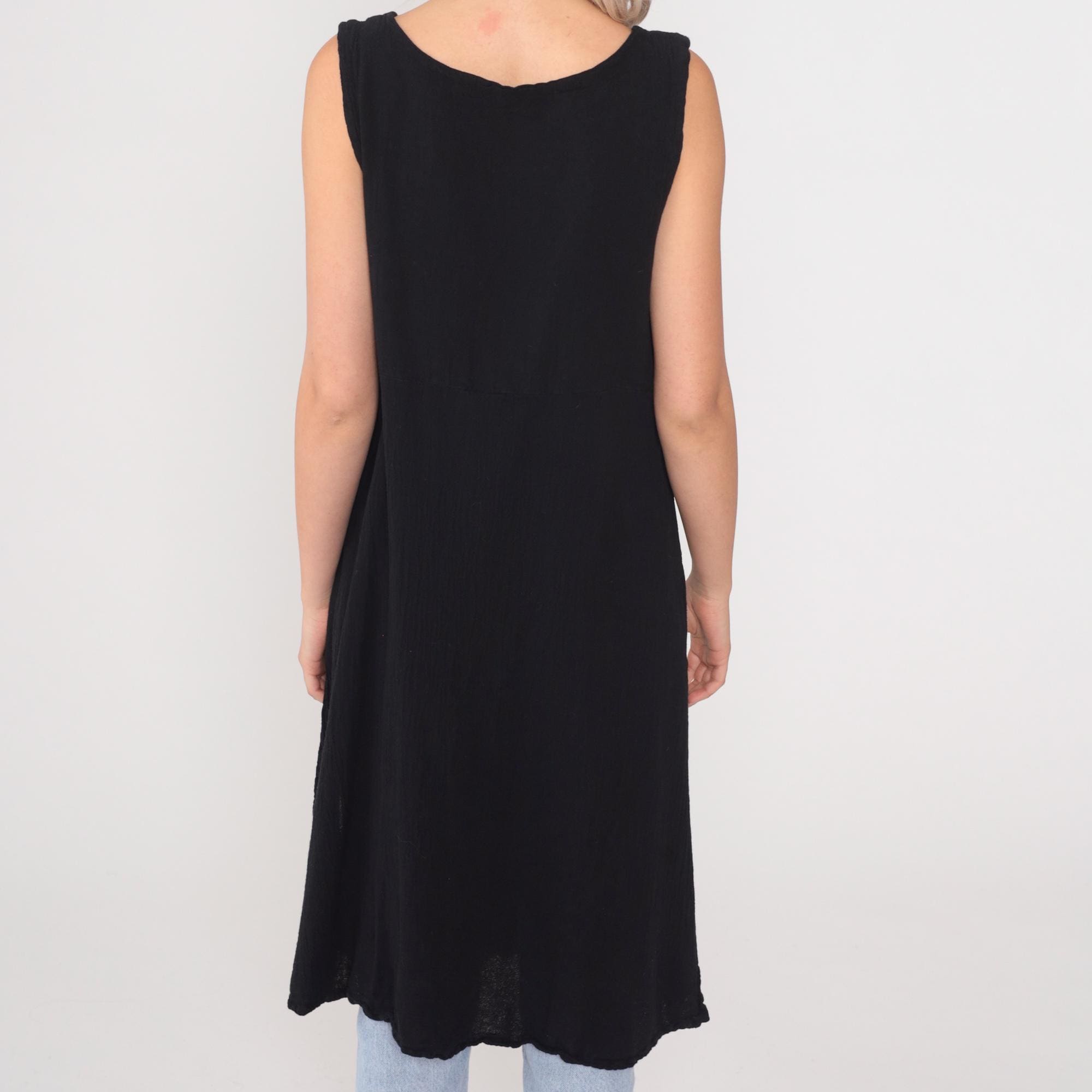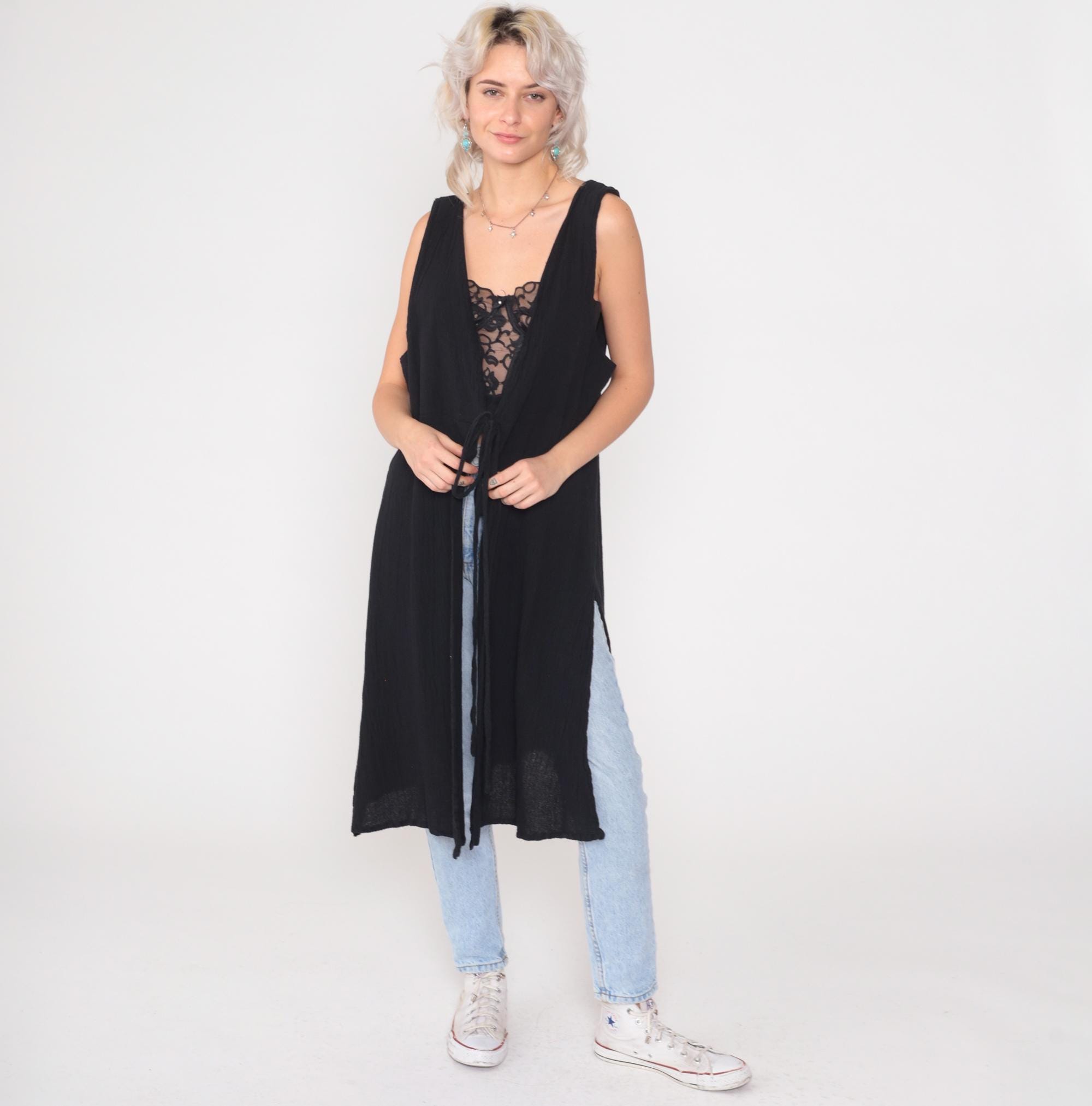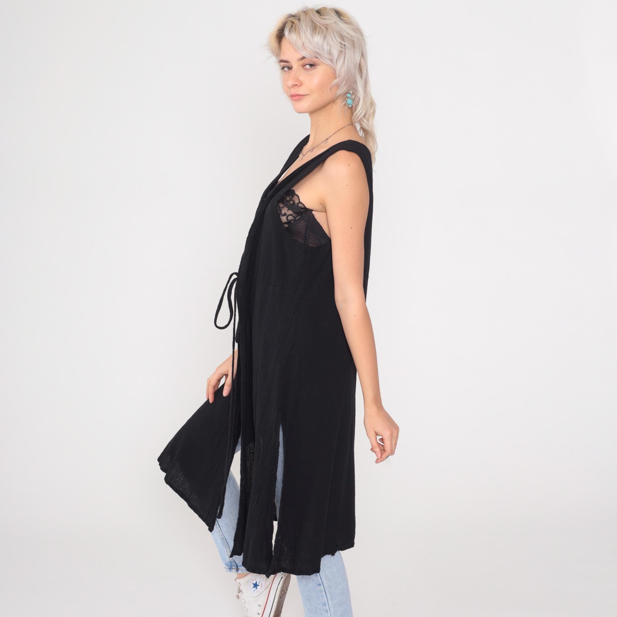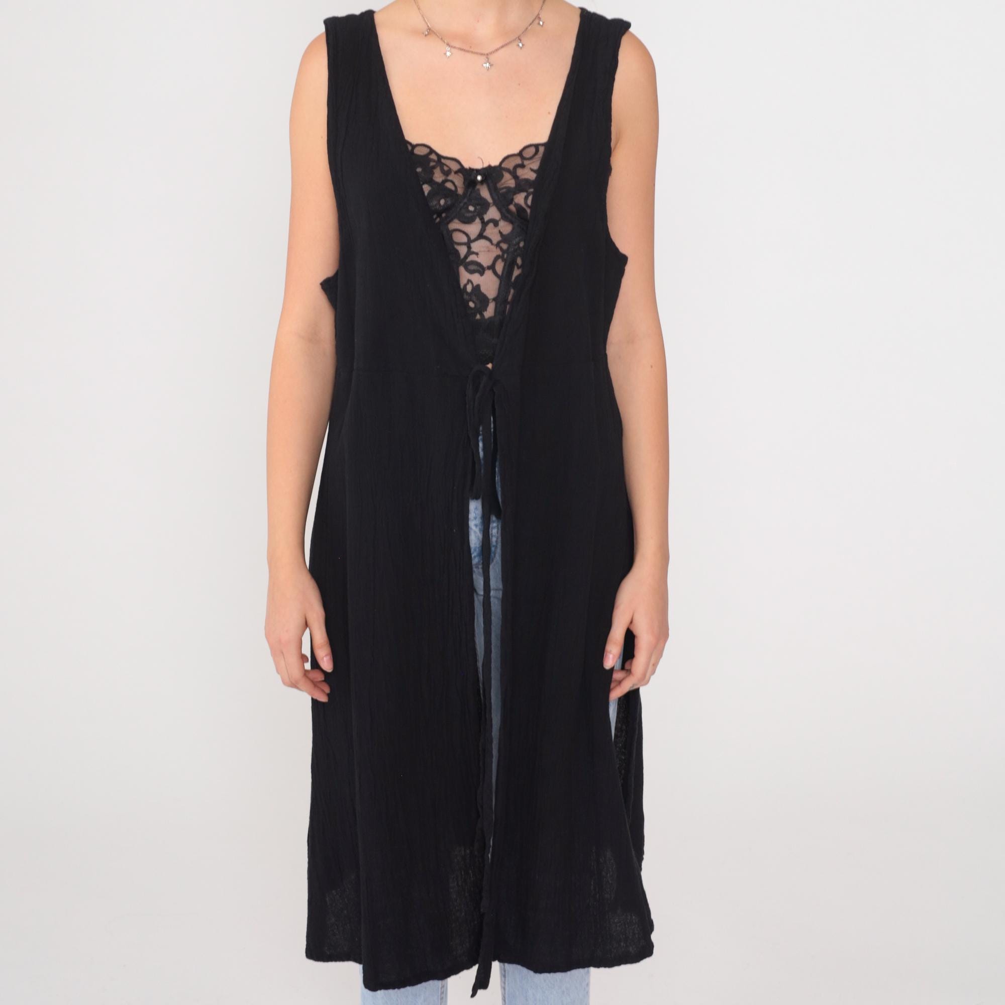 Black cotton vest dress from the early 2000s. Long duster length with sleeveless design, wide straps, and scoop neck. Features tie front closure with long ribbon ties at waist and side slits. Simple A-line silhouette. Can be worn as layering piece, beach cover, or festival tunic.