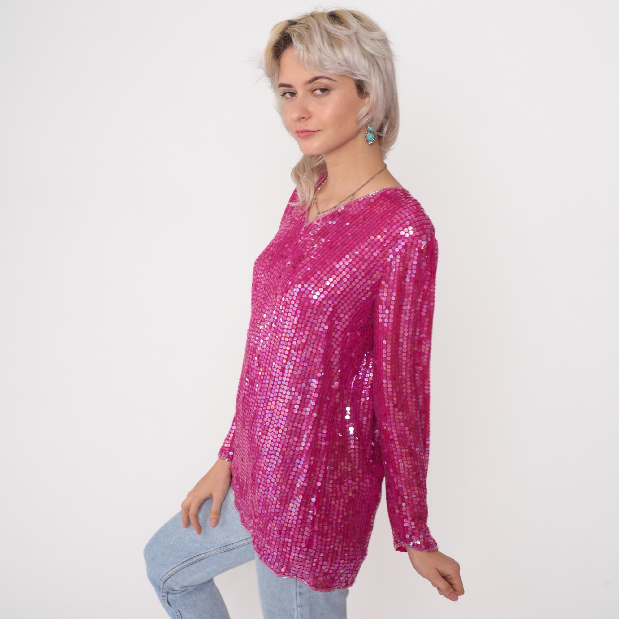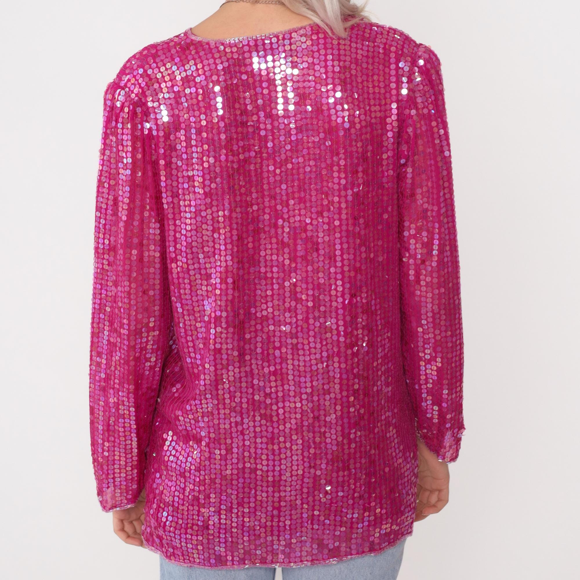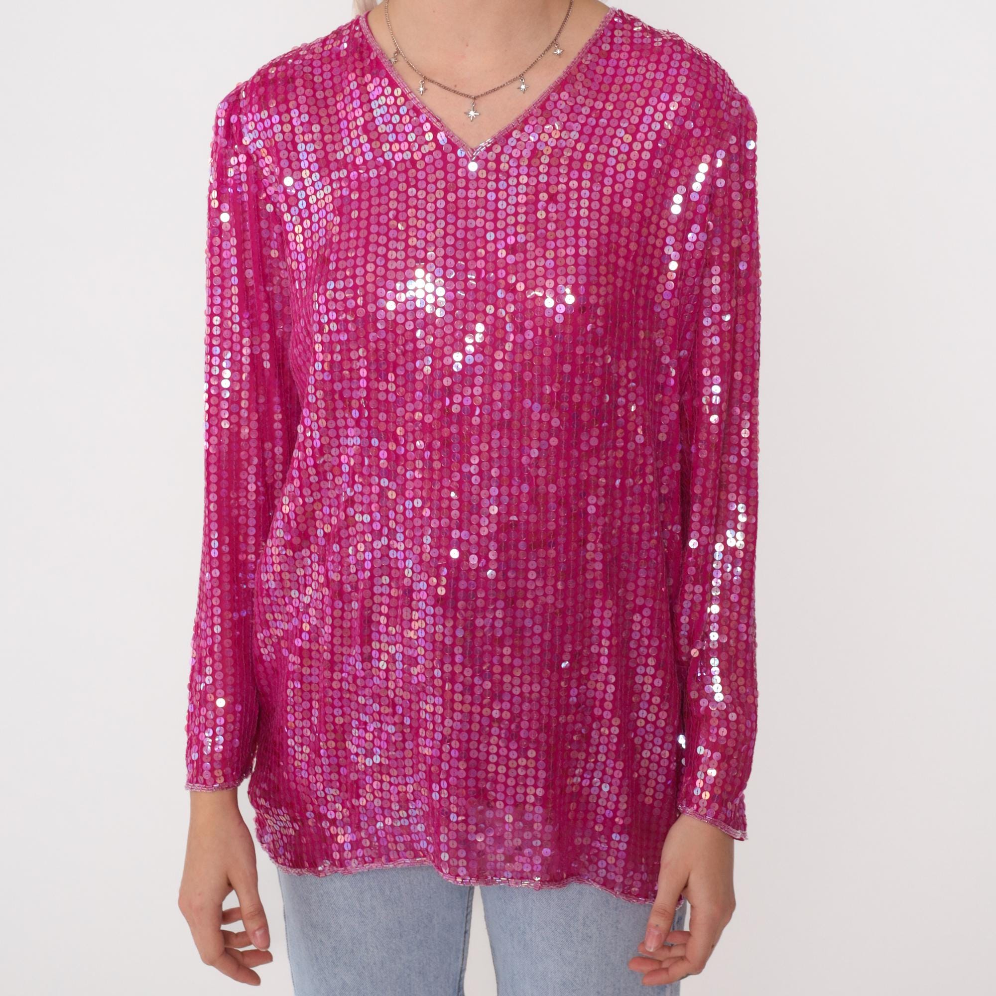 Hot pink sequin blouse from the 1990s with iridescent holographic finish throughout. Features V-neckline and long sleeves with relaxed fit. Fully covered in sequins on silk base.