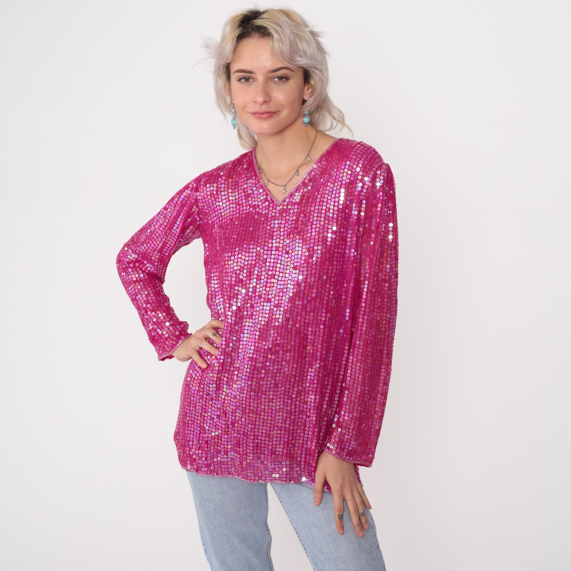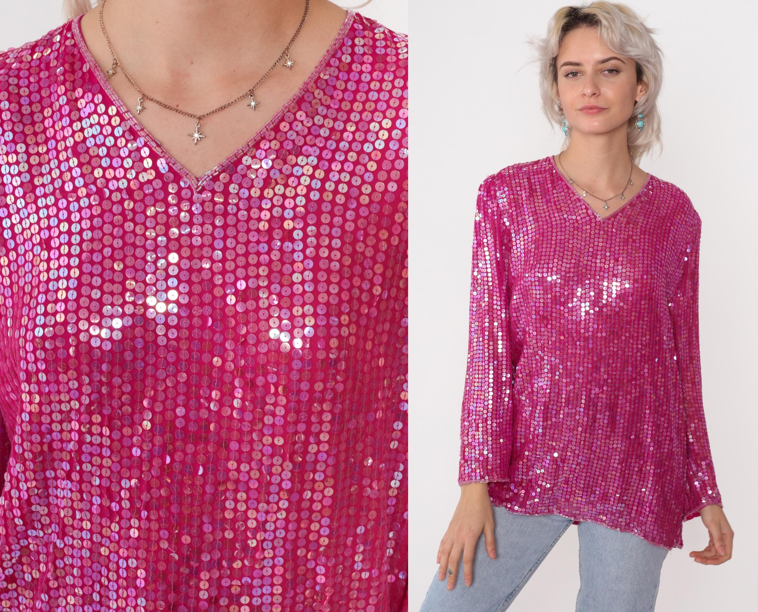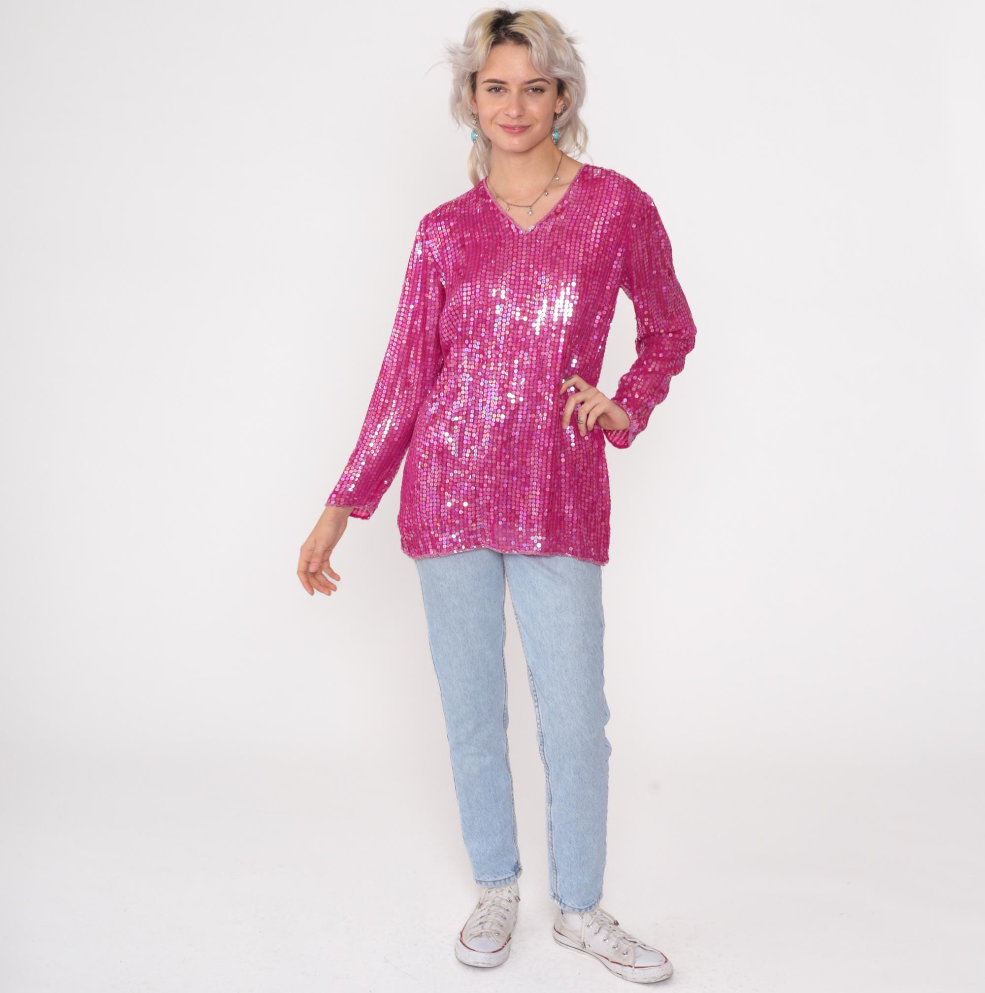 Hot pink sequin blouse from the 1990s with iridescent holographic finish throughout. Features V-neckline and long sleeves with relaxed fit. Fully covered in sequins on silk base.