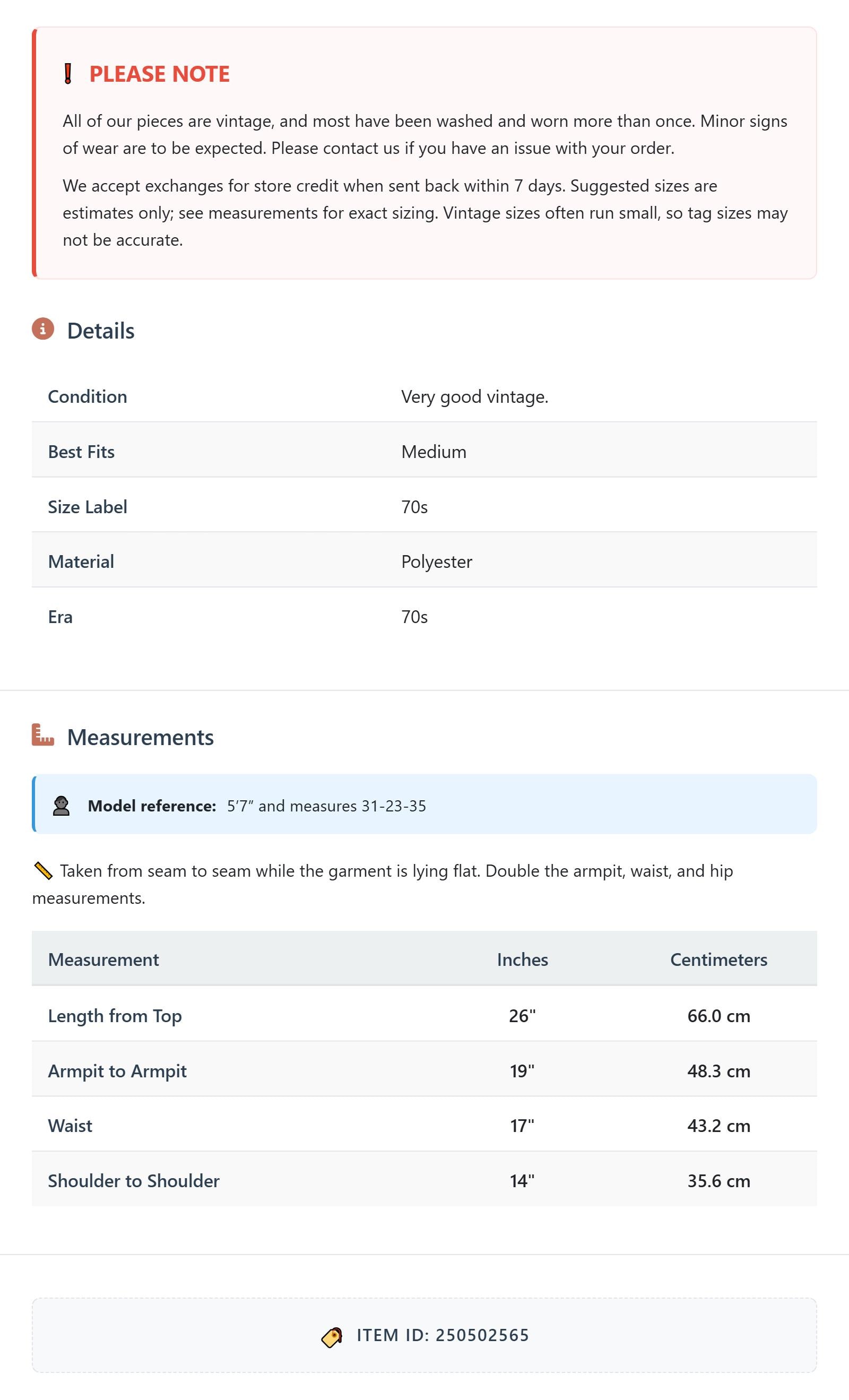 Suggested sizes are estimates only; see measurements for exact sizing. Vintage sizes often run small, so tag sizes may not be accurate.