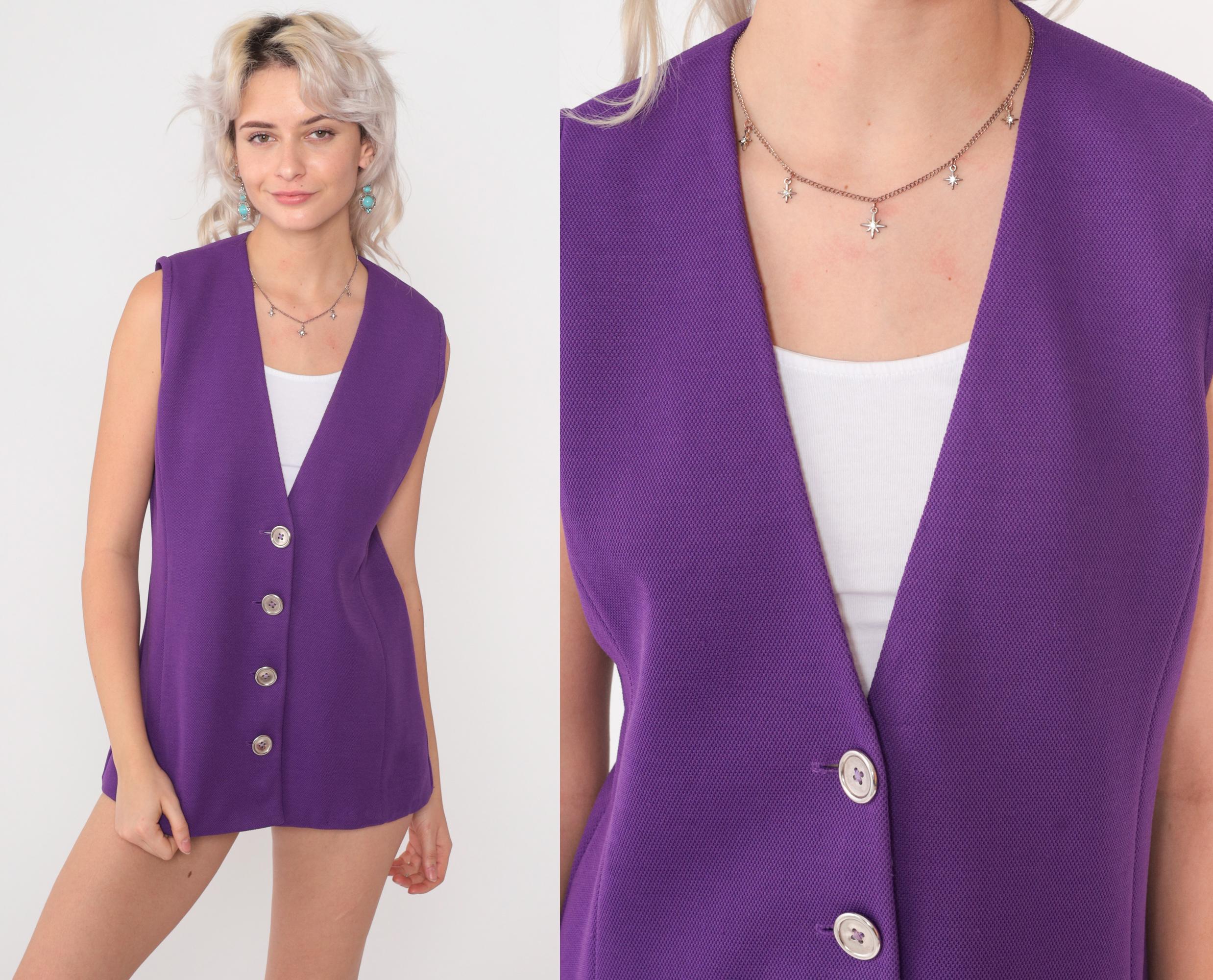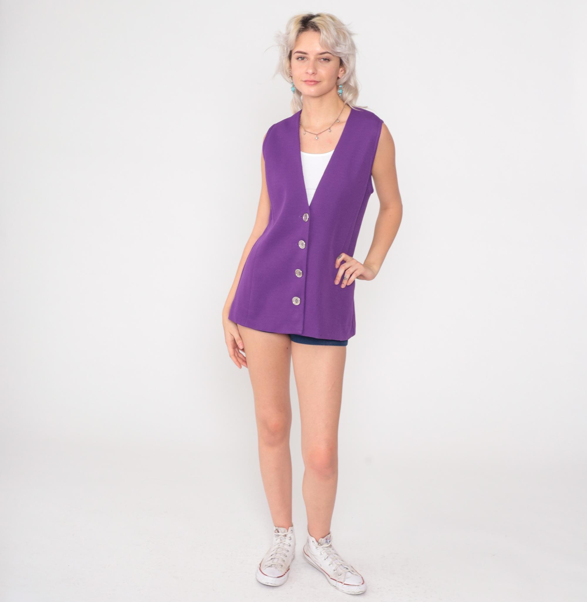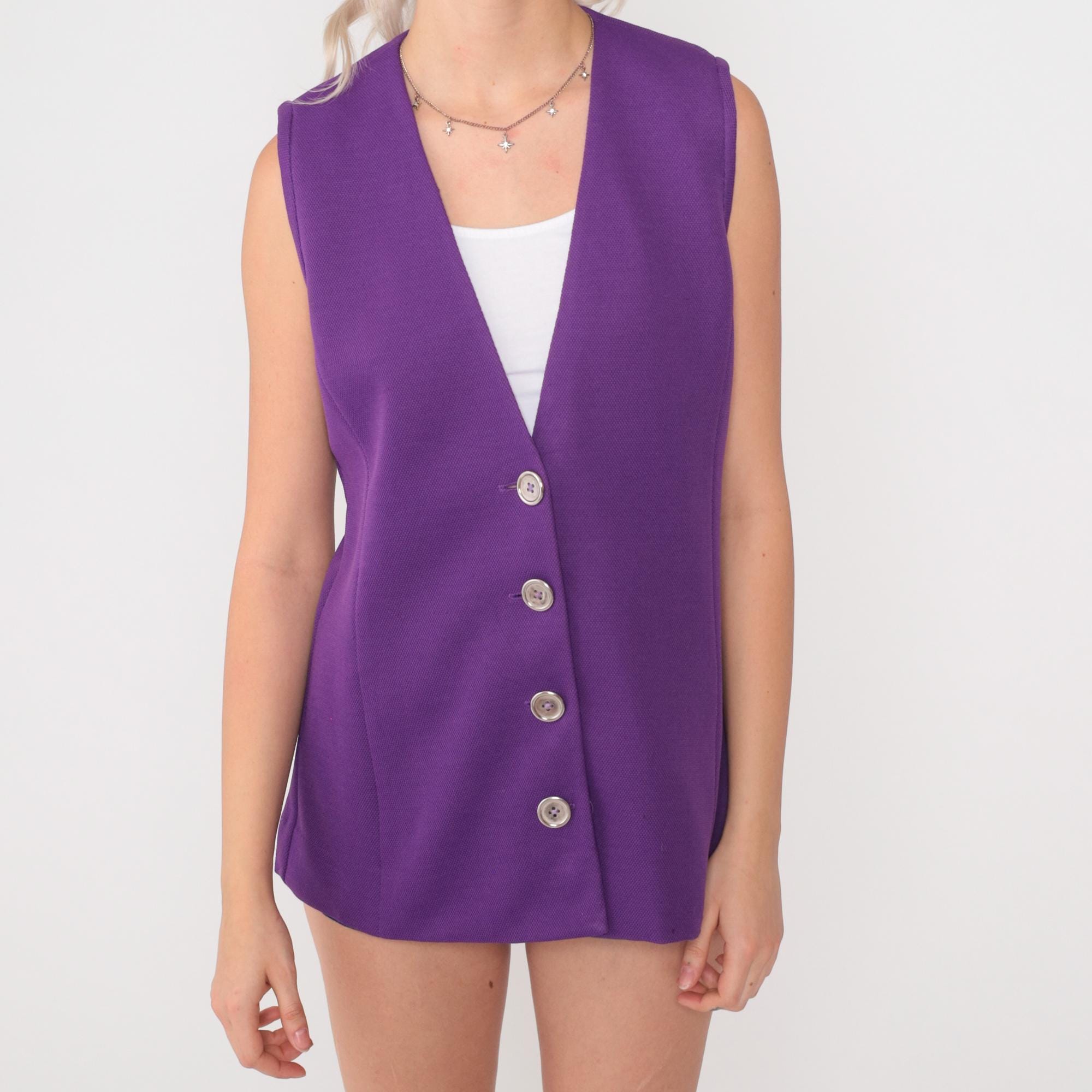 Purple sleeveless vest from the 1970s with button-front closure and deep V-neck. Features textured pique knit fabric throughout with four white buttons and relaxed fit. Made of polyester.