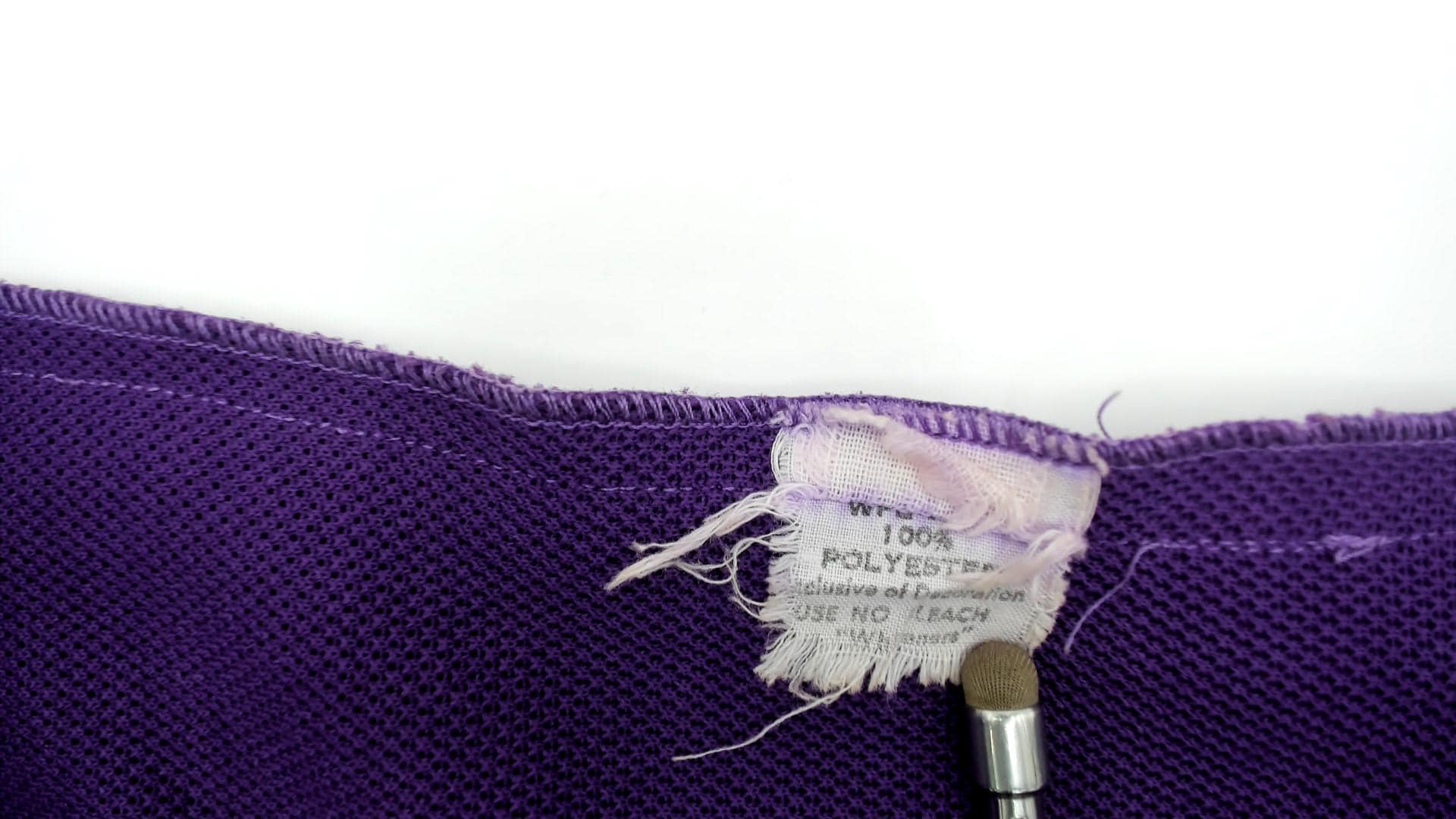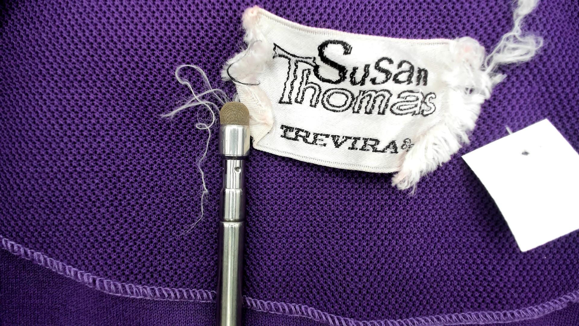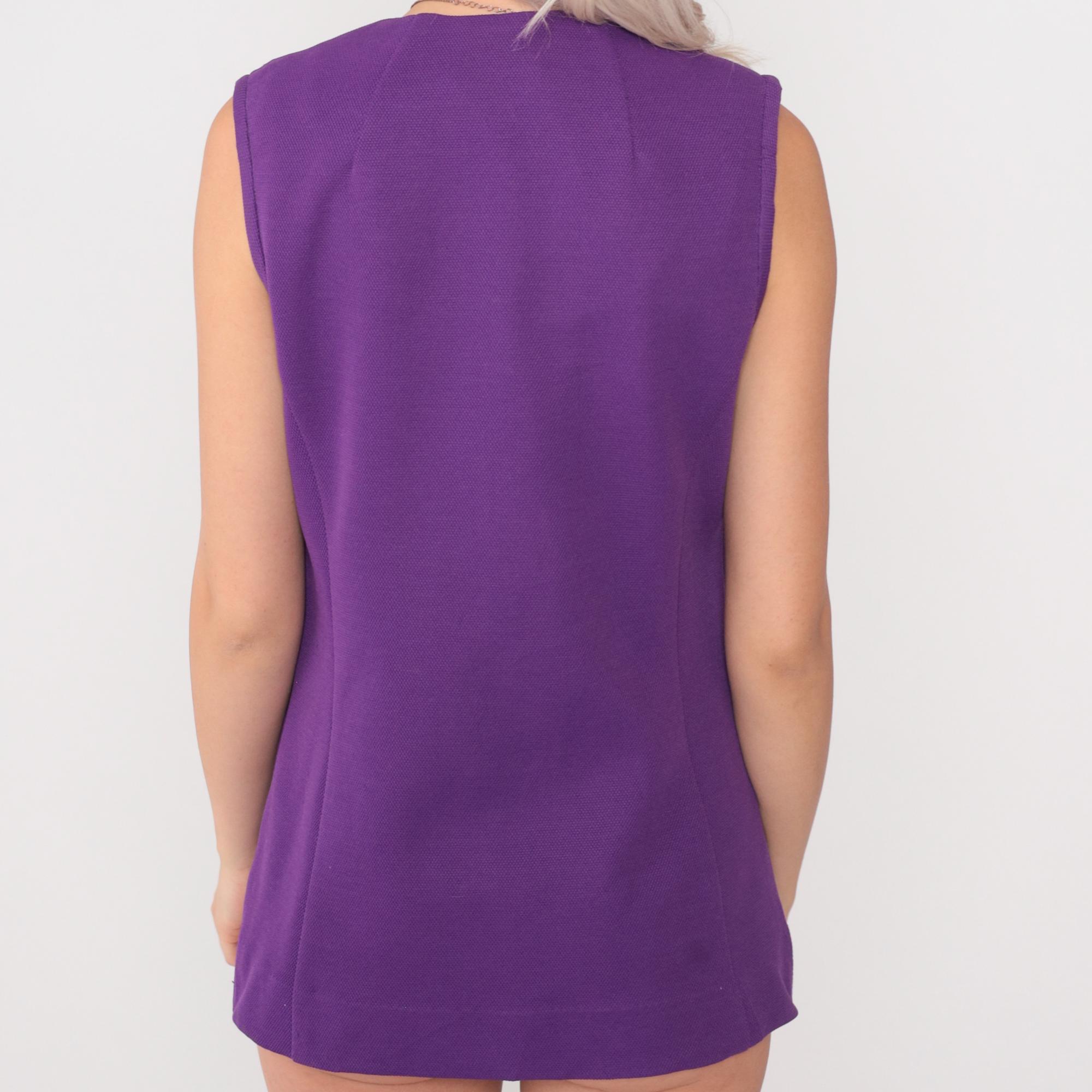 Purple sleeveless vest from the 1970s with button-front closure and deep V-neck. Features textured pique knit fabric throughout with four white buttons and relaxed fit. Made of polyester.