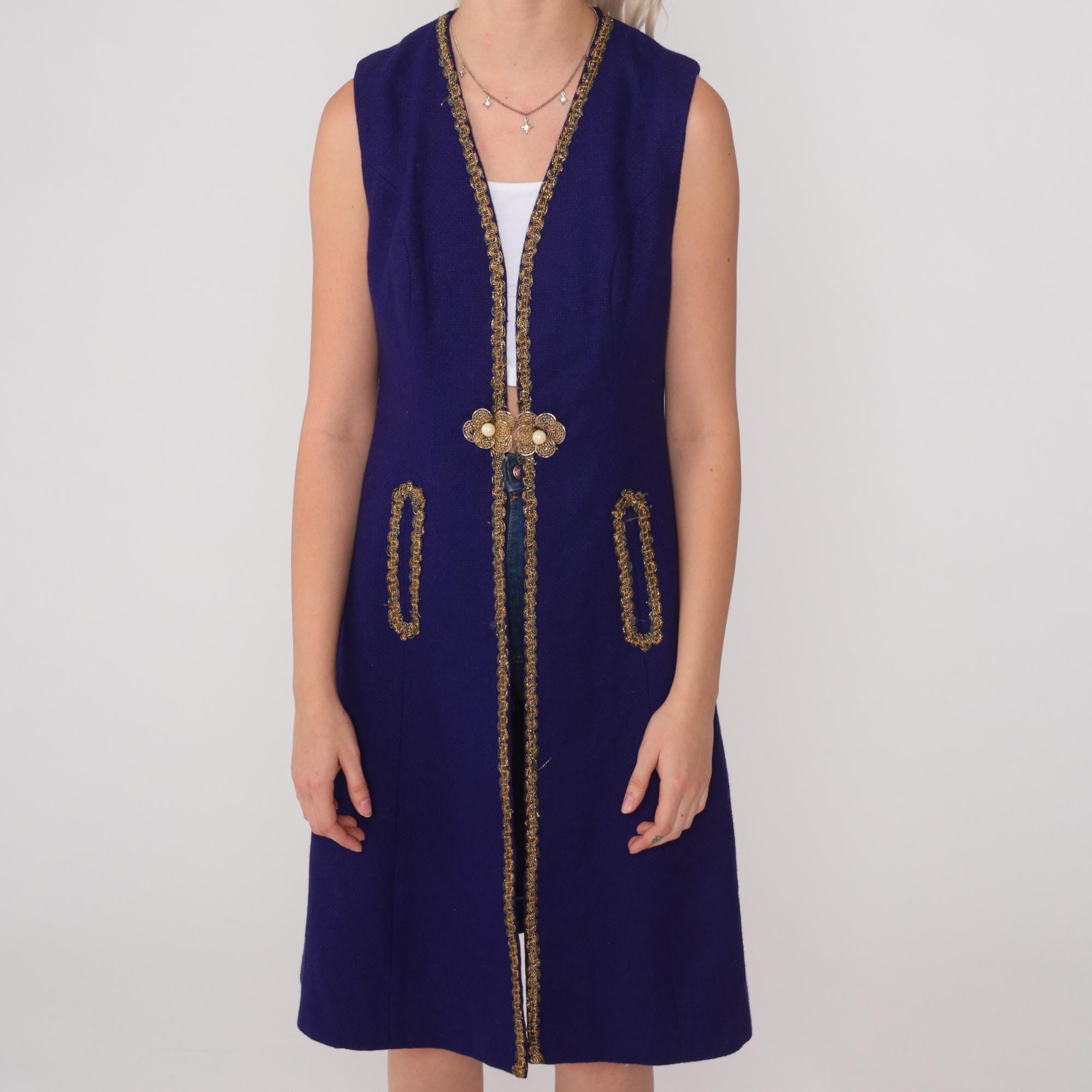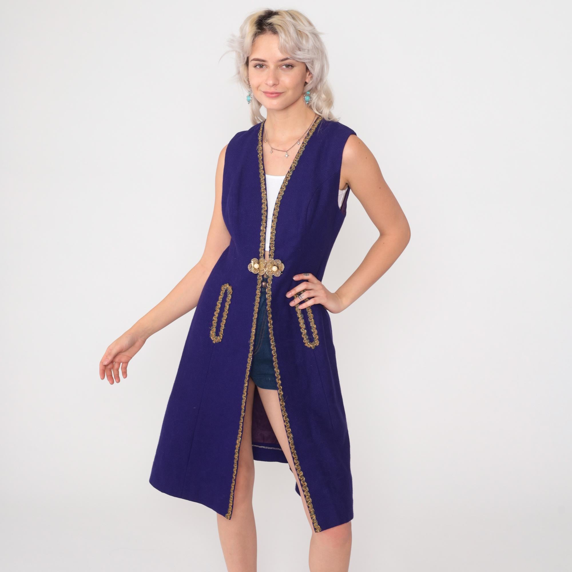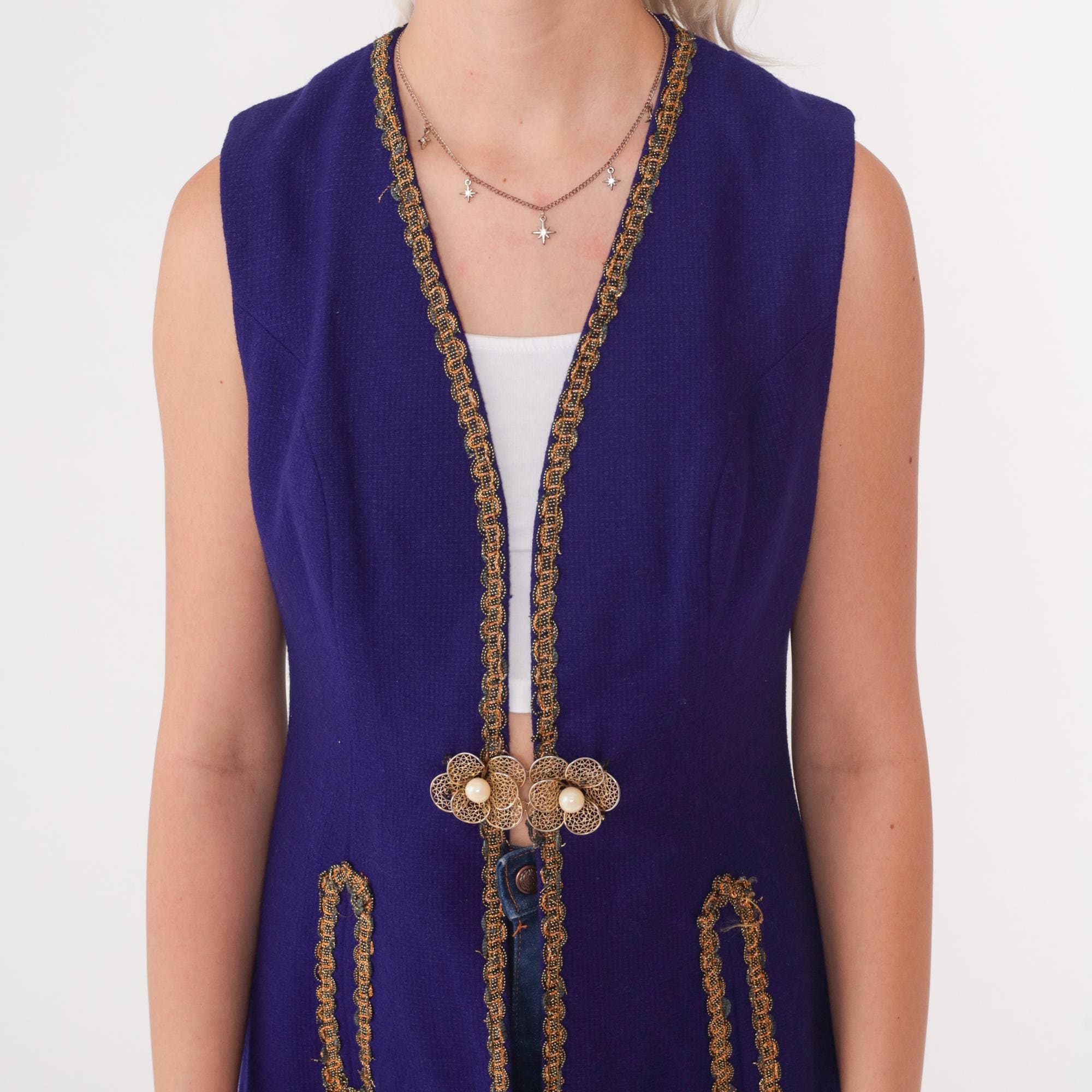 Purple beaded vest from the 1970s with gold beaded trim along V-neckline, center front, and pockets. Features ornate beaded fleur-de-lis closure at waist, sleeveless vest design, and A-line silhouette.