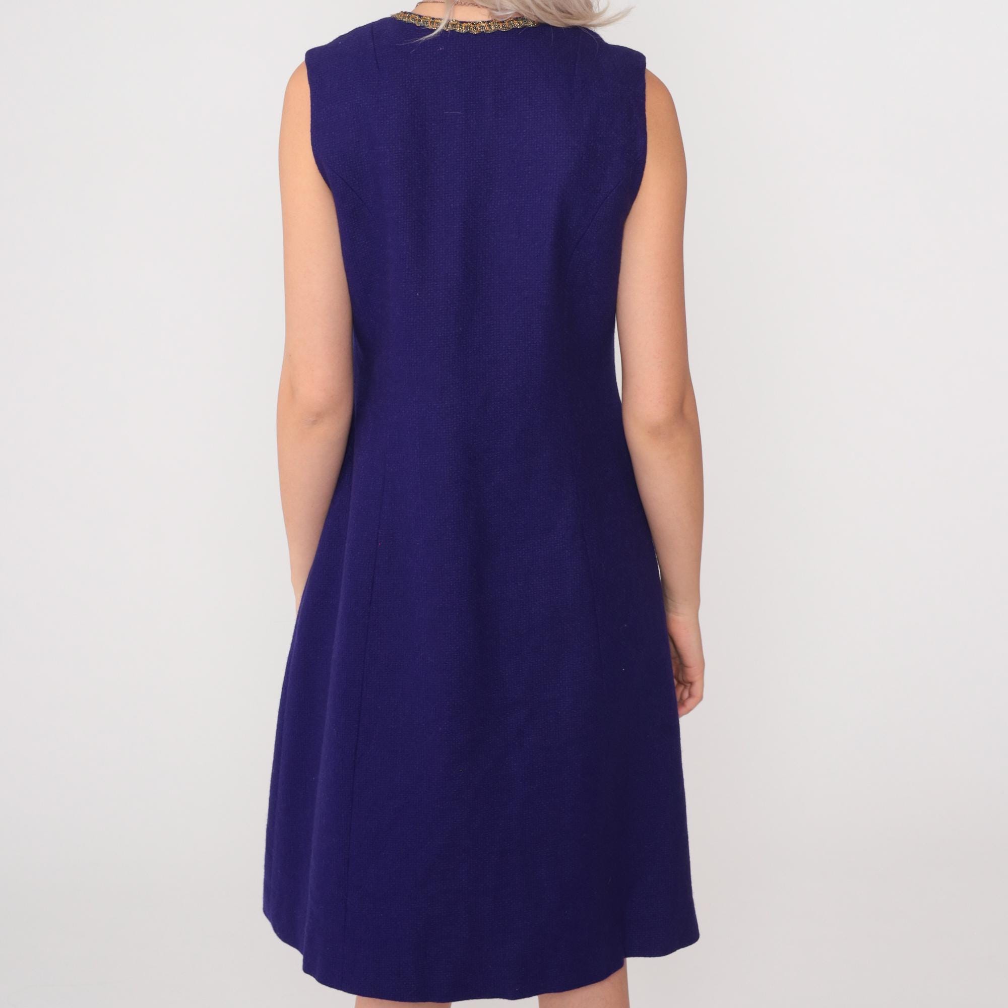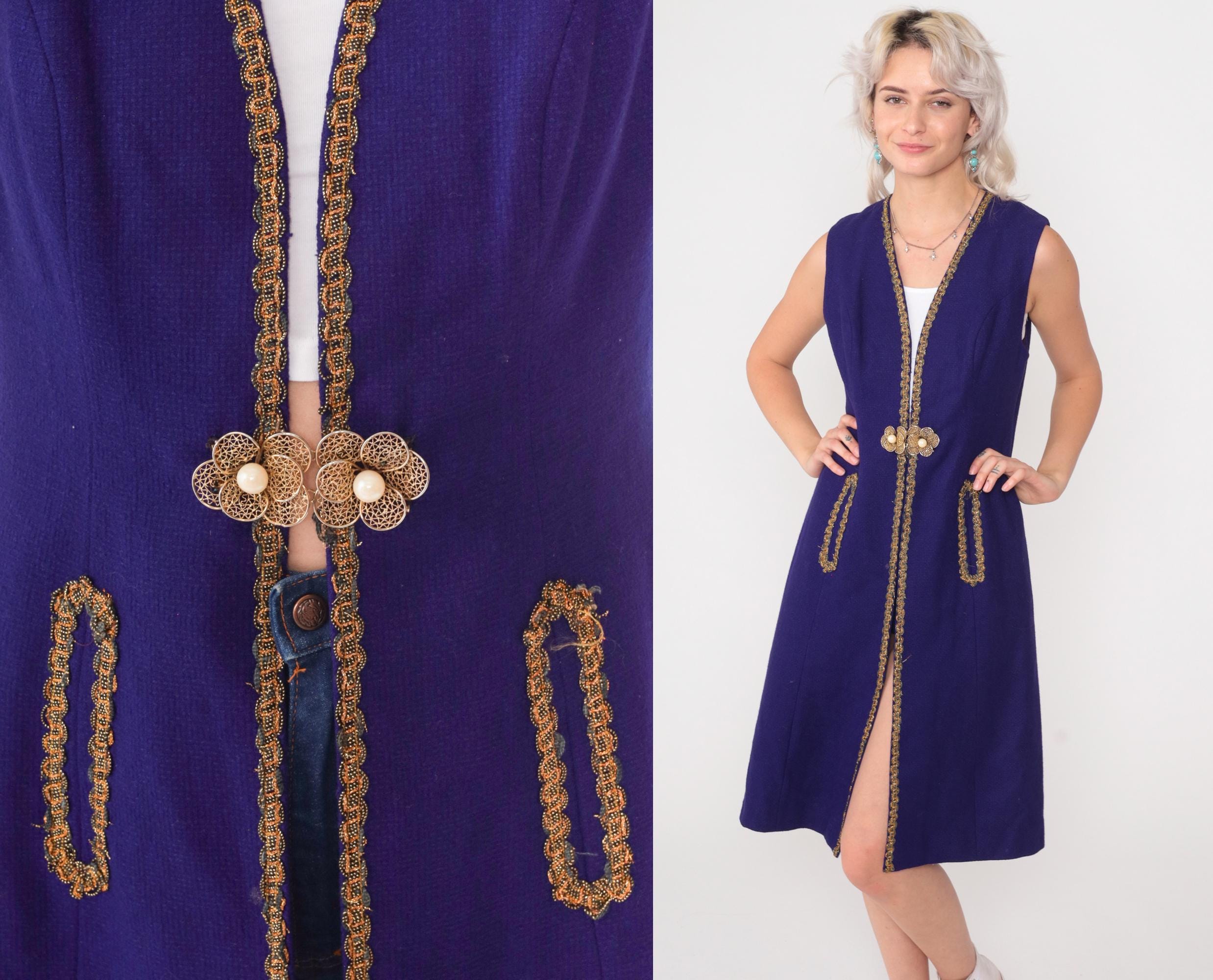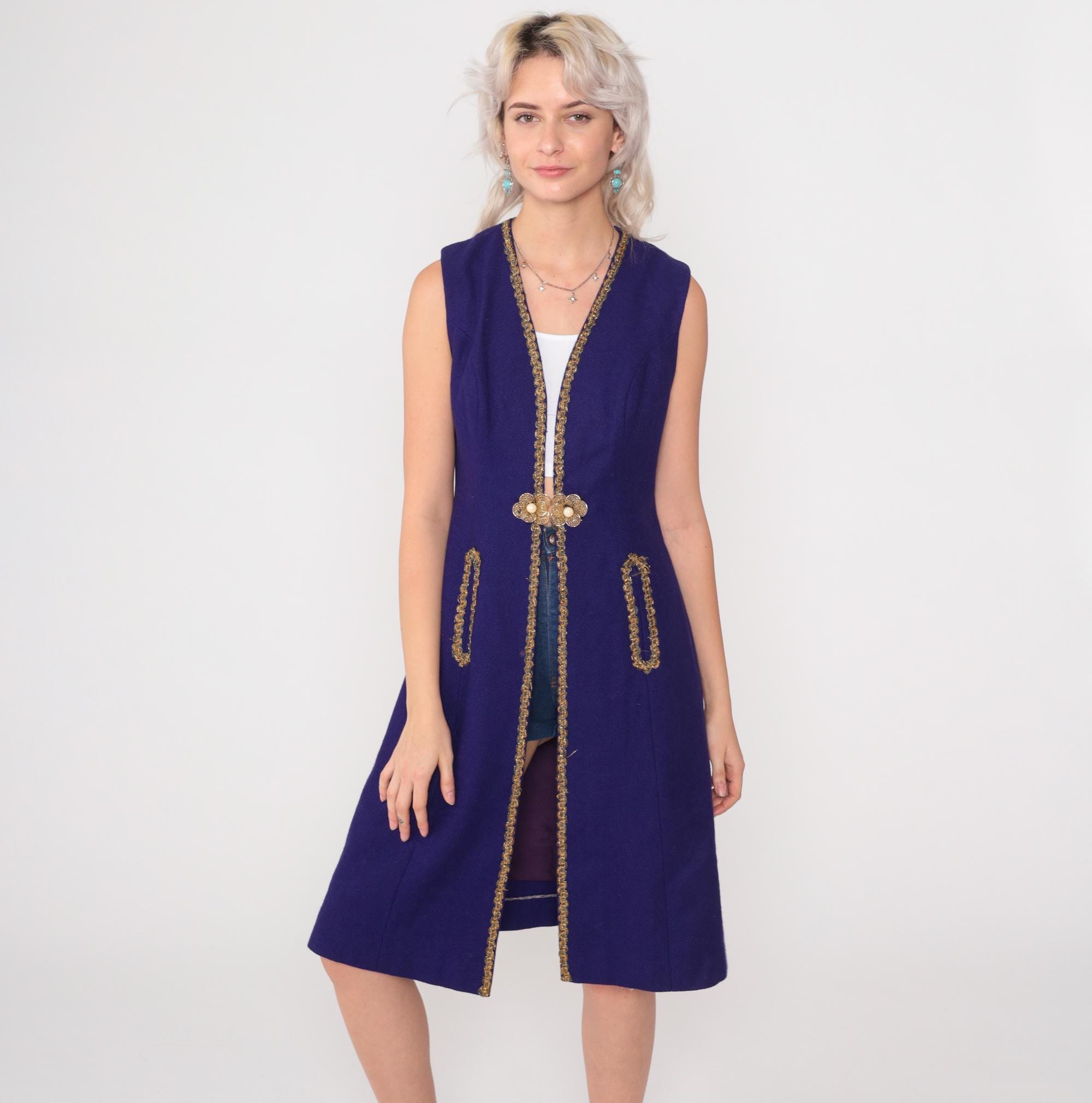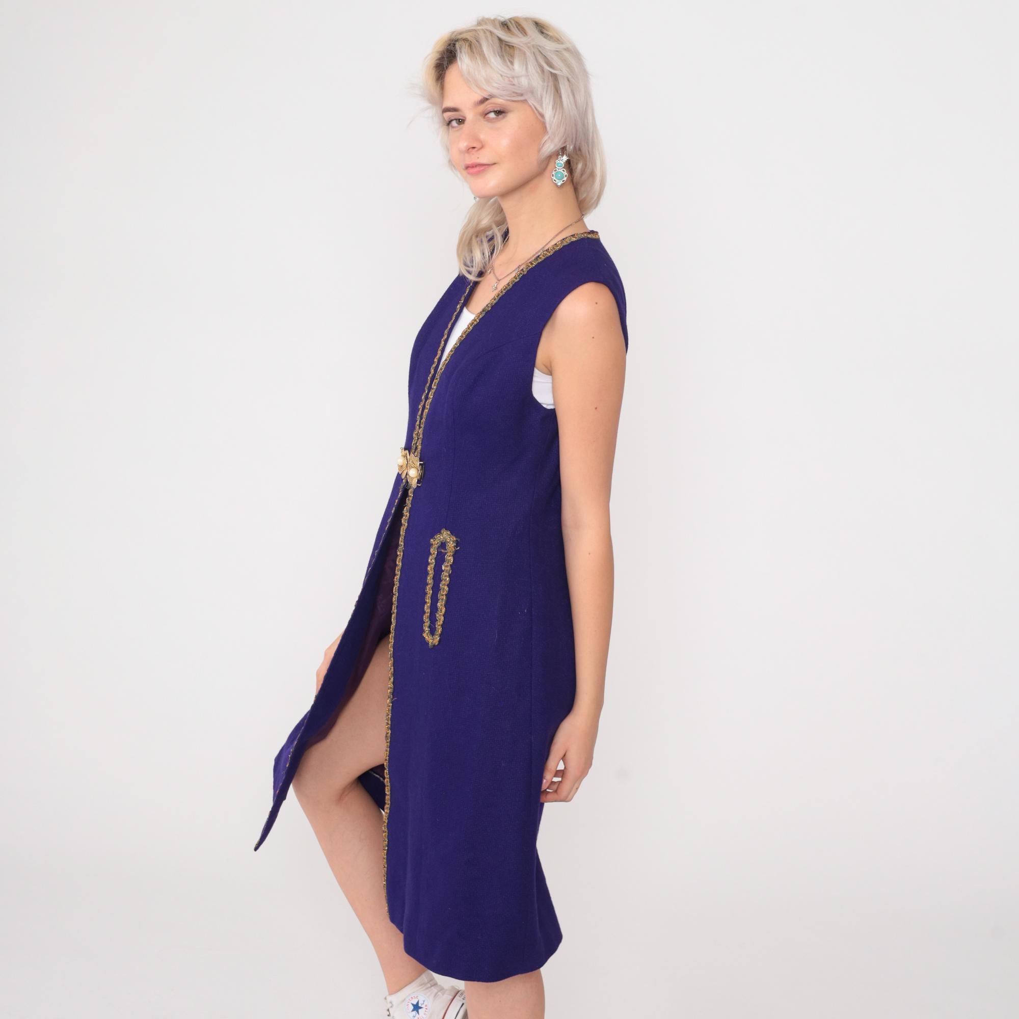 Purple beaded vest from the 1970s with gold beaded trim along V-neckline, center front, and pockets. Features ornate beaded fleur-de-lis closure at waist, sleeveless vest design, and A-line silhouette.