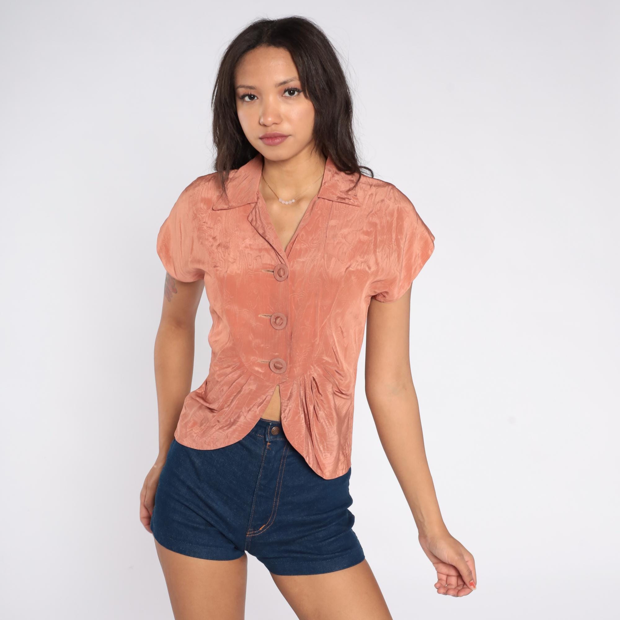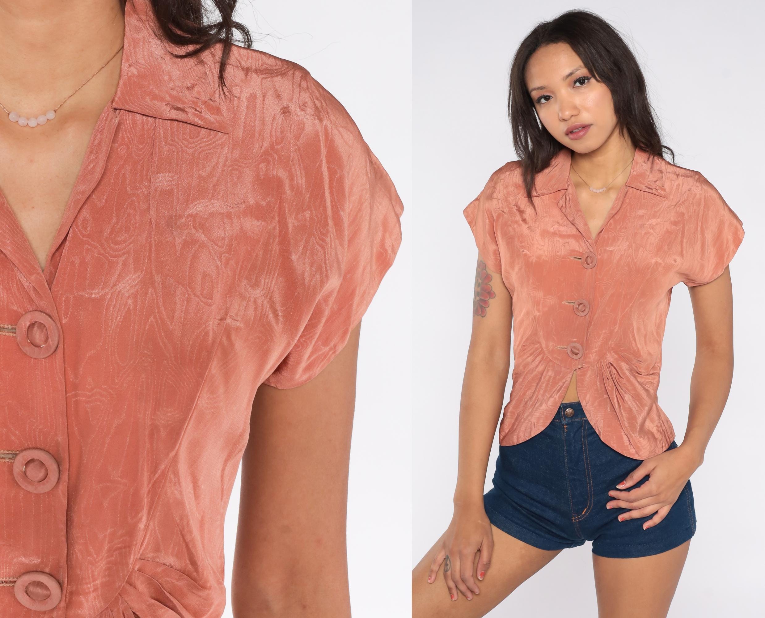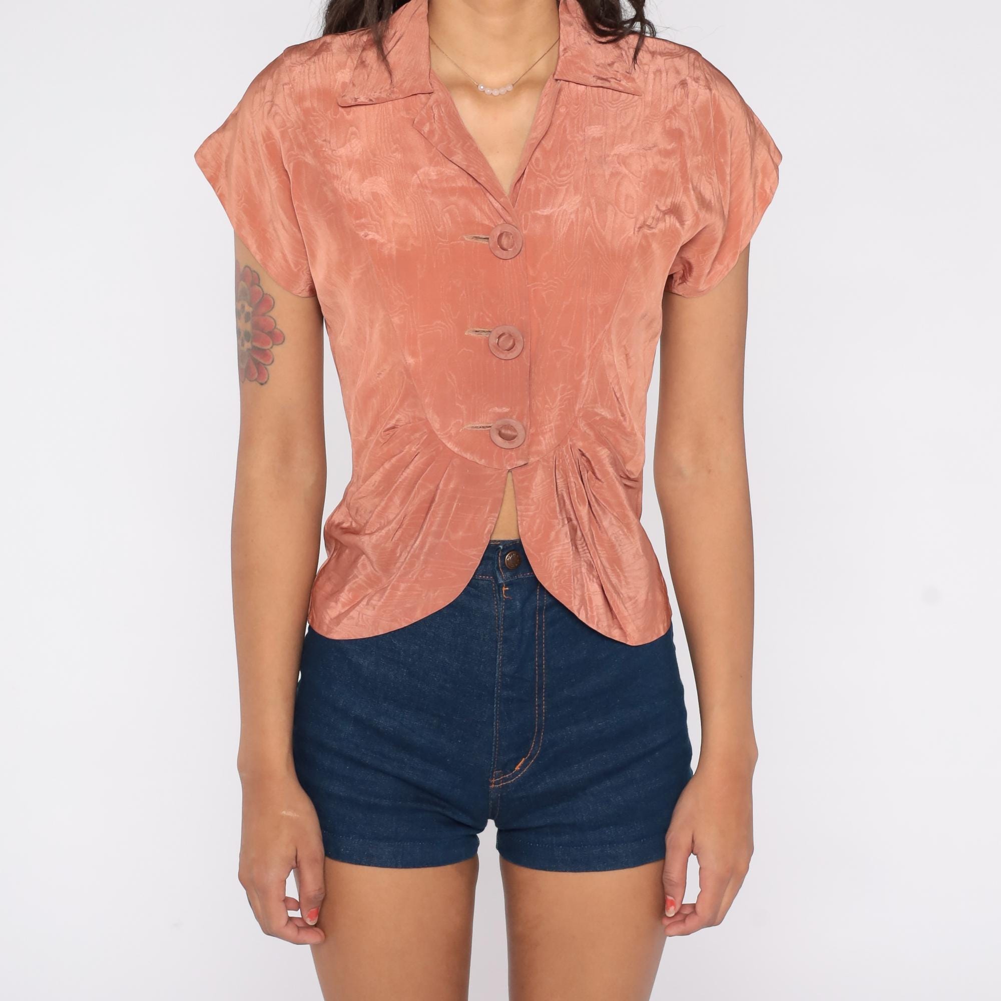 1940s blouse features coral pink salmon moiré fabric with watered silk effect. Notched collar. Button front with covered buttons. Short sleeves. Fitted bodice. Peplum waist. Gathered detail at waist.