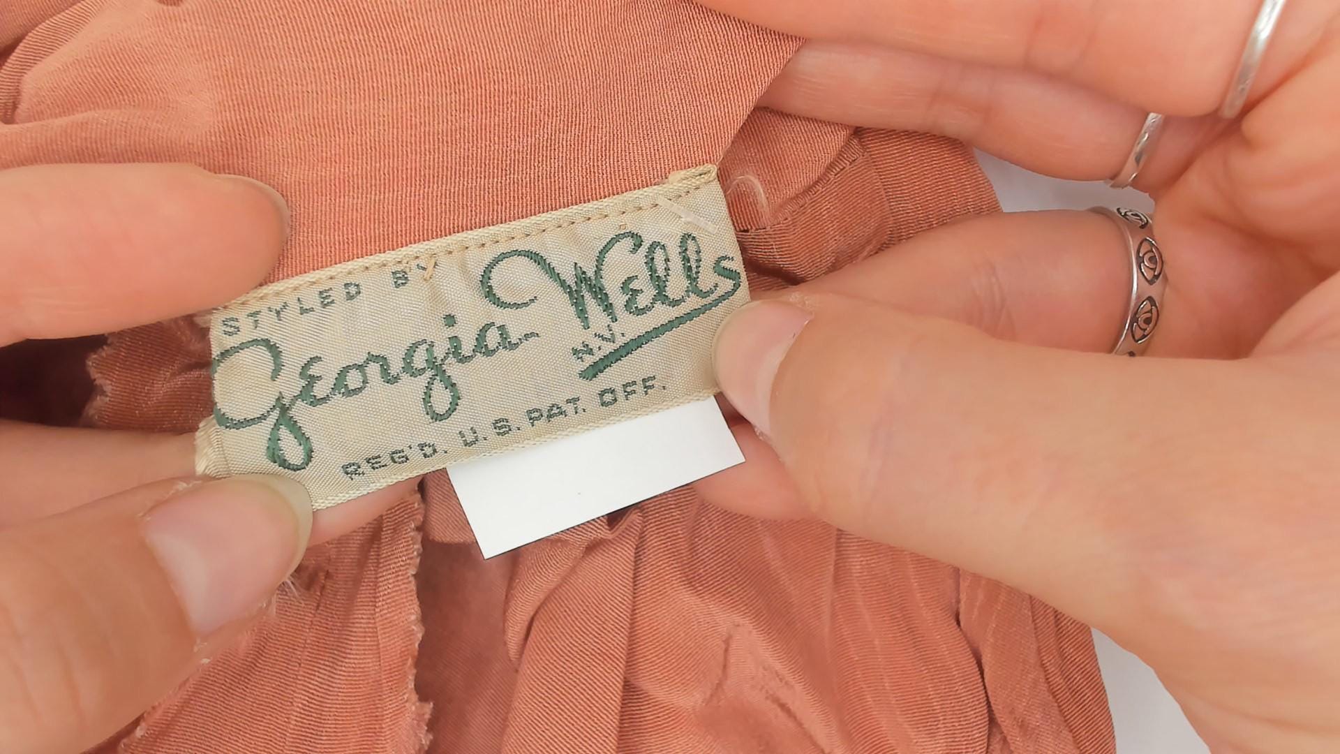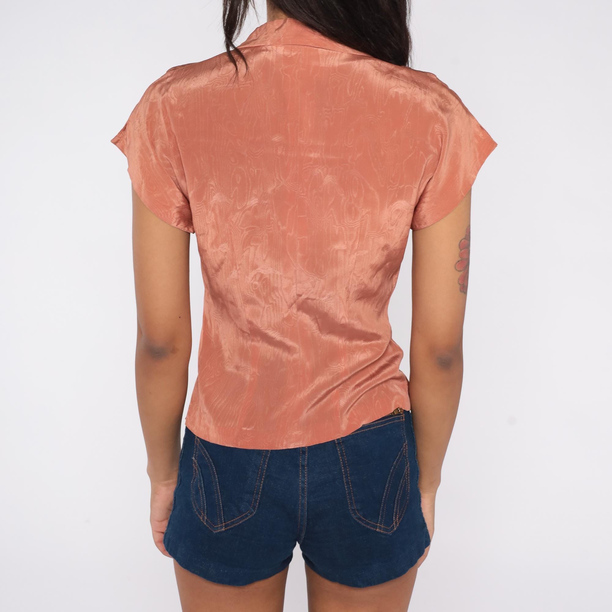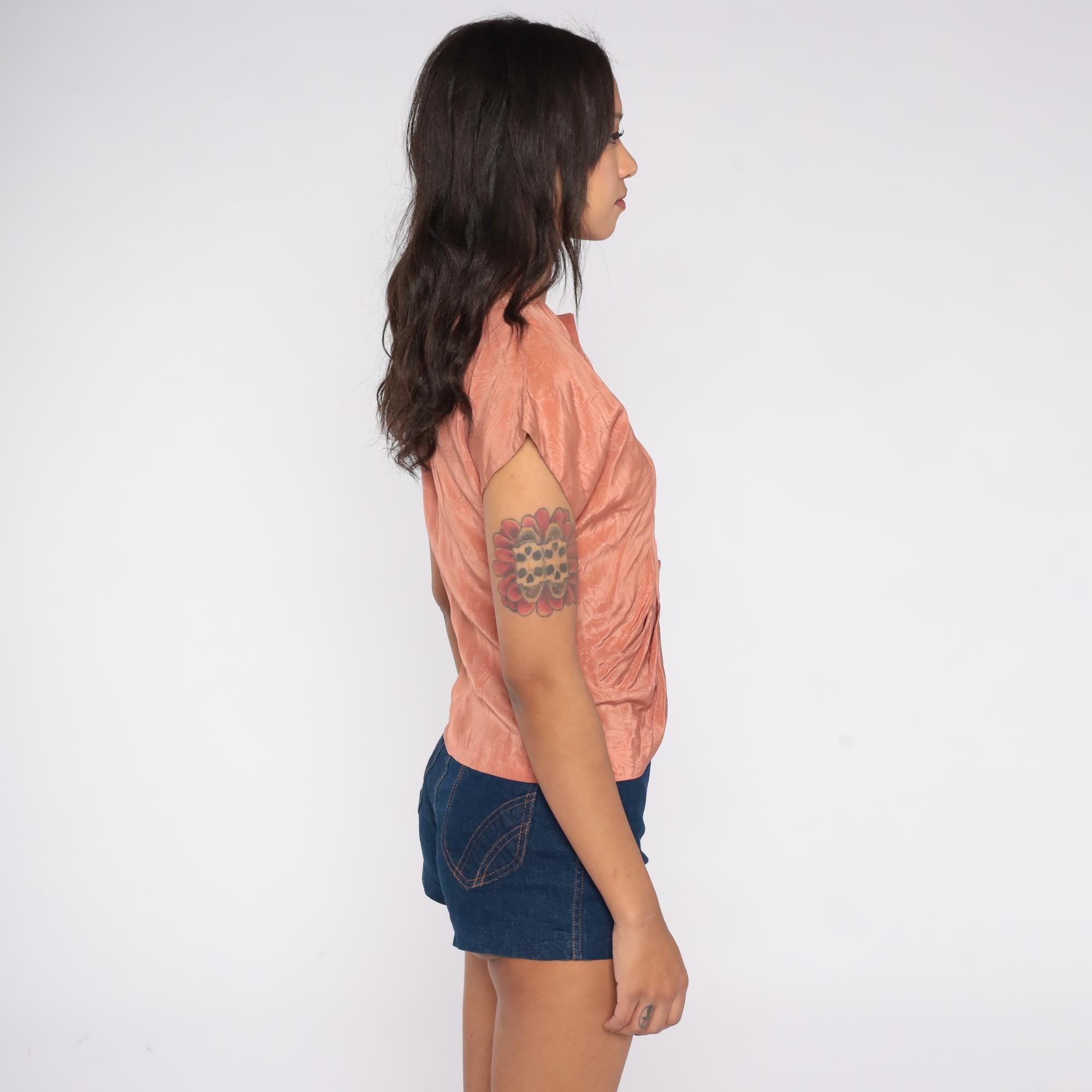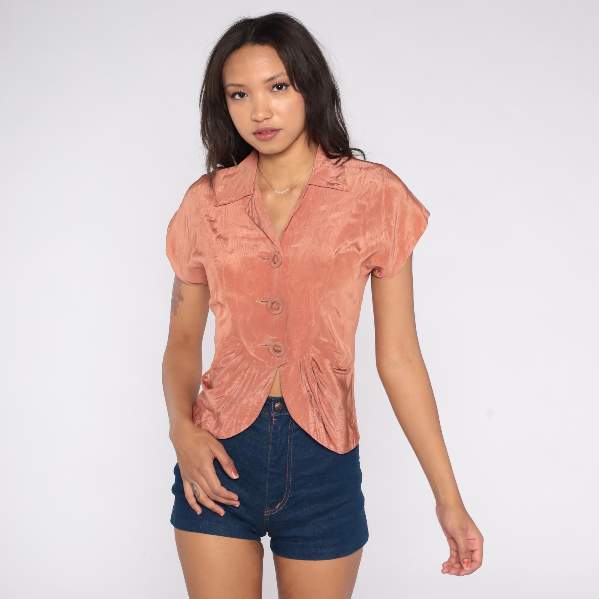 1940s blouse features coral pink salmon moiré fabric with watered silk effect. Notched collar. Button front with covered buttons. Short sleeves. Fitted bodice. Peplum waist. Gathered detail at waist.