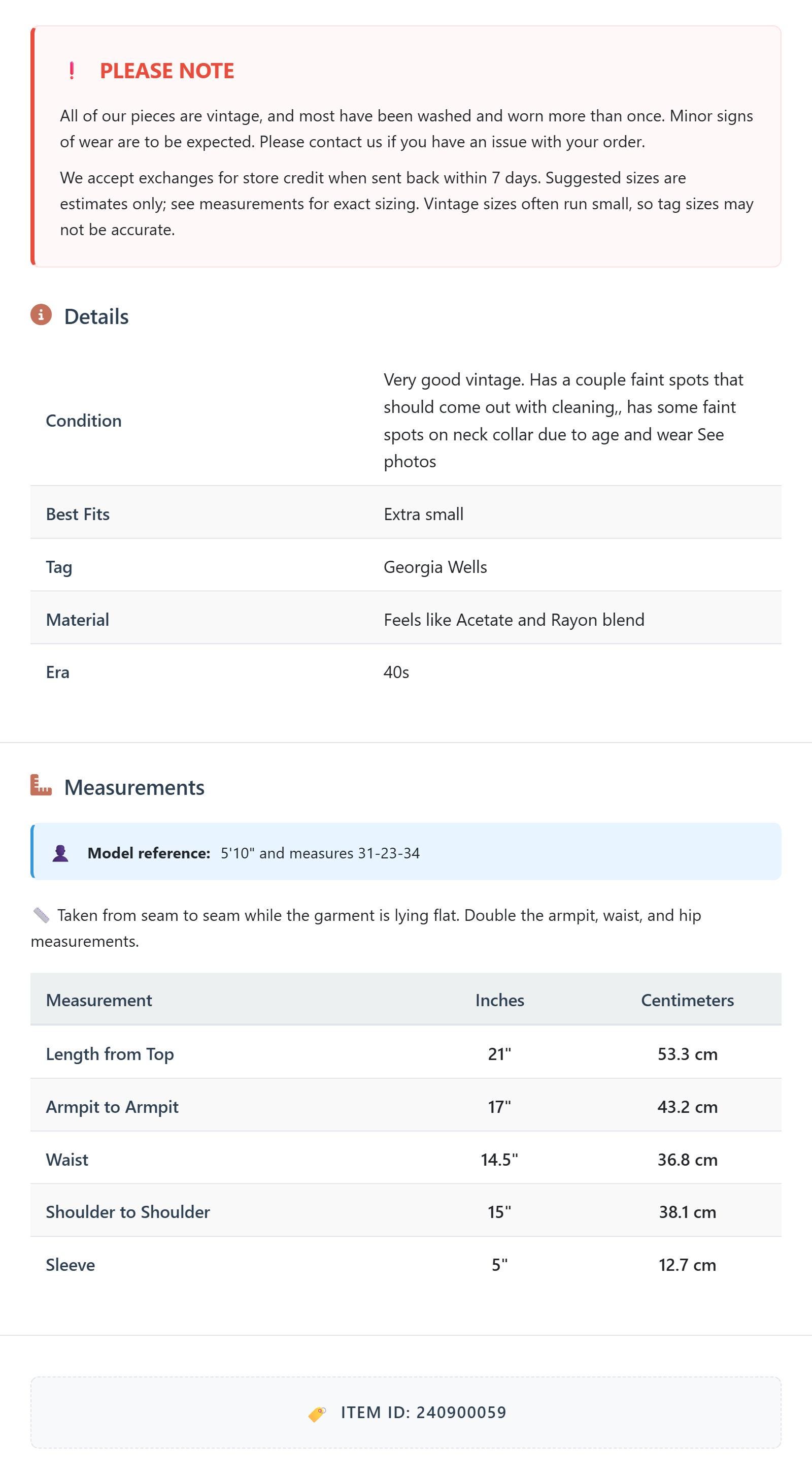 Condition: Very good vintage. Has a couple faint spots that should come out with cleaning,, has some faint spots on neck collar due to age and wear See photos