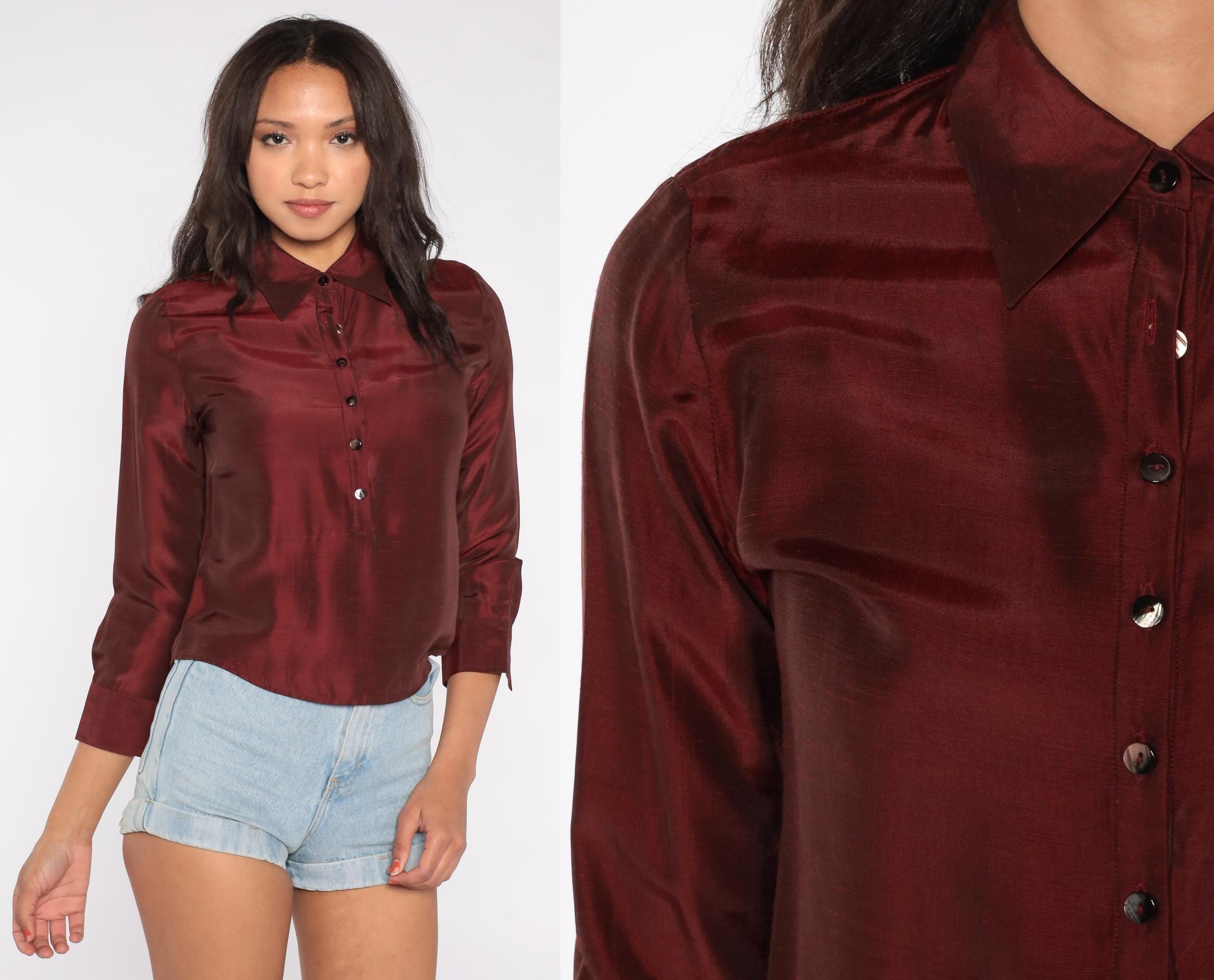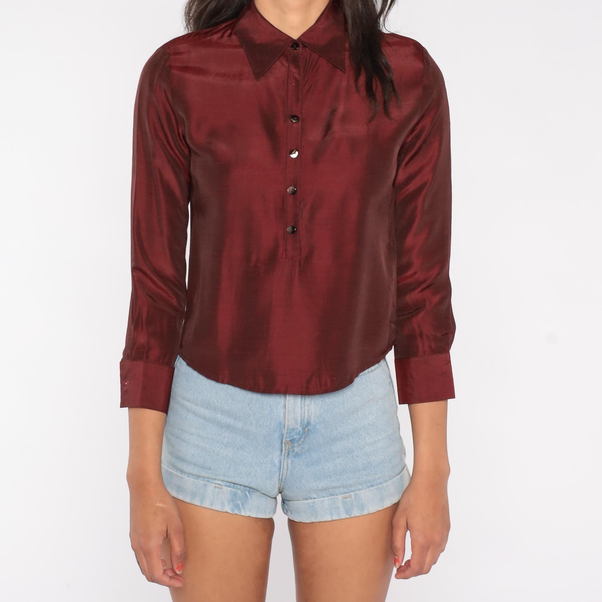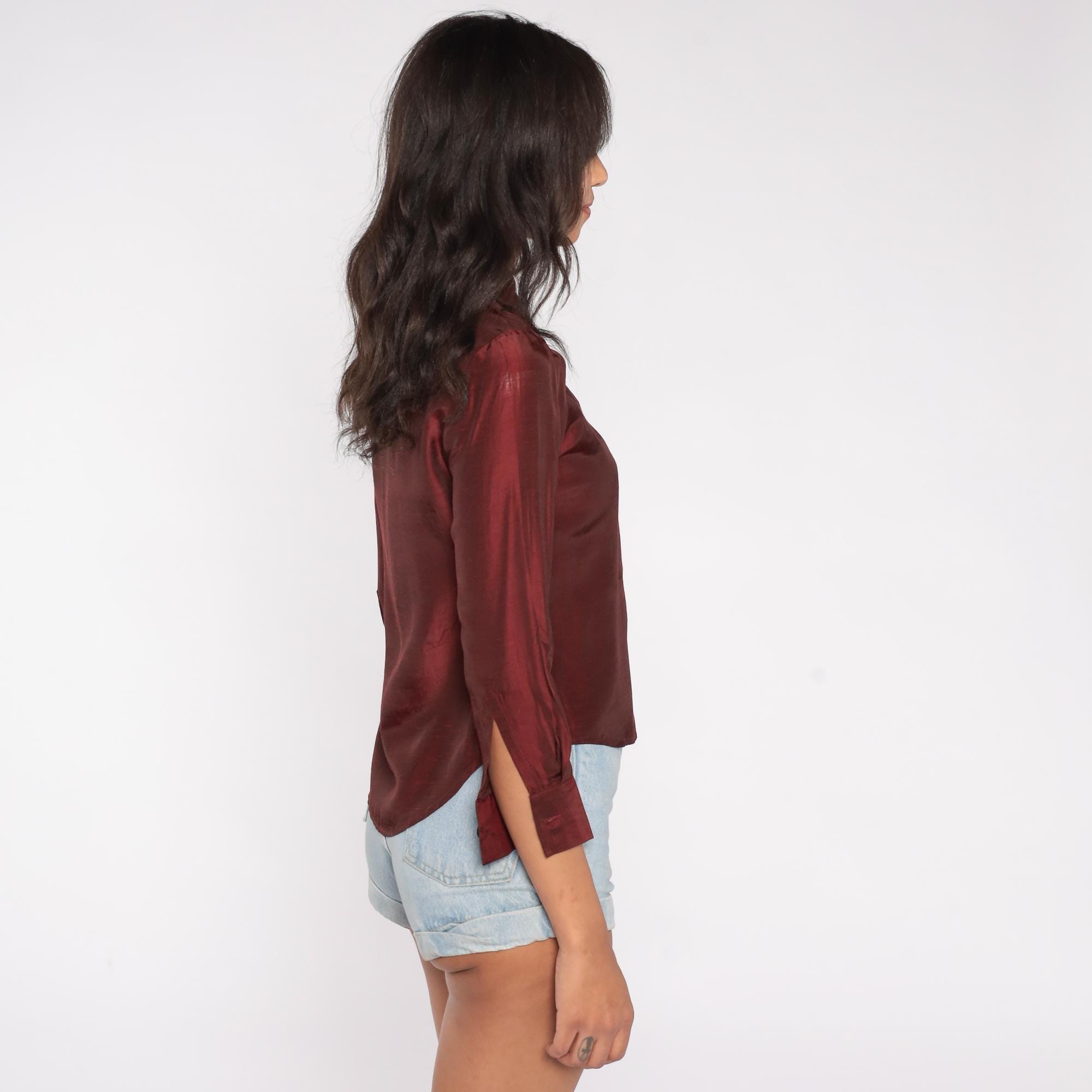 90s Cozzi blouse features a rich burgundy liquid satin with a subtle sheen. The button-down design includes a structured point collar, front placket with coordinating burgundy buttons, and 3/4 length sleeves with button cuffs. Cut in a slightly cropped length with a straight hem.