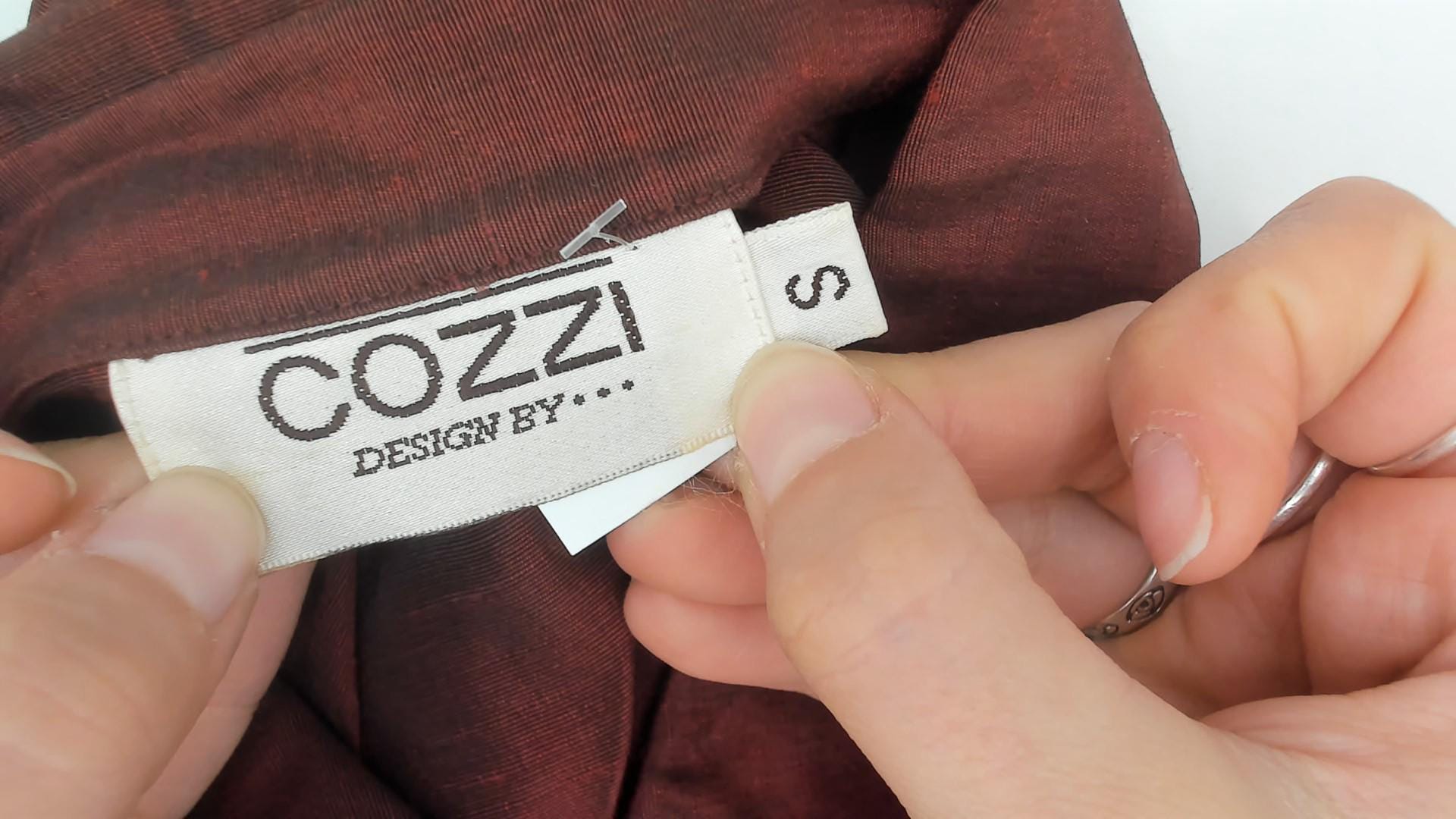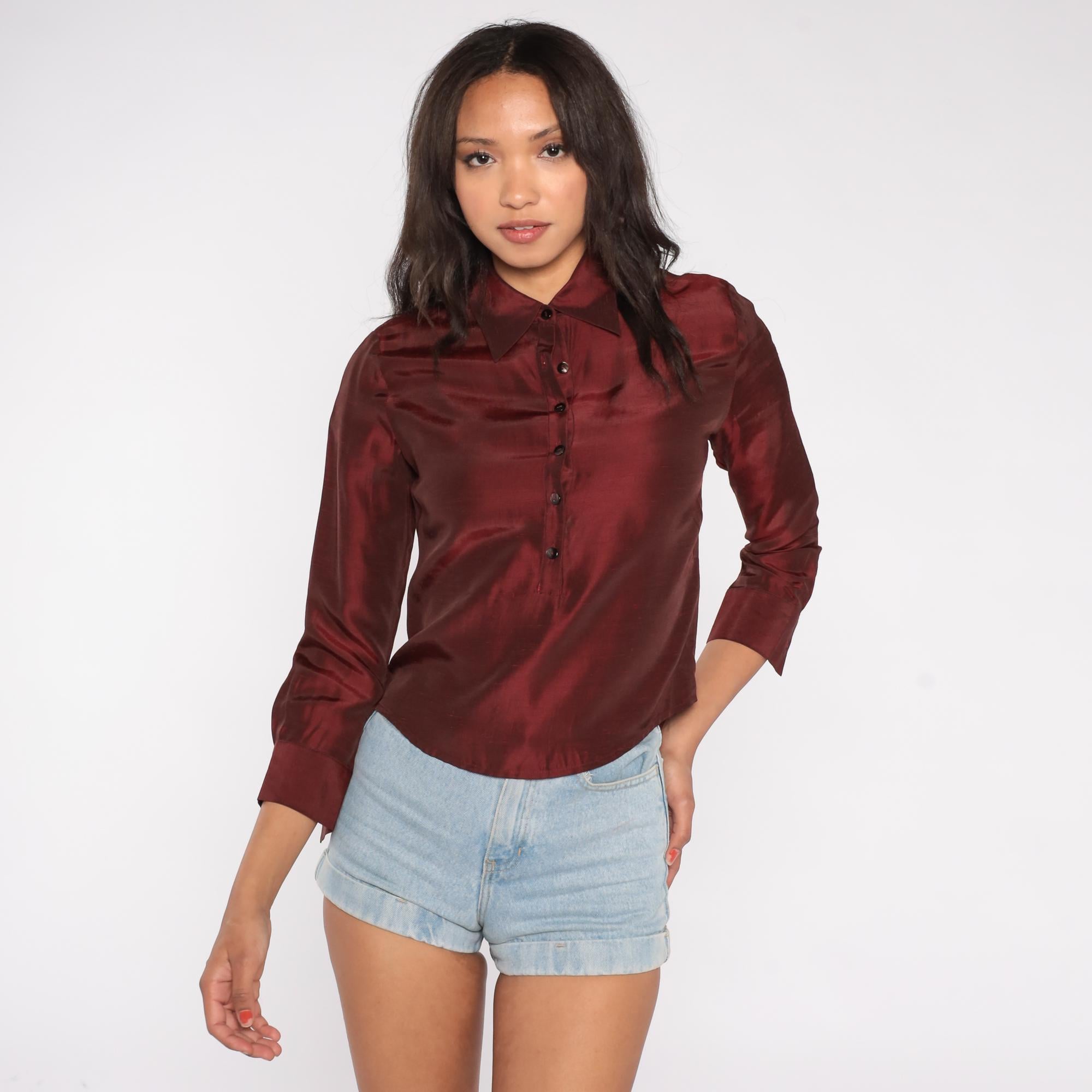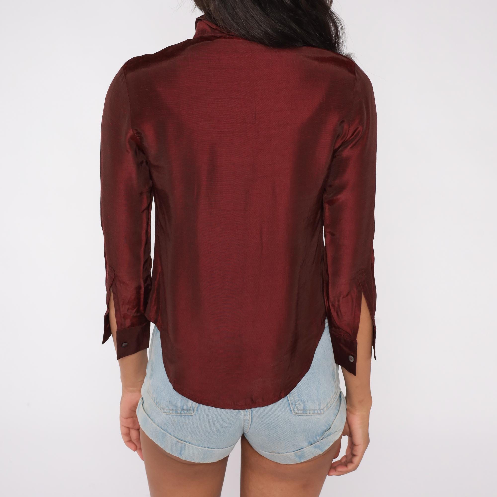 90s Cozzi blouse features a rich burgundy liquid satin with a subtle sheen. The button-down design includes a structured point collar, front placket with coordinating burgundy buttons, and 3/4 length sleeves with button cuffs. Cut in a slightly cropped length with a straight hem.