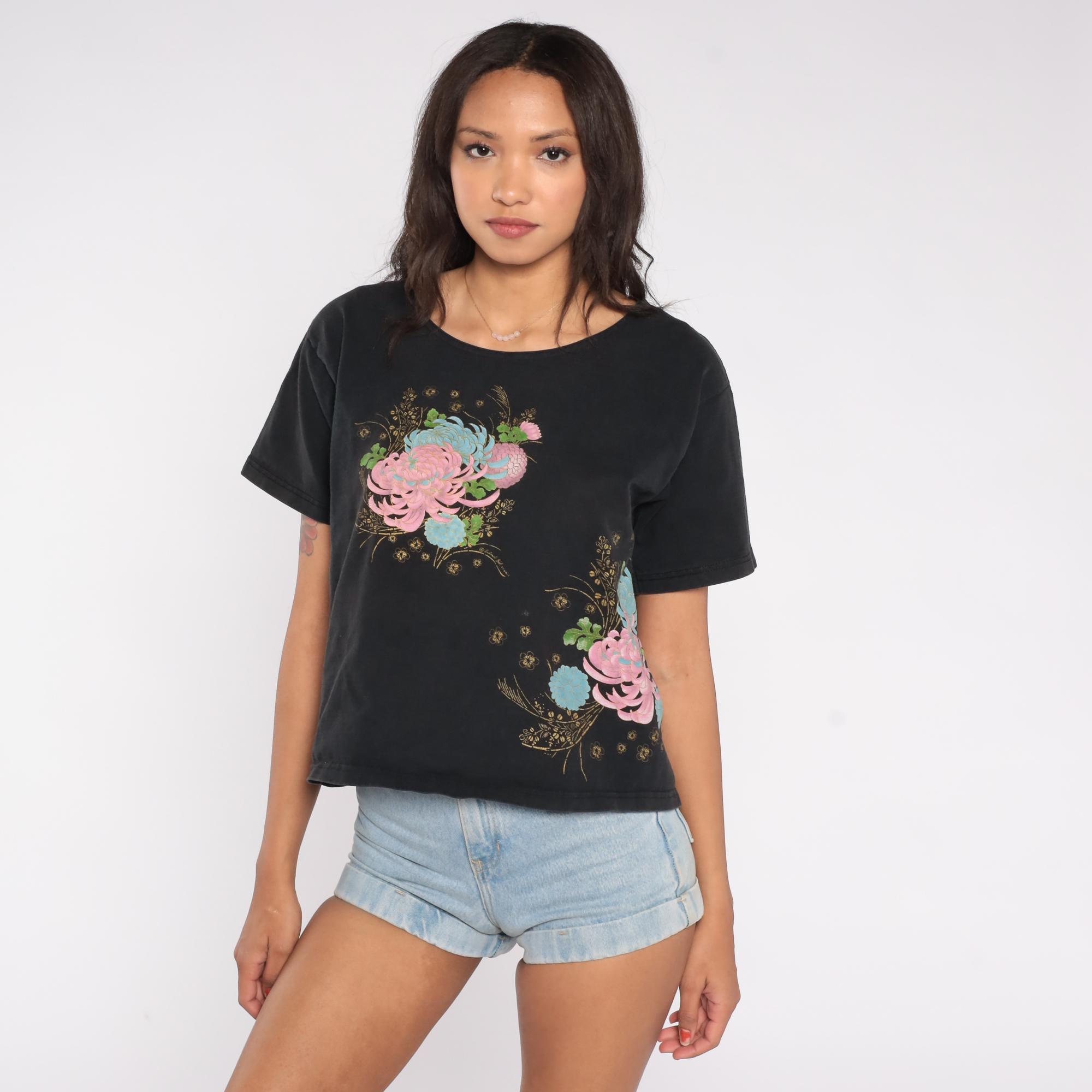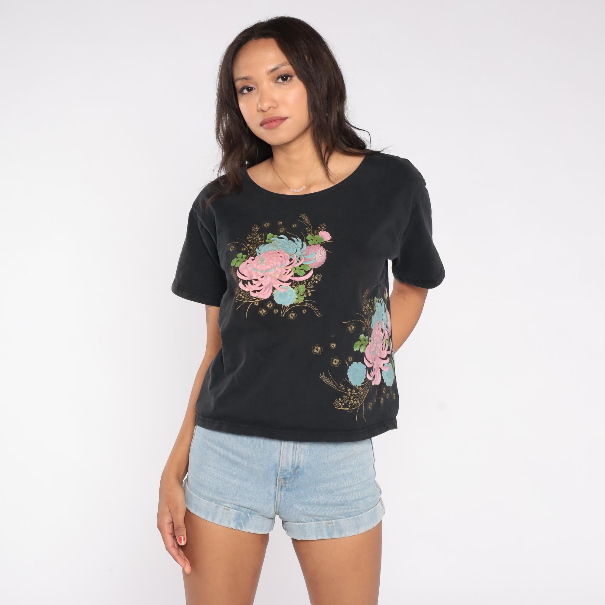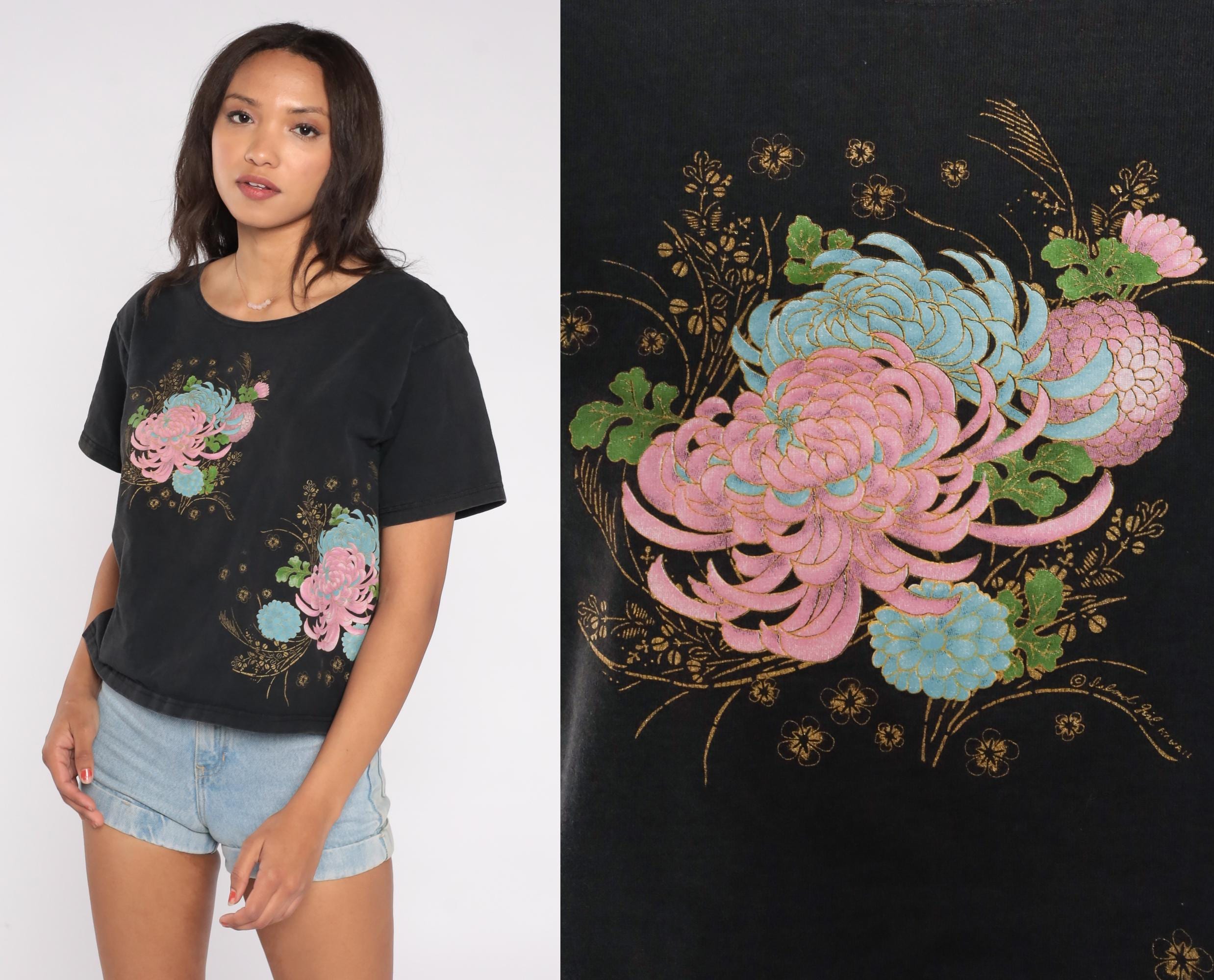 90s t-shirt features beautifully detailed chrysanthemum flowers screen printed on black cotton. The artistic design showcases pink and powder blue blooms with green foliage, accented with delicate gold metallic outline details. Two floral clusters are positioned on the front. The classic silhouette includes a relaxed scoop neckline, short sleeves, and a slightly cropped, boxy fit.