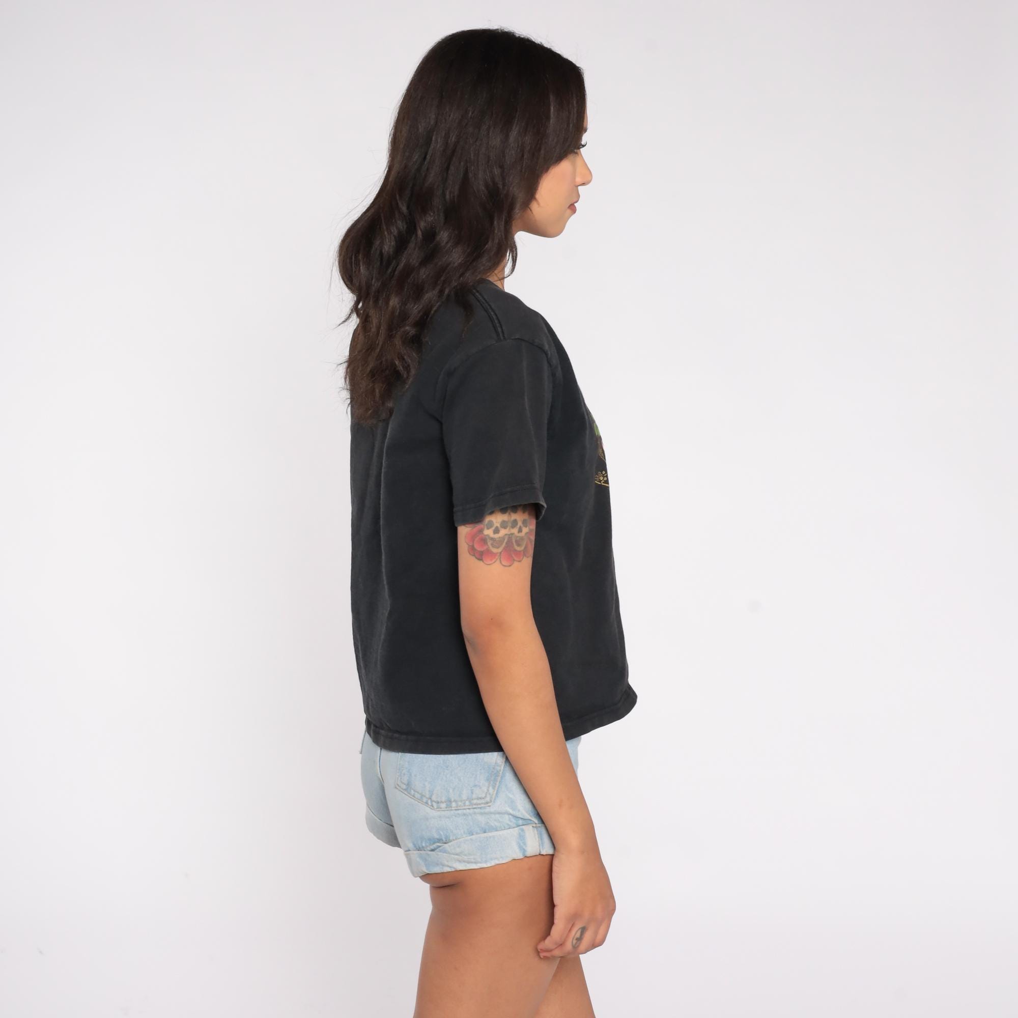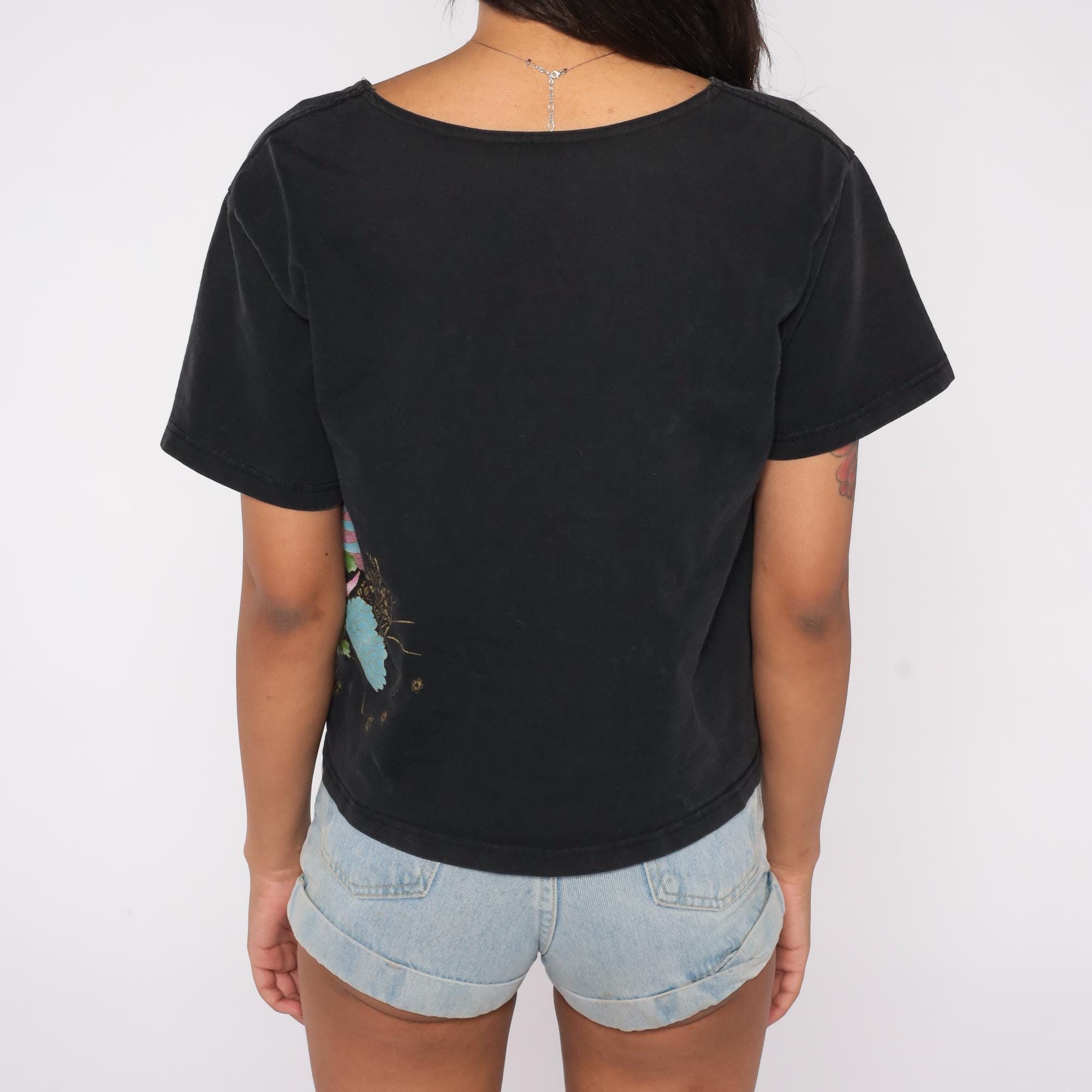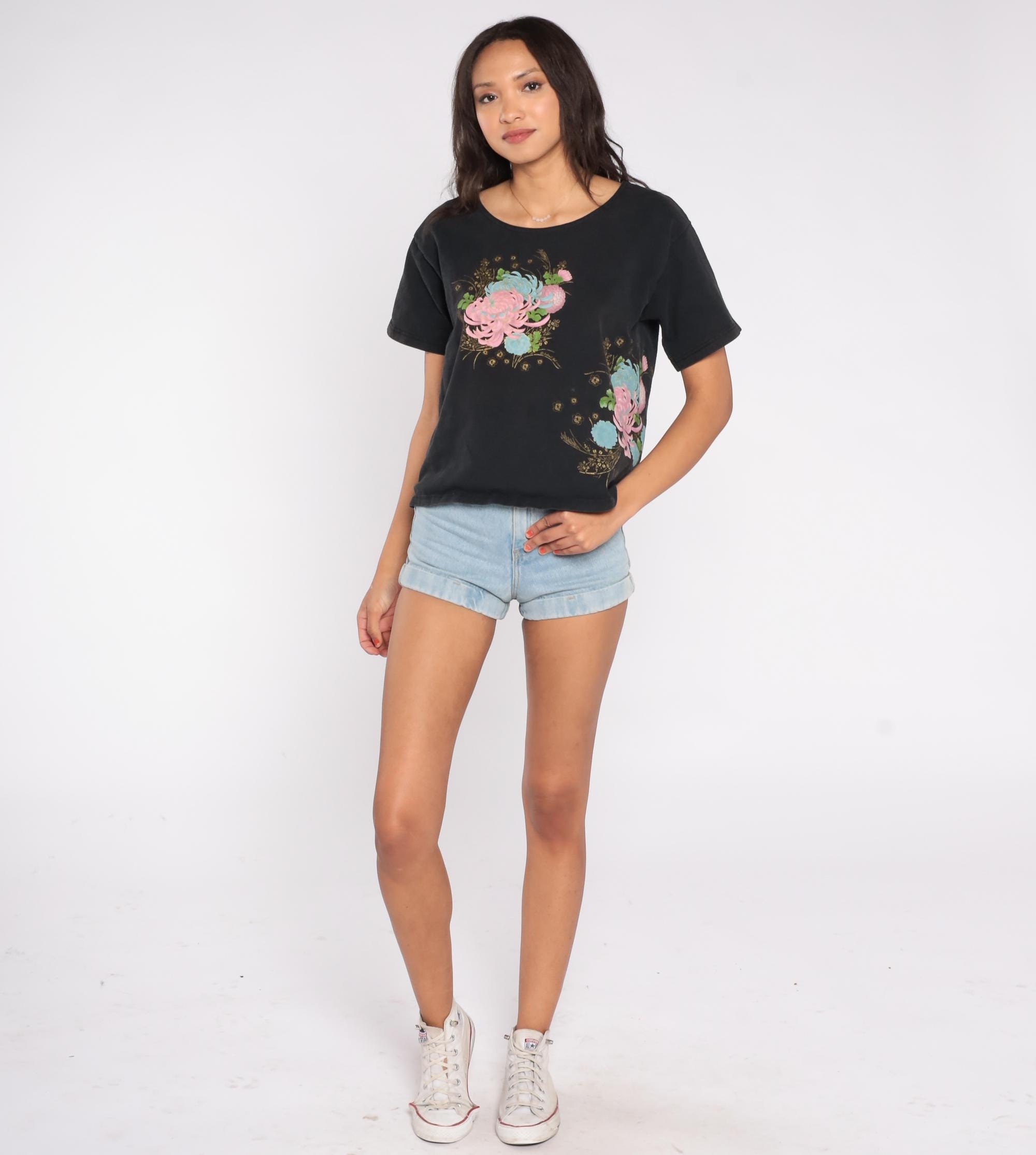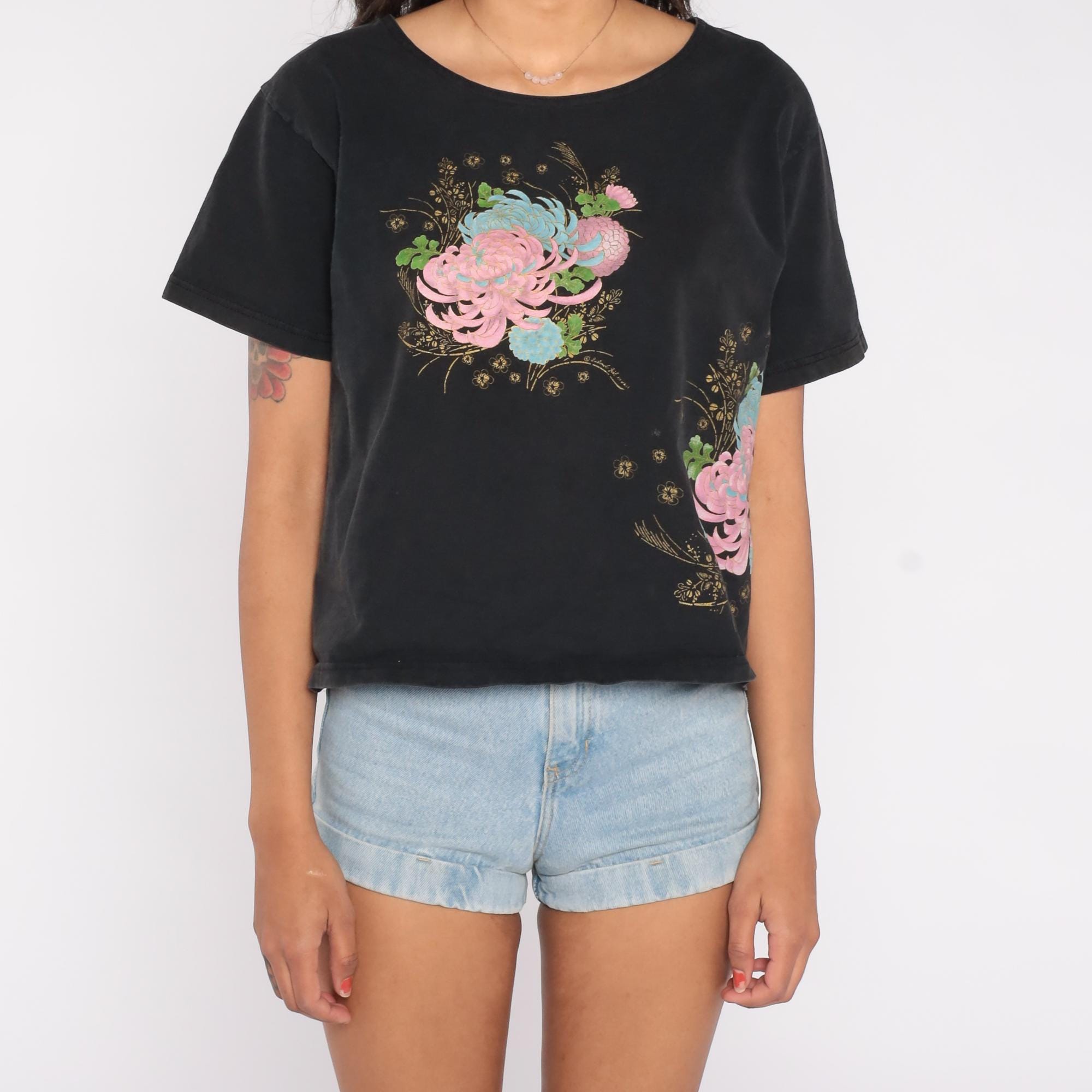 90s t-shirt features beautifully detailed chrysanthemum flowers screen printed on black cotton. The artistic design showcases pink and powder blue blooms with green foliage, accented with delicate gold metallic outline details. Two floral clusters are positioned on the front. The classic silhouette includes a relaxed scoop neckline, short sleeves, and a slightly cropped, boxy fit.