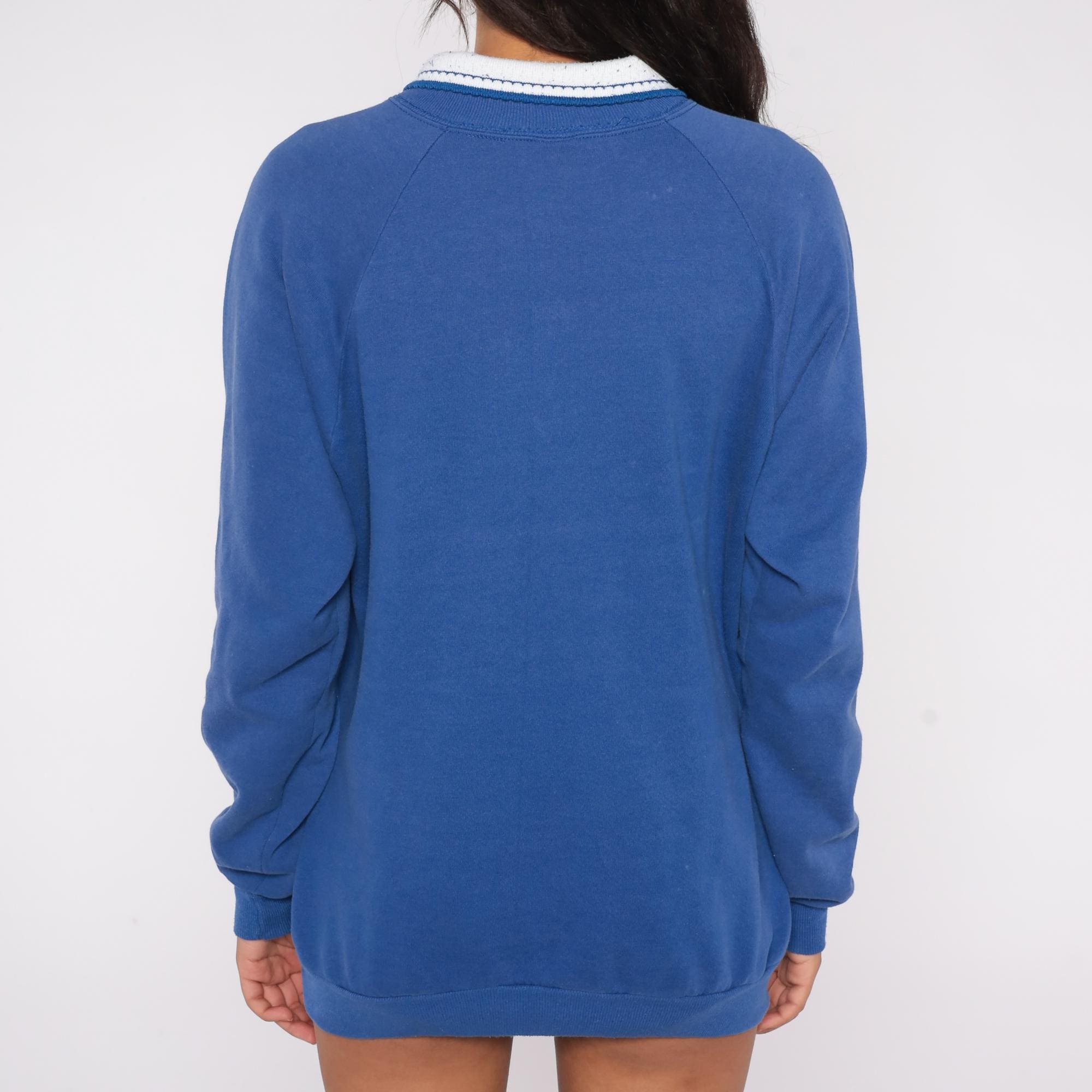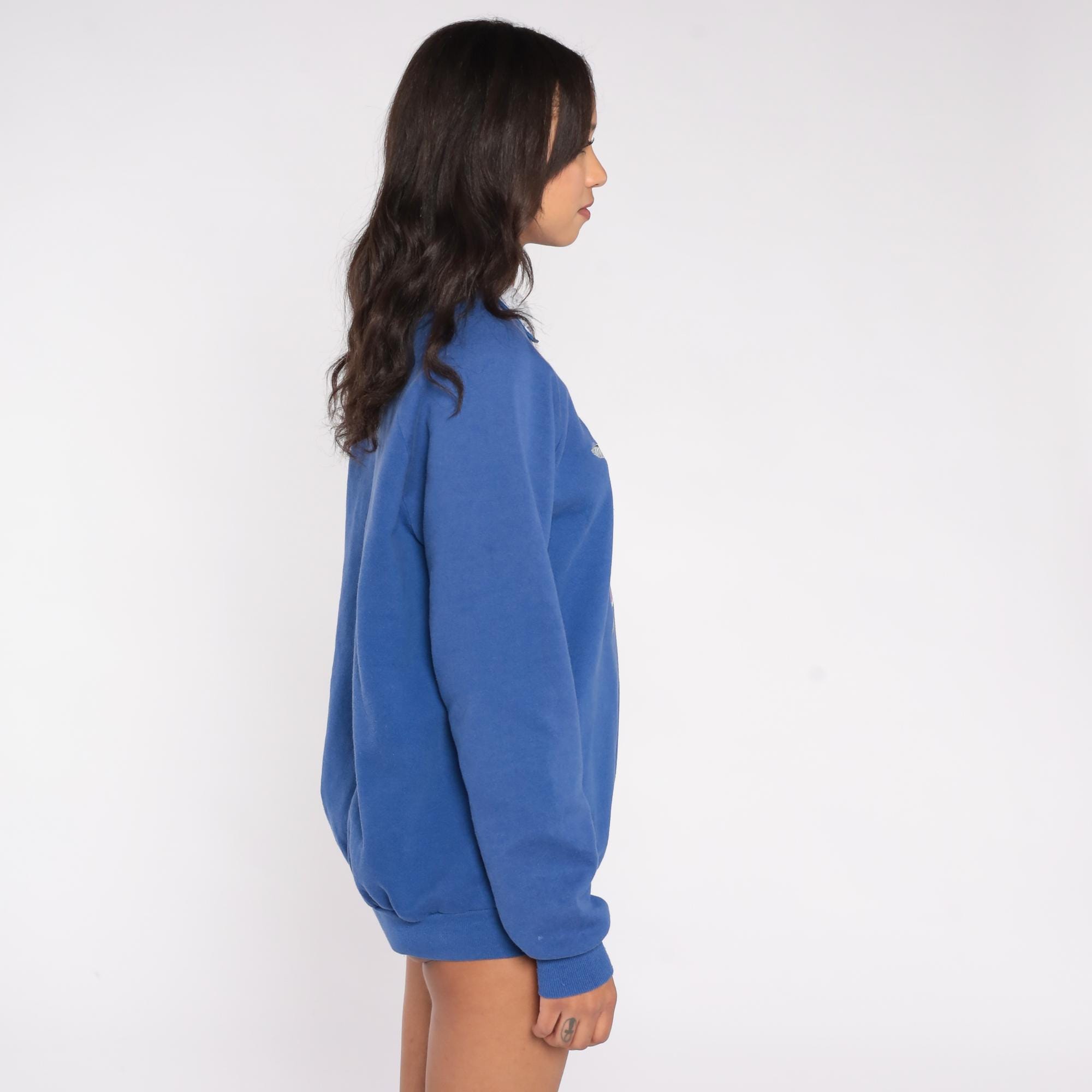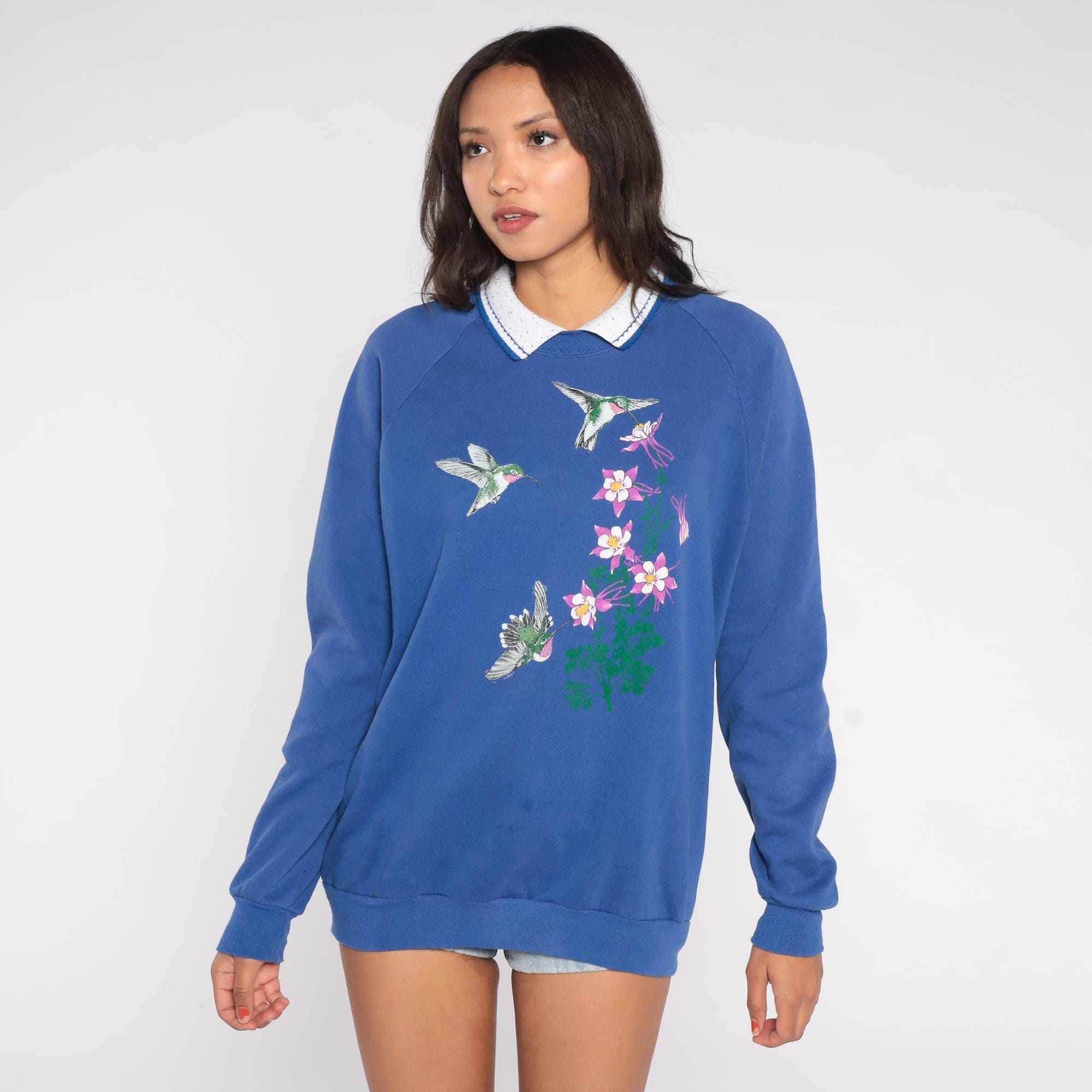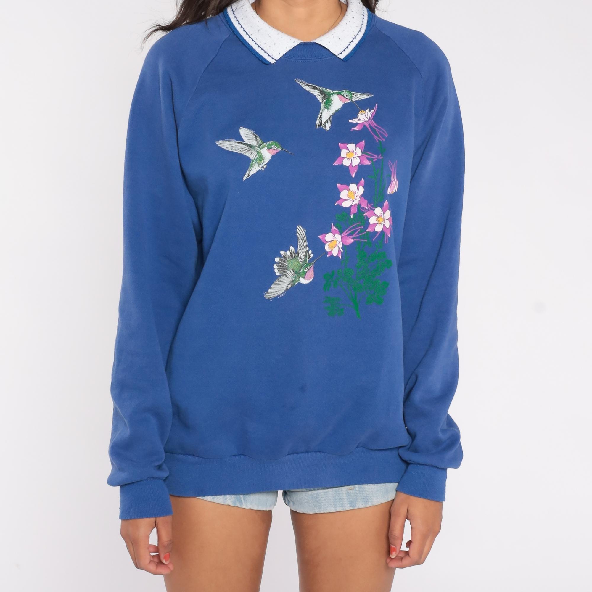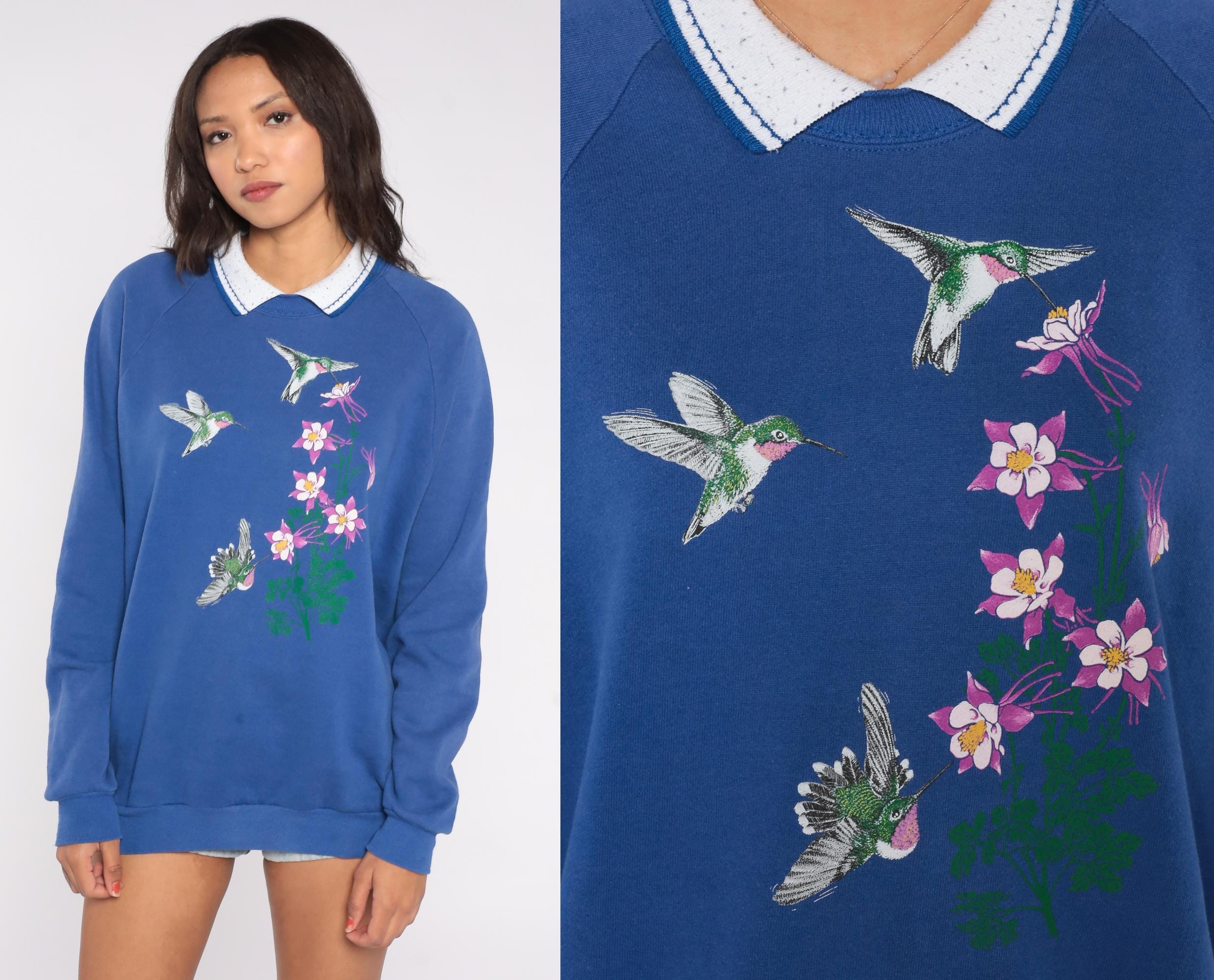 90s sweatshirt features a beautiful screen-printed design of three detailed hummingbirds hovering around pink columbine flowers with green stems. The vibrant royal blue background makes the emerald green, pink, and white elements pop with excellent detail in the birds' feathers and flower petals.