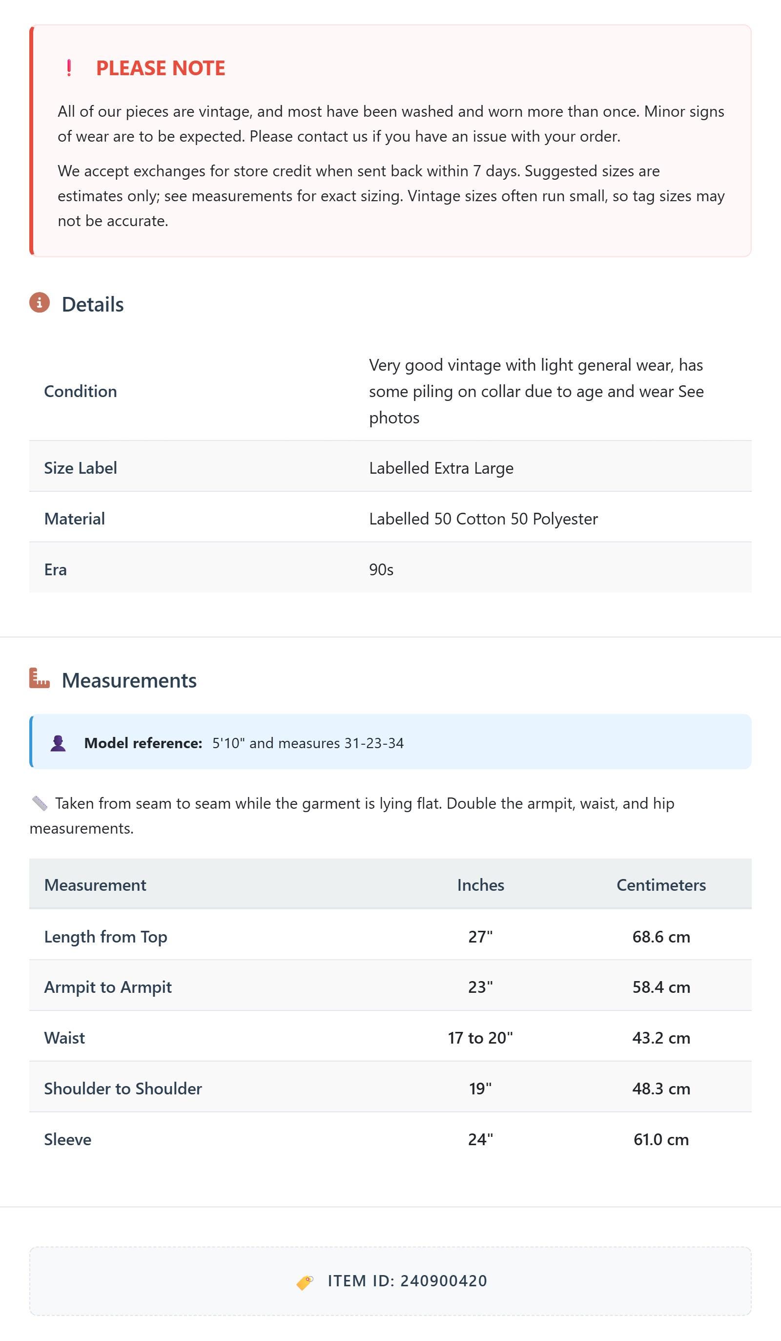 All of our pieces are vintage, and most have been washed and worn more than once. Minor signs of wear are to be expected. Please contact us if you have an issue with your order. We accept exchanges for store credit when sent back within 7 days.