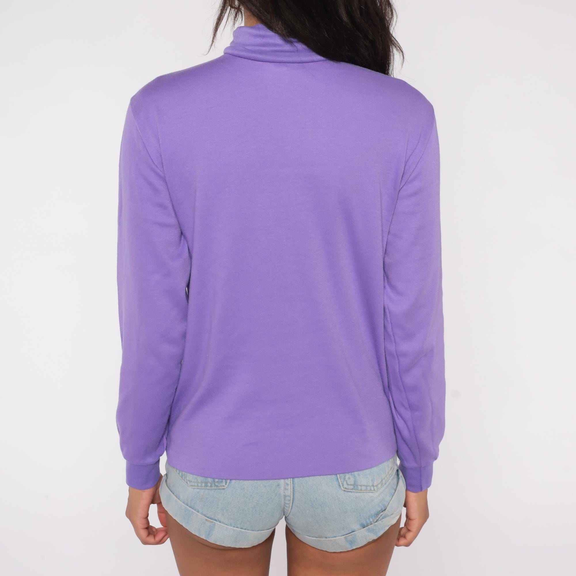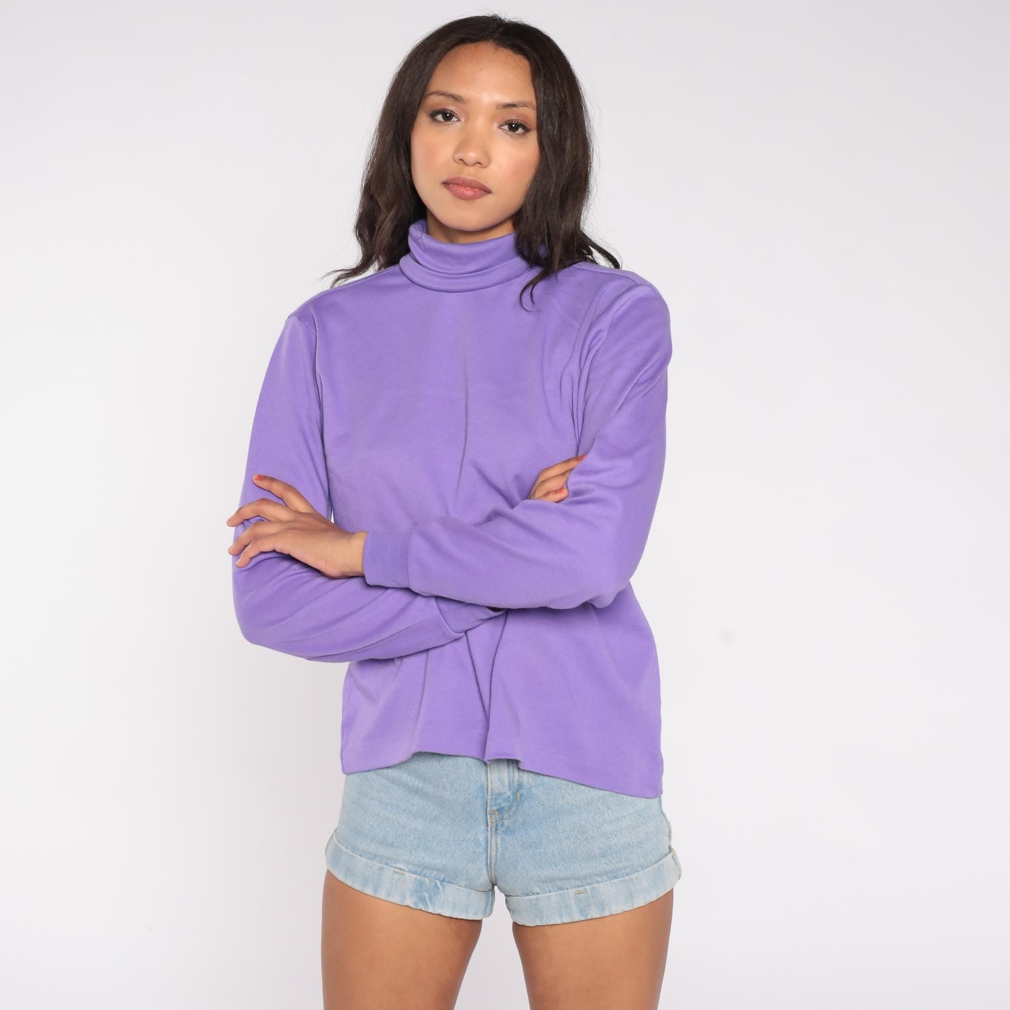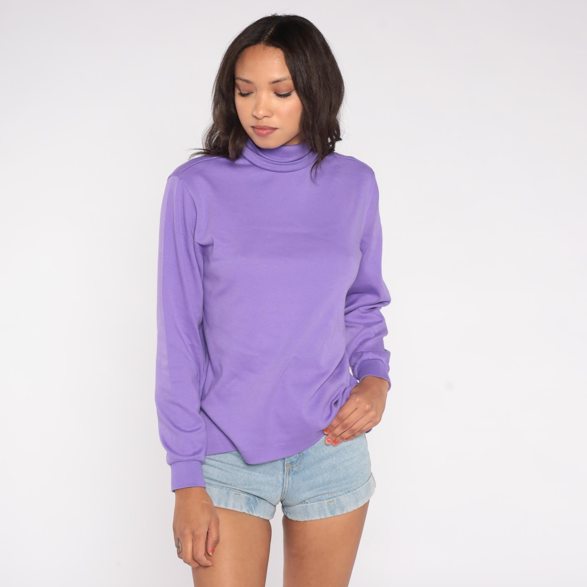 90s Land’s End turtleneck shirt in lavender cotton-poly blend knit. Features a mock neck collar, long sleeves, and a straight hem.