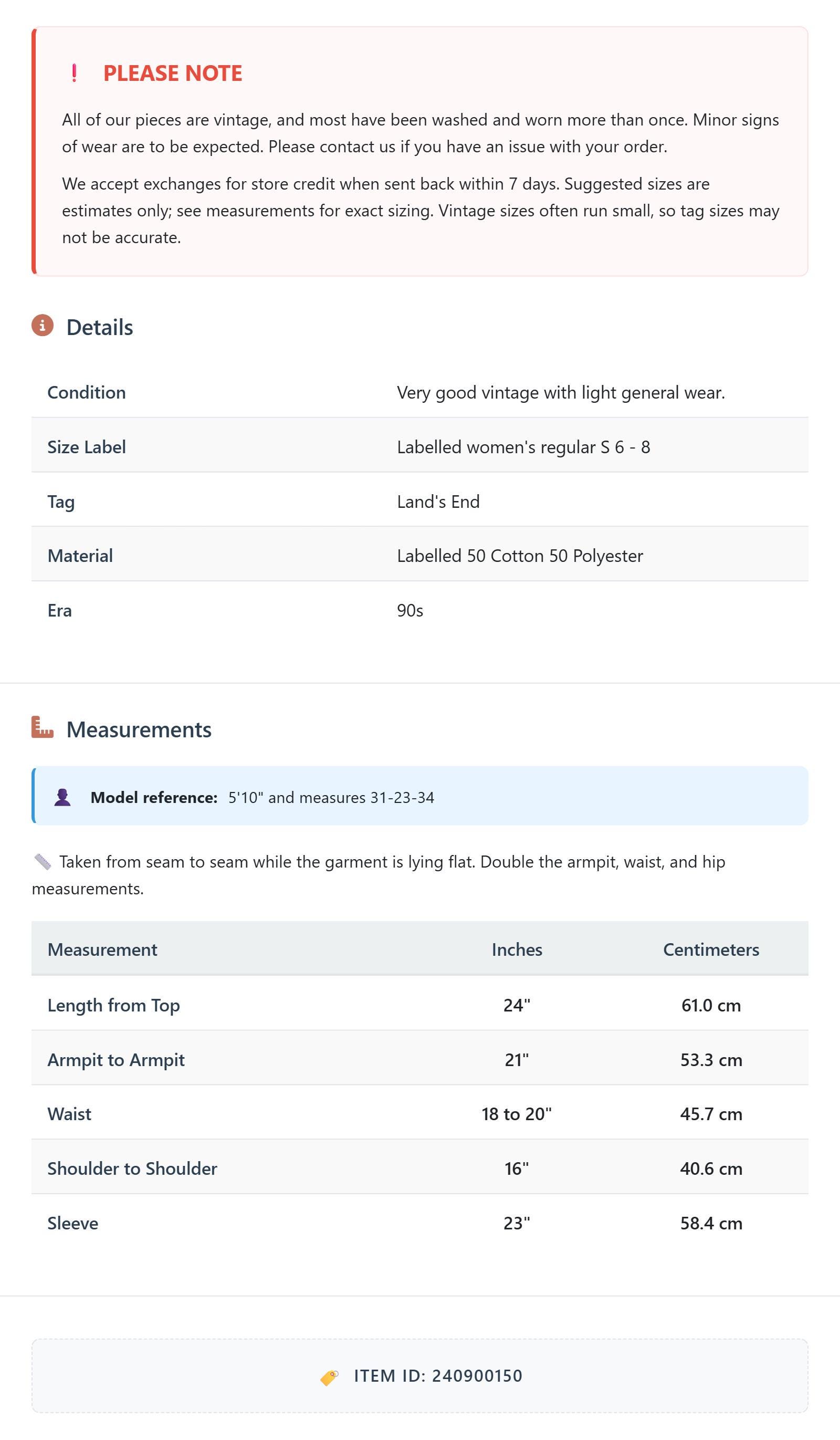 Suggested sizes are estimates only; see measurements for exact sizing. Vintage sizes often run small, so tag sizes may not be accurate.
