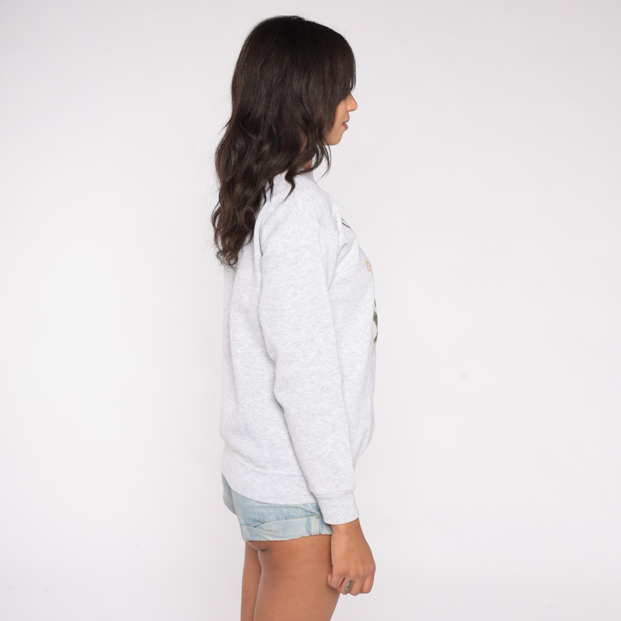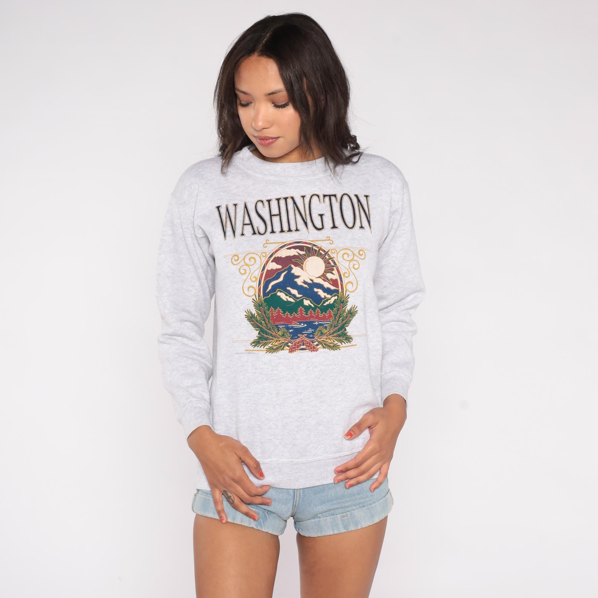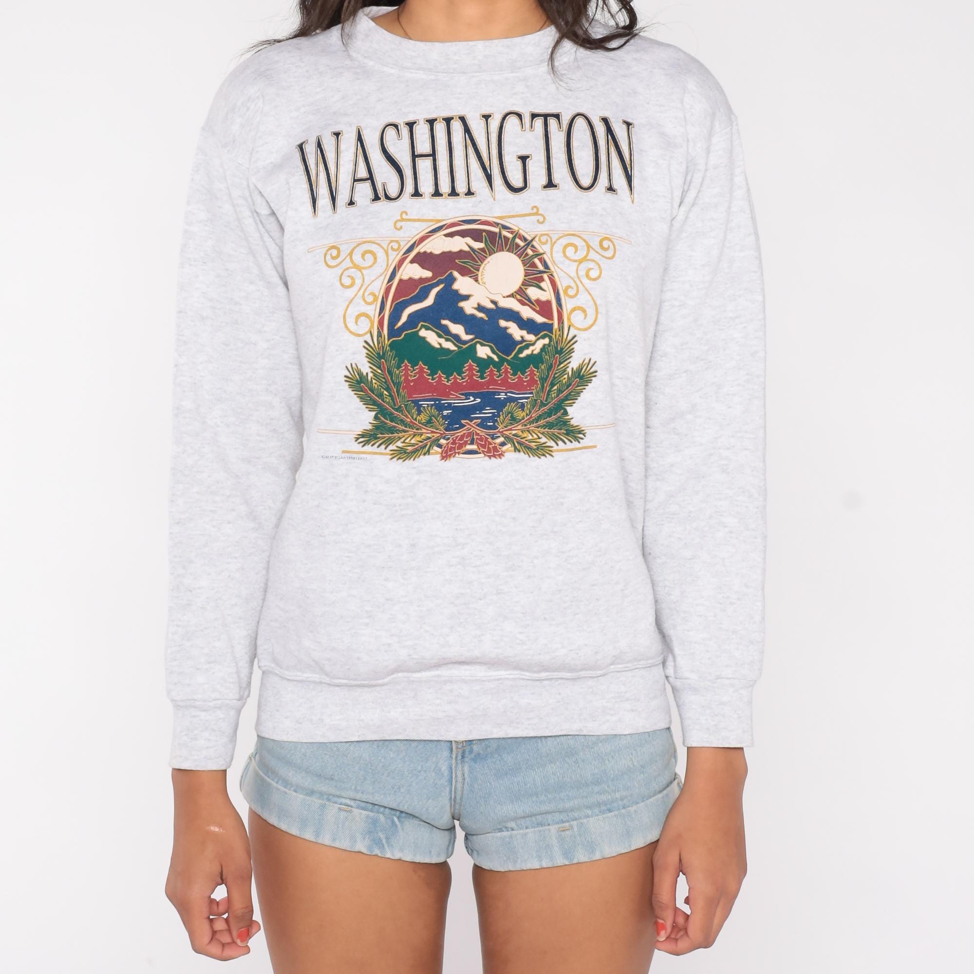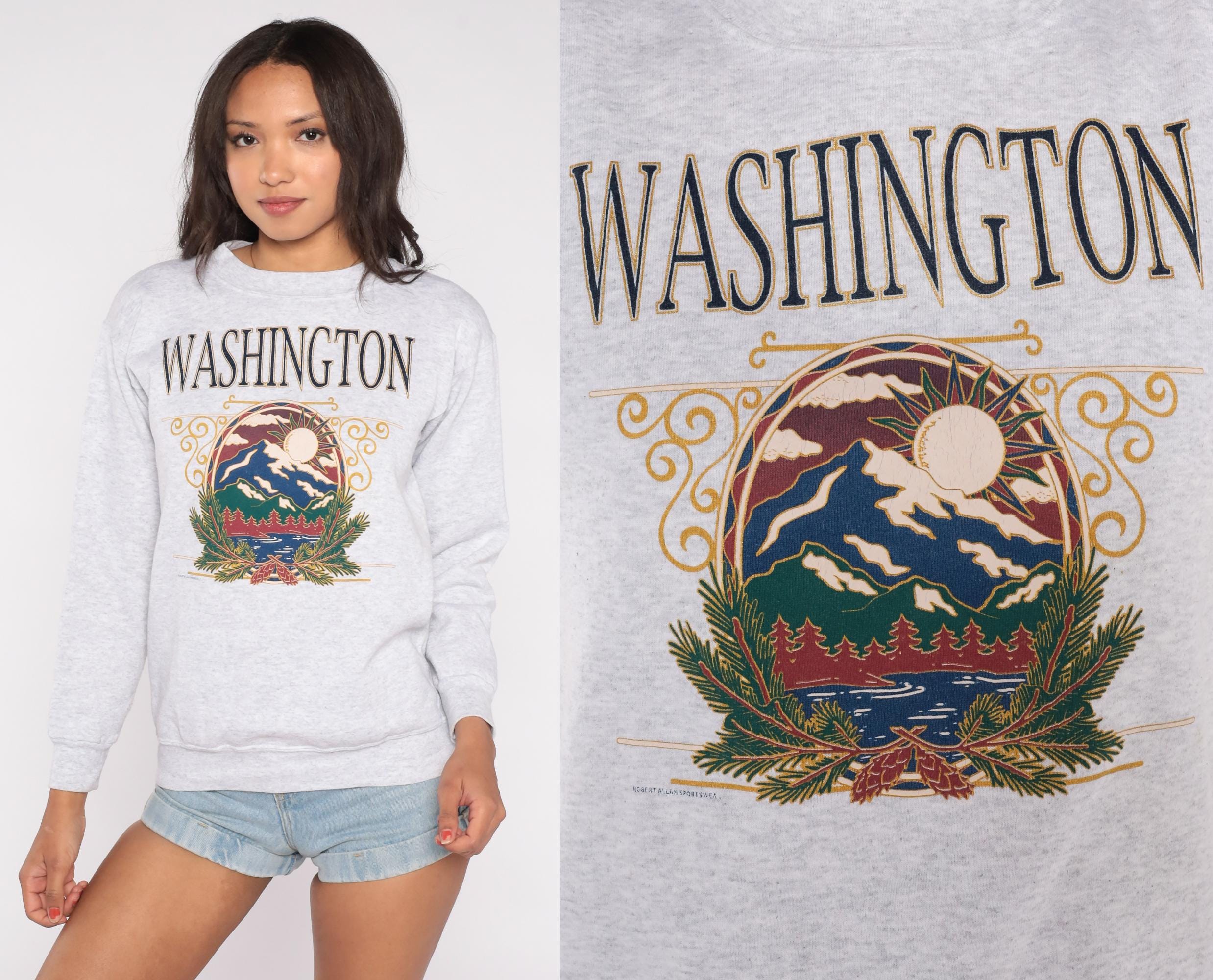90s Murina sweatshirt featuring a bold Washington state graphic with mountain, river, and sun illustration. Classic crewneck with ribbed cuffs and waistband.