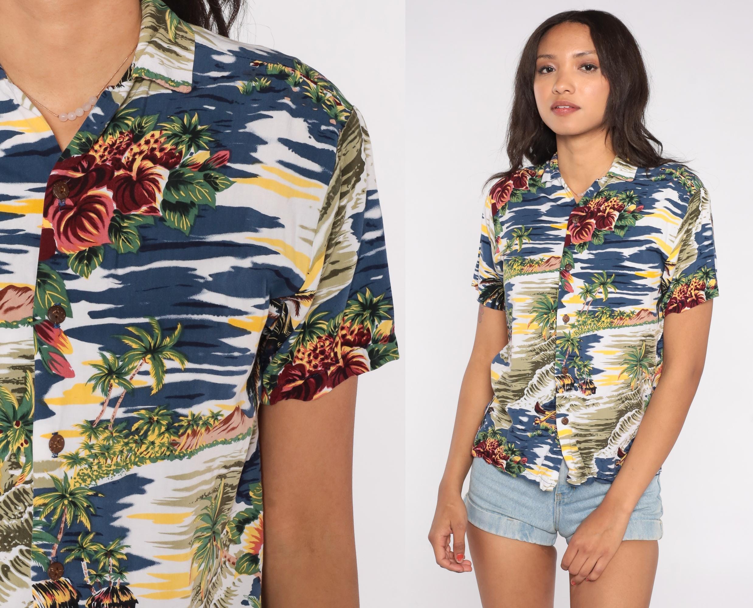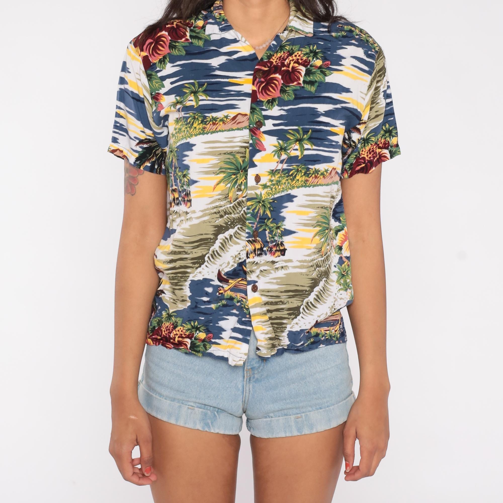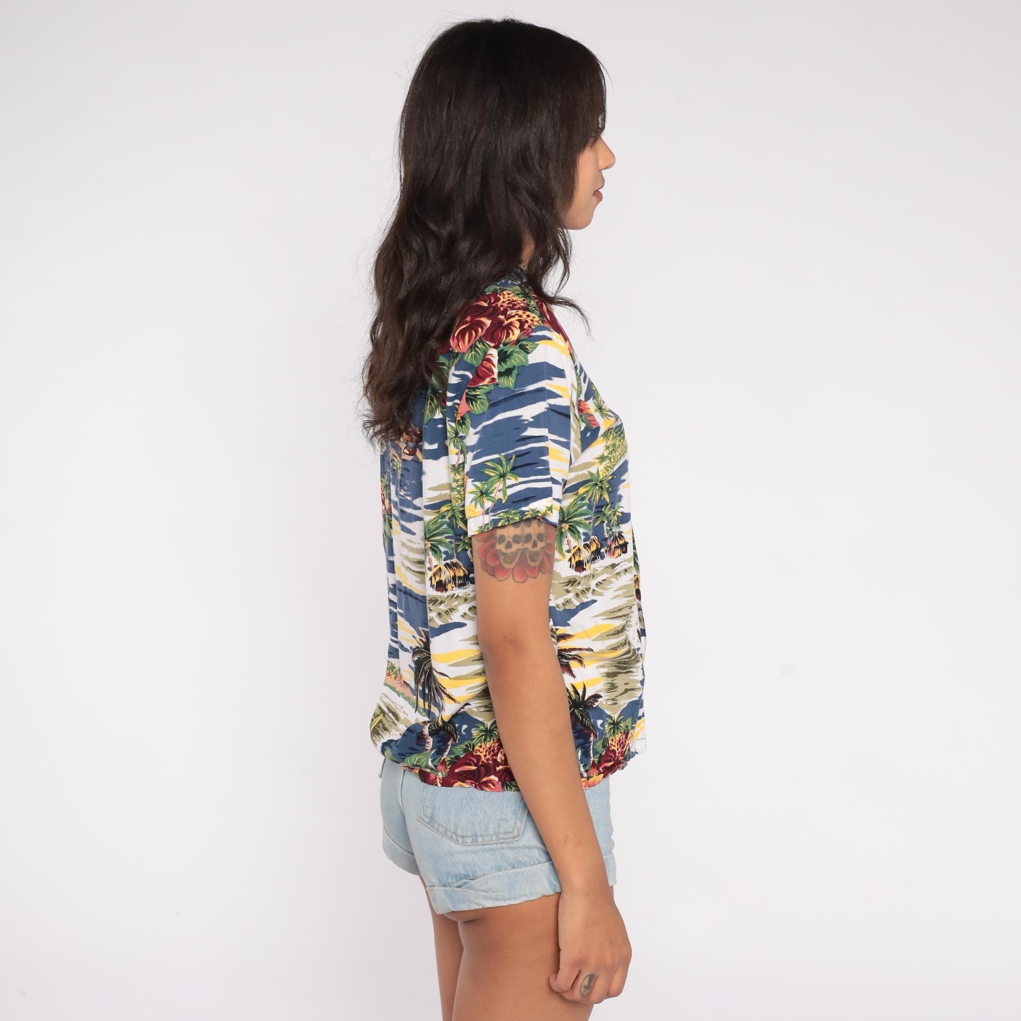 Y2K Hilo Hattie Hawaiian shirt made from soft rayon fabric with a bold tropical island print. Features palm trees, hibiscus flowers, and ocean waves in shades of blue, red, and yellow. Includes short sleeves, button front closure, and a relaxed fit.