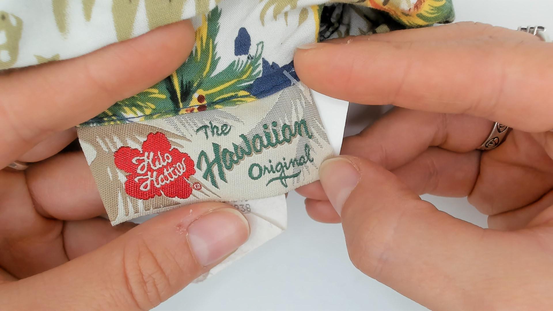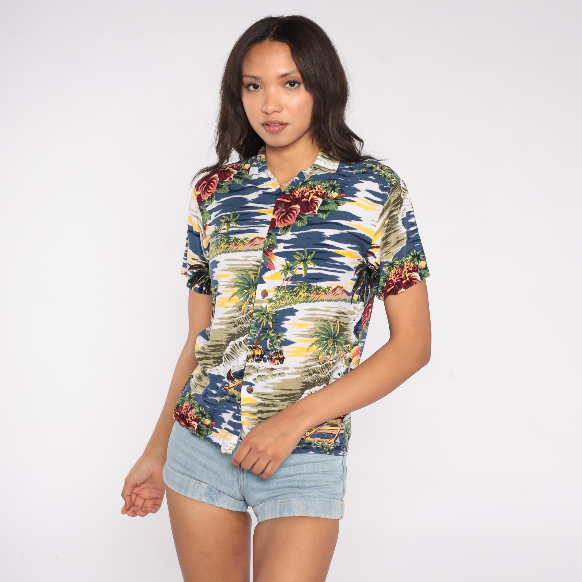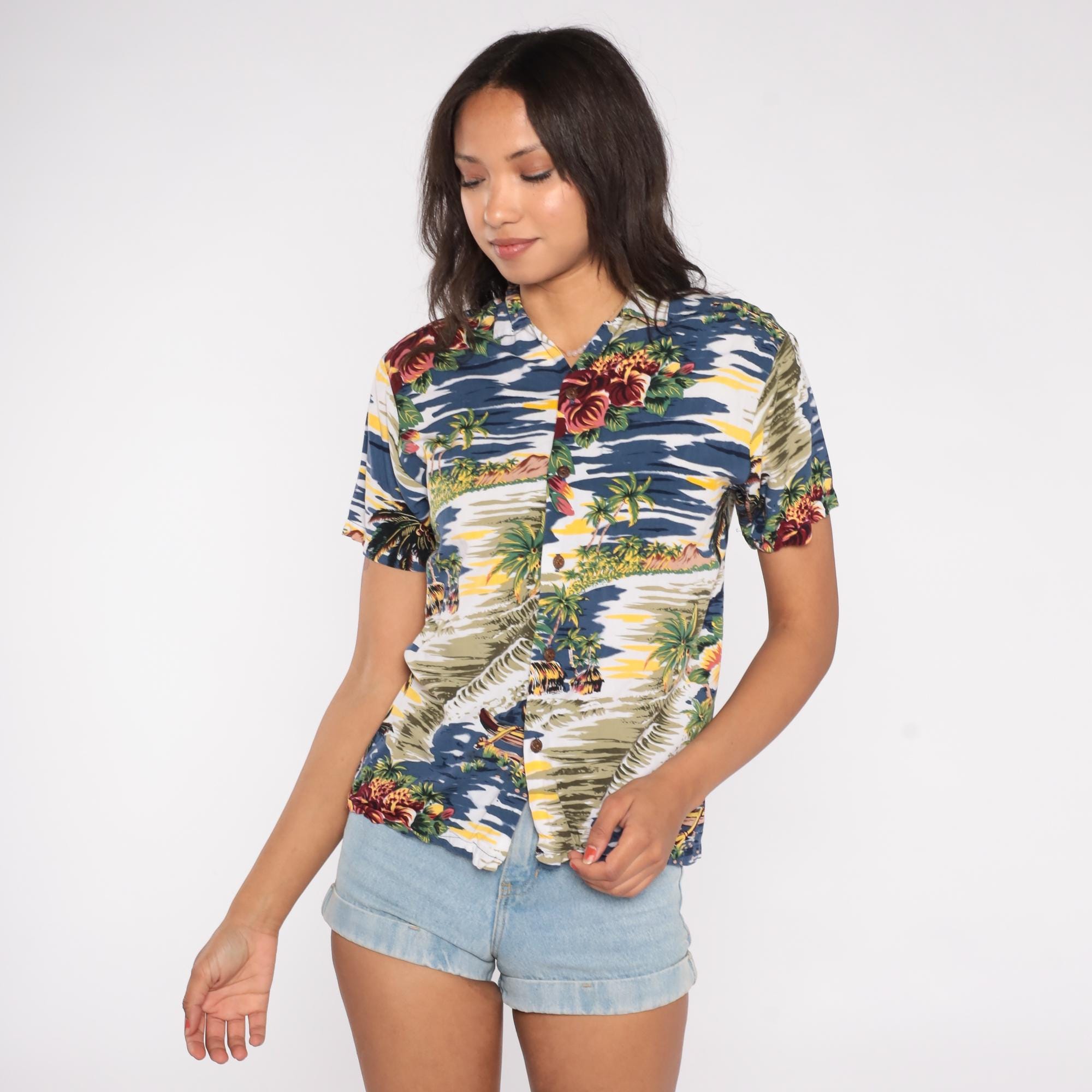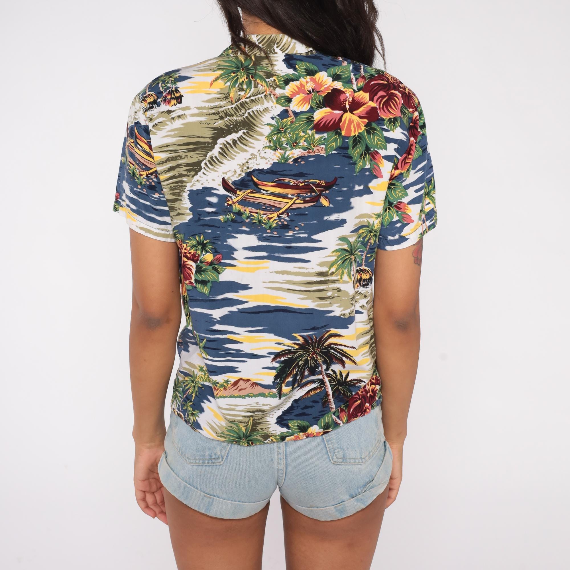 Y2K Hilo Hattie Hawaiian shirt made from soft rayon fabric with a bold tropical island print. Features palm trees, hibiscus flowers, and ocean waves in shades of blue, red, and yellow. Includes short sleeves, button front closure, and a relaxed fit.
