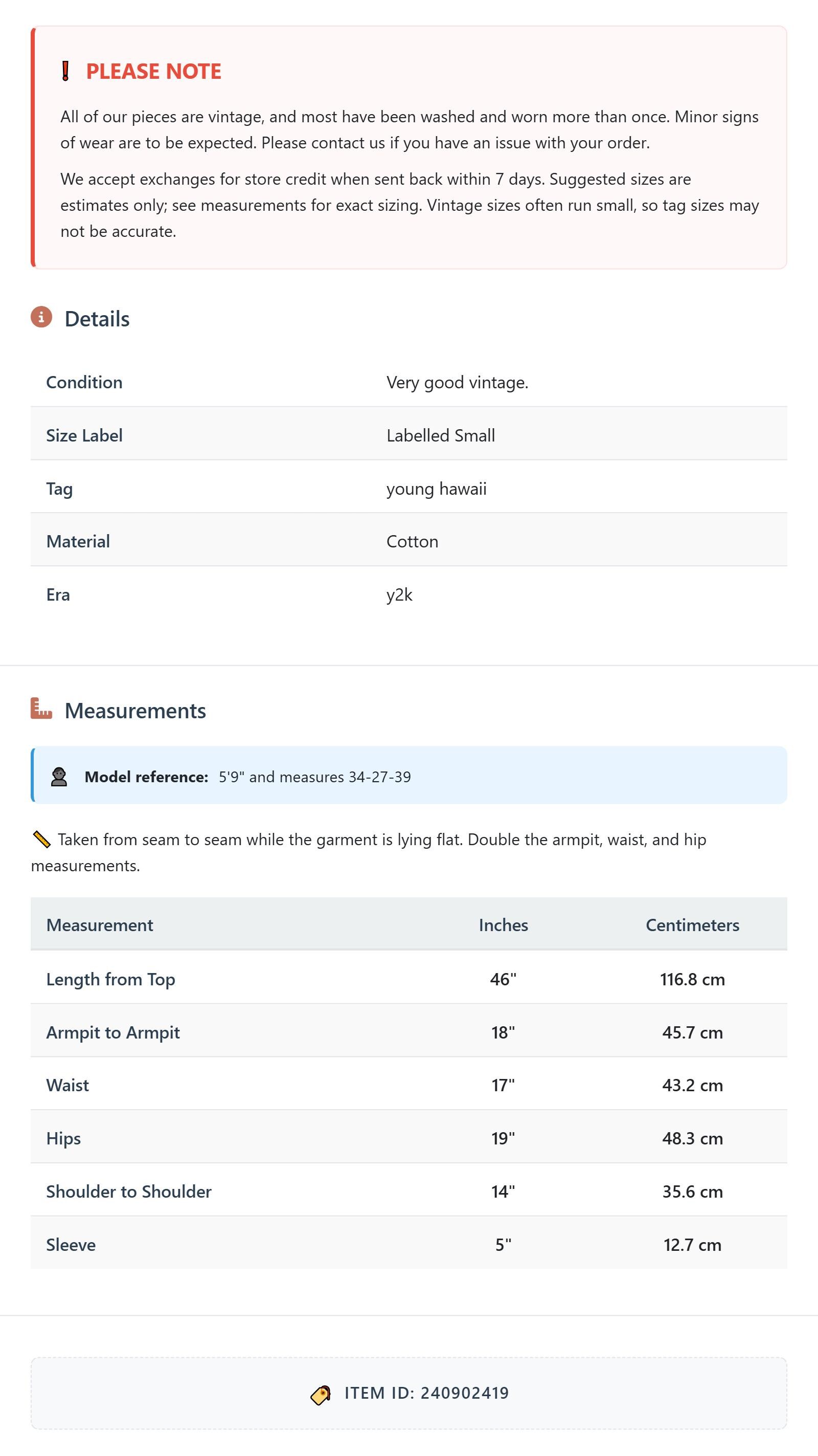 All of our pieces are vintage, and most have been washed and worn more than once. Minor signs of wear are to be expected. Please contact us if you have an issue with your order. We accept exchanges for store credit when sent back within 7 days.