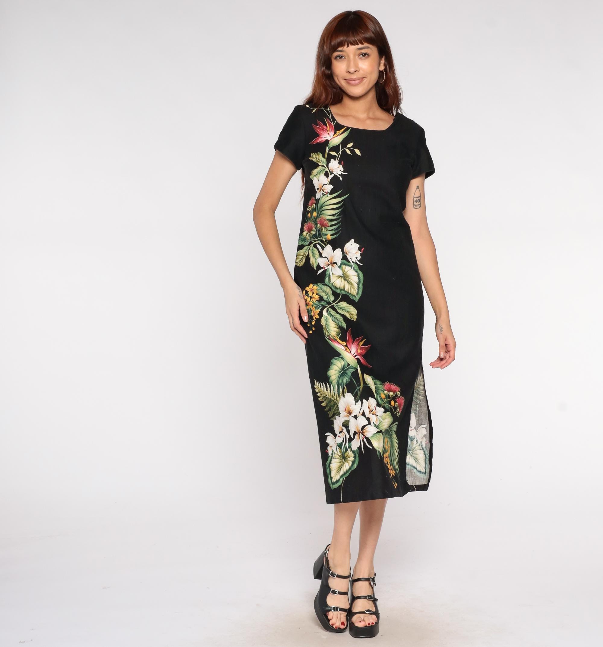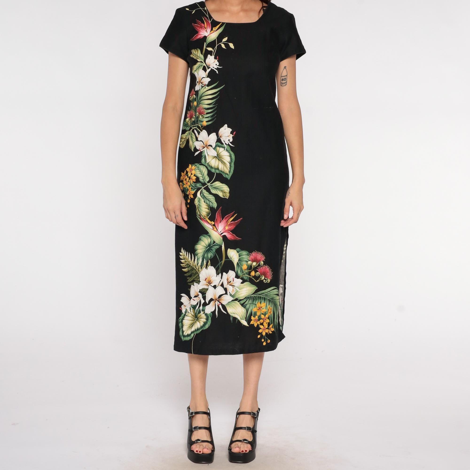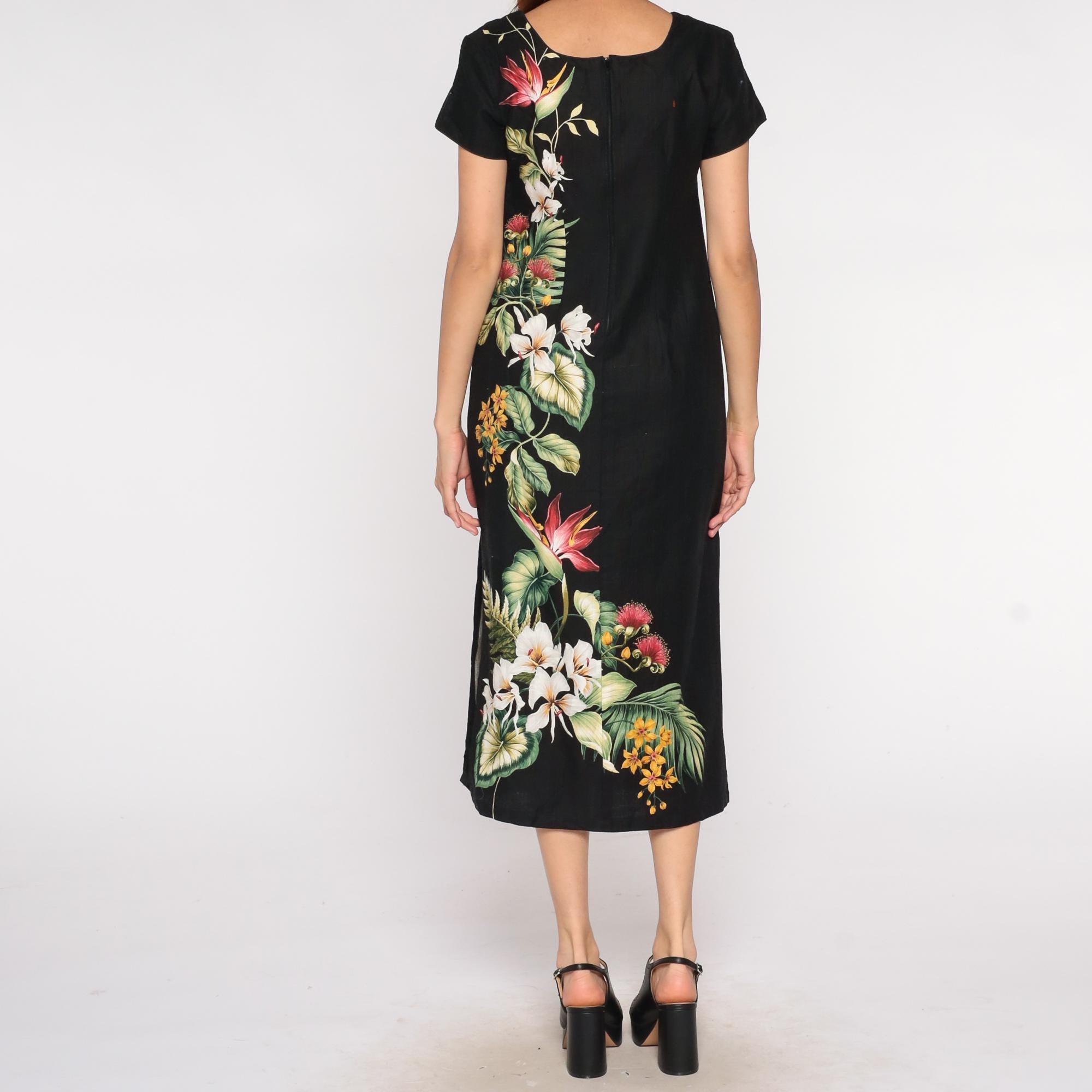 Y2K black cotton dress by Young Hawaii featuring a vibrant tropical print with bird of paradise flowers, hibiscus, and palm leaves. Short sleeve midi dress with a scoop neckline and side slit. The floral design runs vertically along one side of the dress.