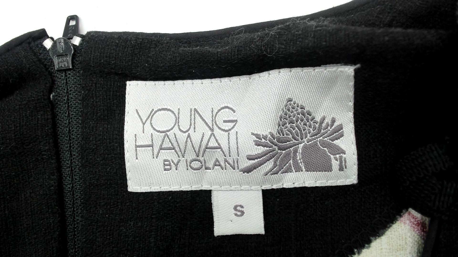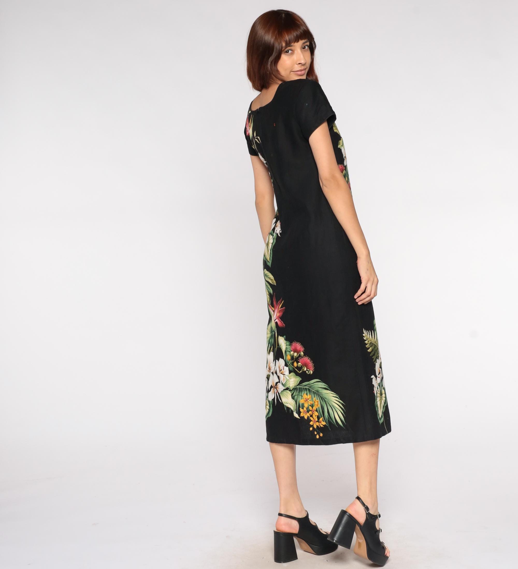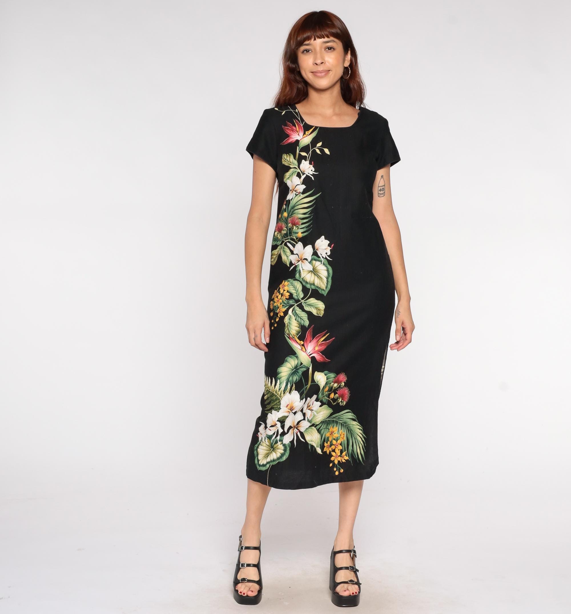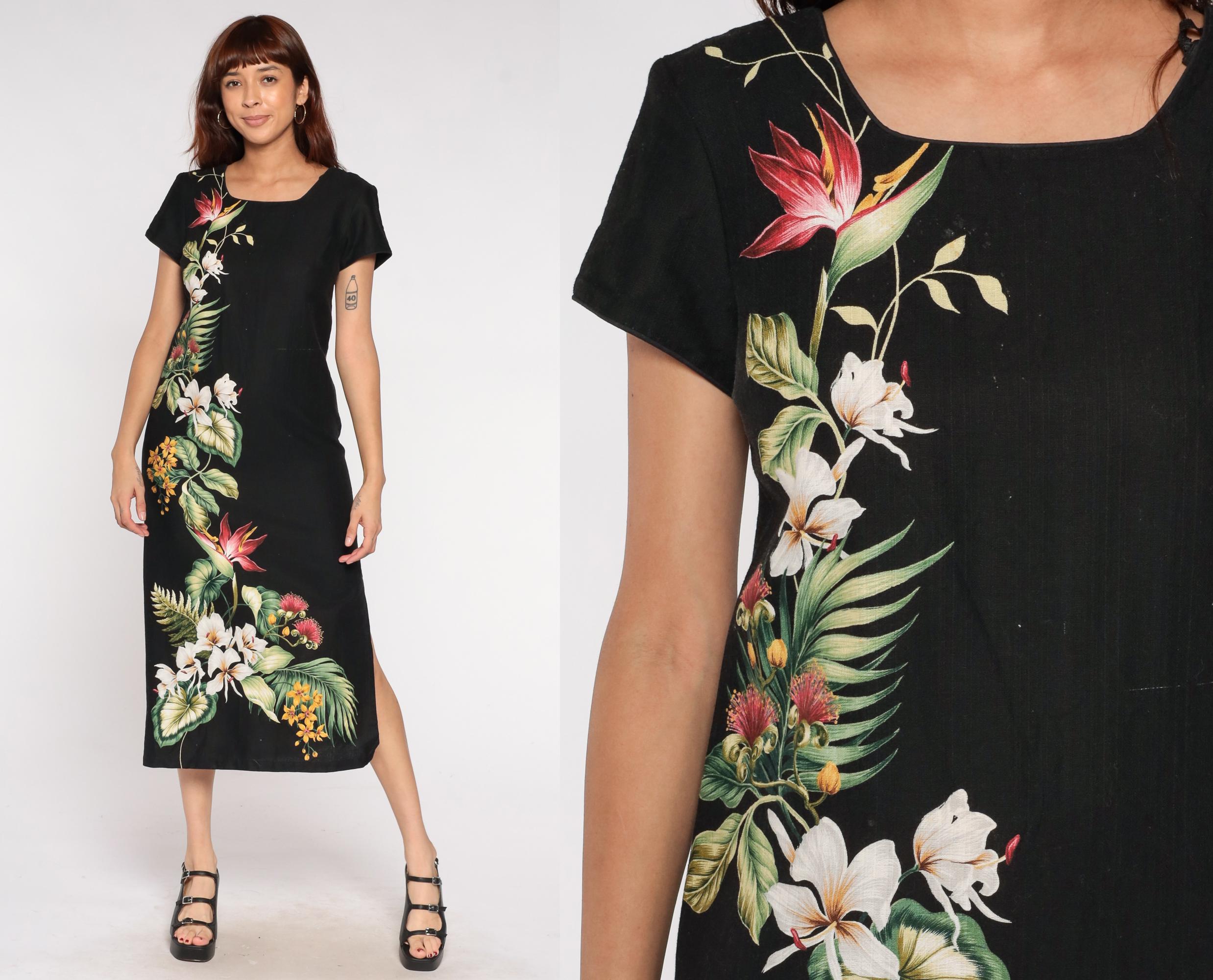 Y2K black cotton dress by Young Hawaii featuring a vibrant tropical print with bird of paradise flowers, hibiscus, and palm leaves. Short sleeve midi dress with a scoop neckline and side slit. The floral design runs vertically along one side of the dress.
