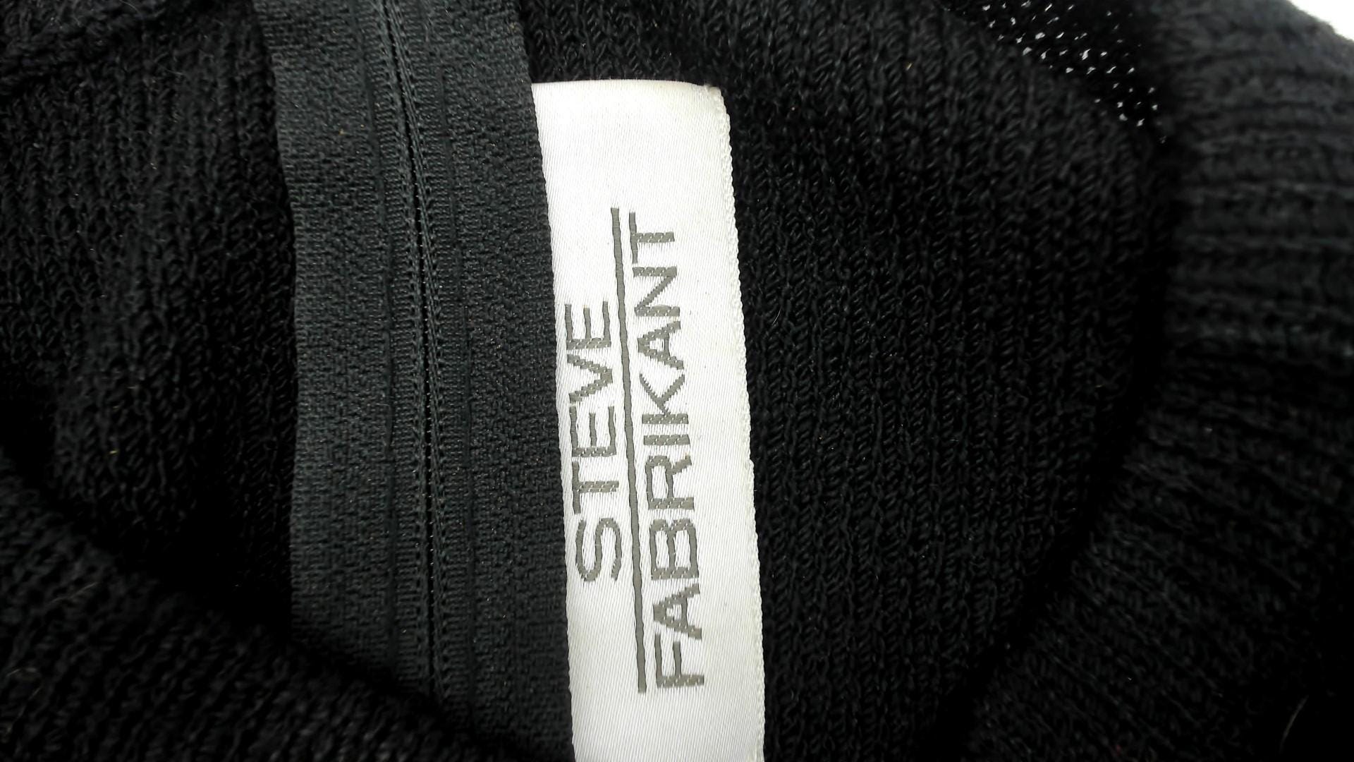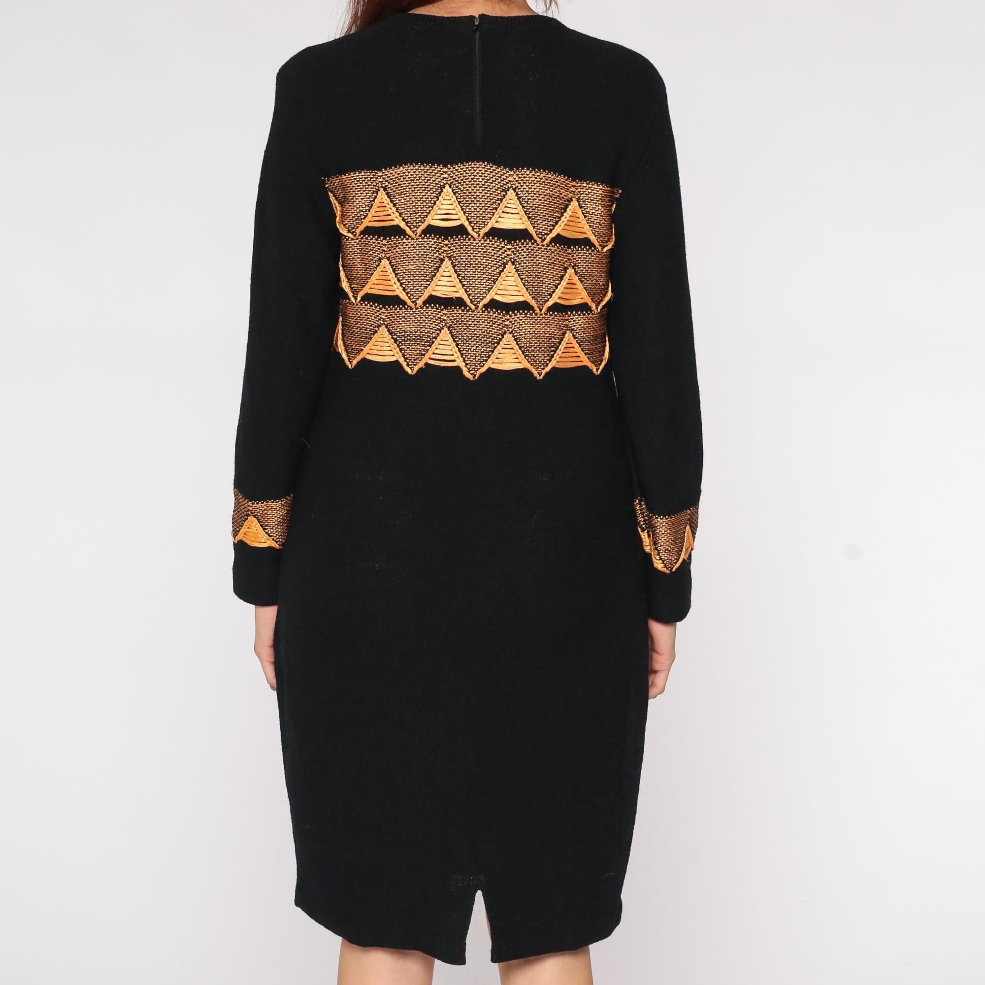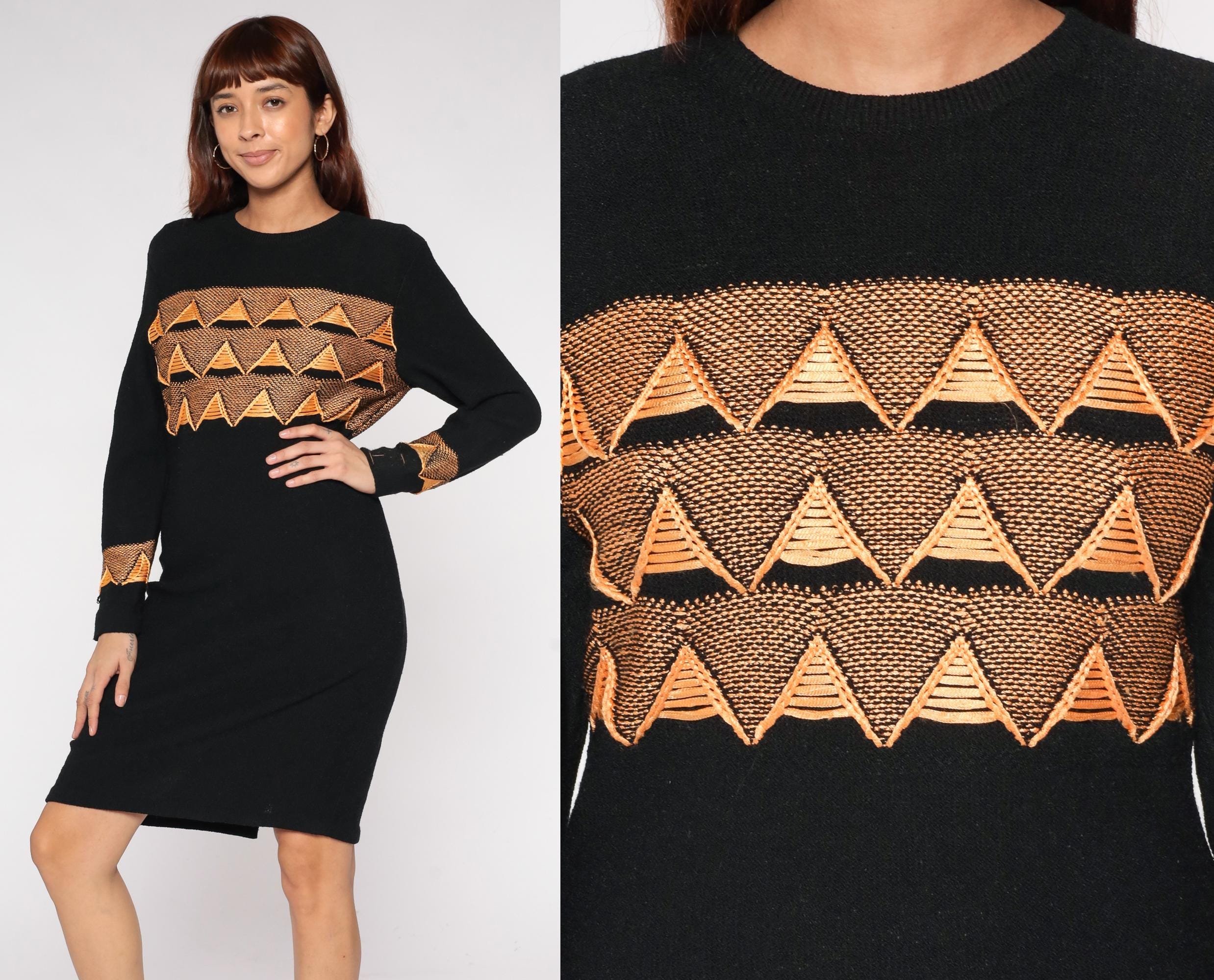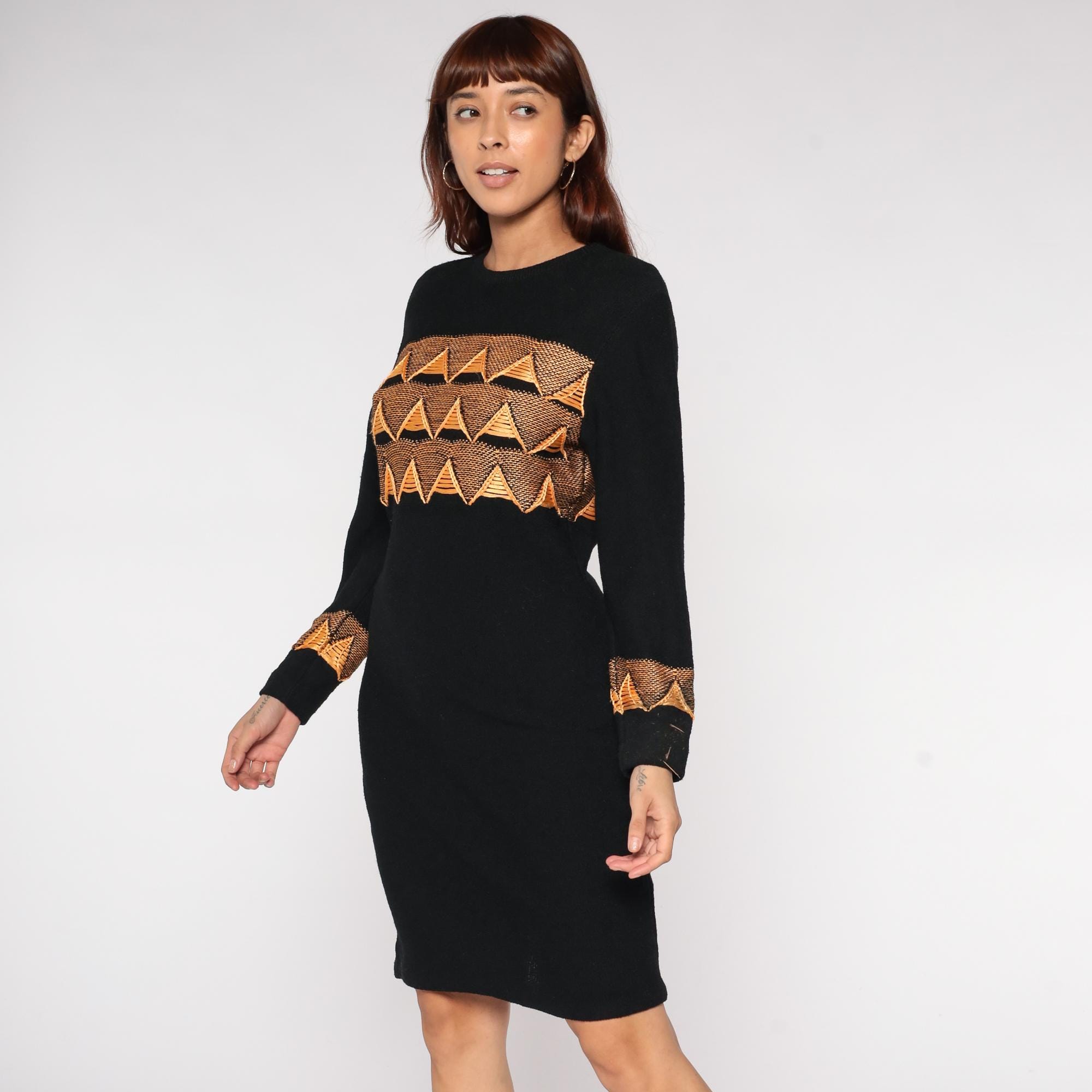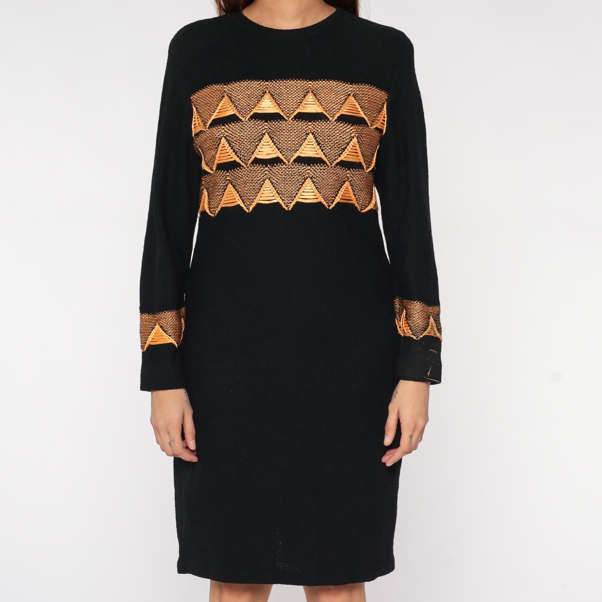 90s black sweater dress by Steve Fabrikant featuring a striking gold triangle pattern across the chest and cuffs. Long sleeve style with back zip closure.