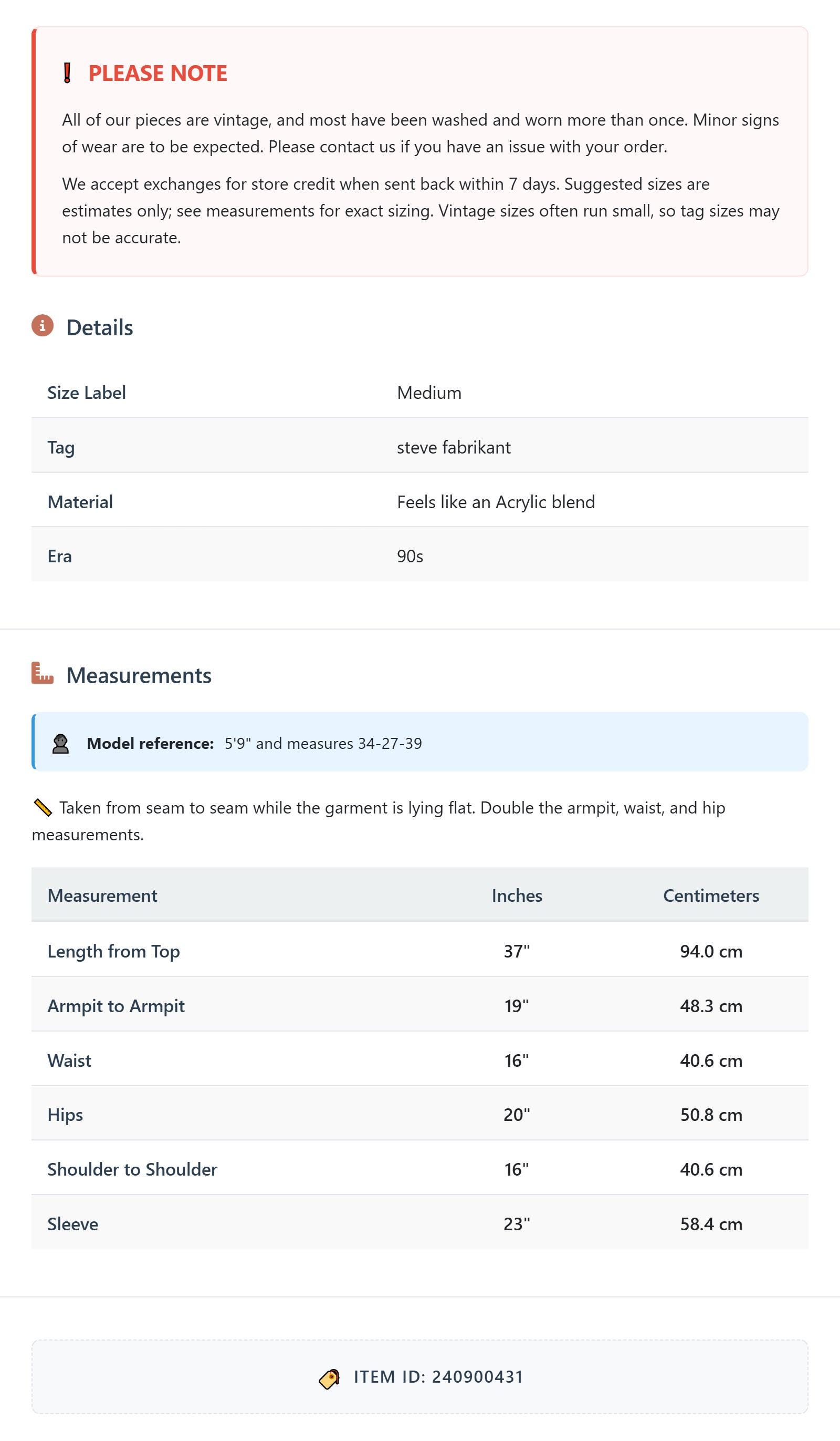 Suggested sizes are estimates only; see measurements for exact sizing. Vintage sizes often run small, so tag sizes may not be accurate.