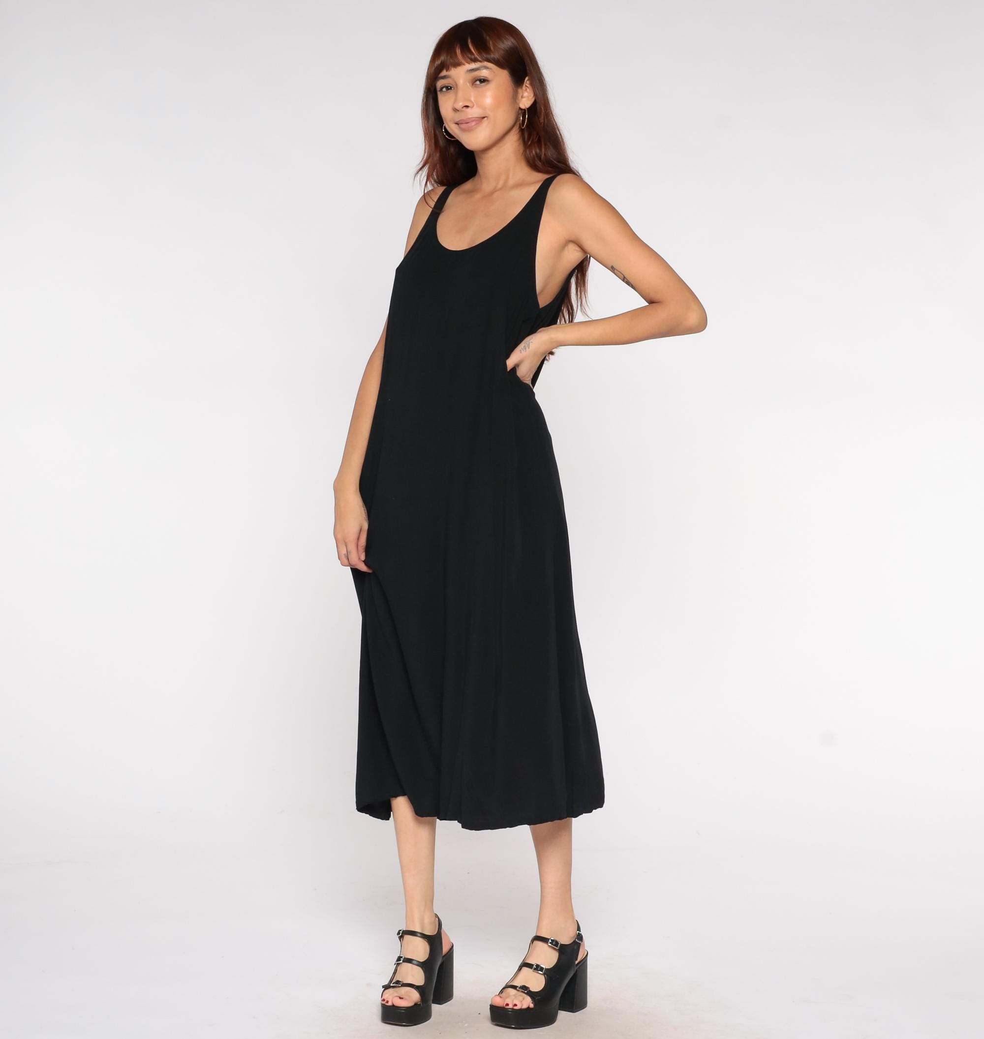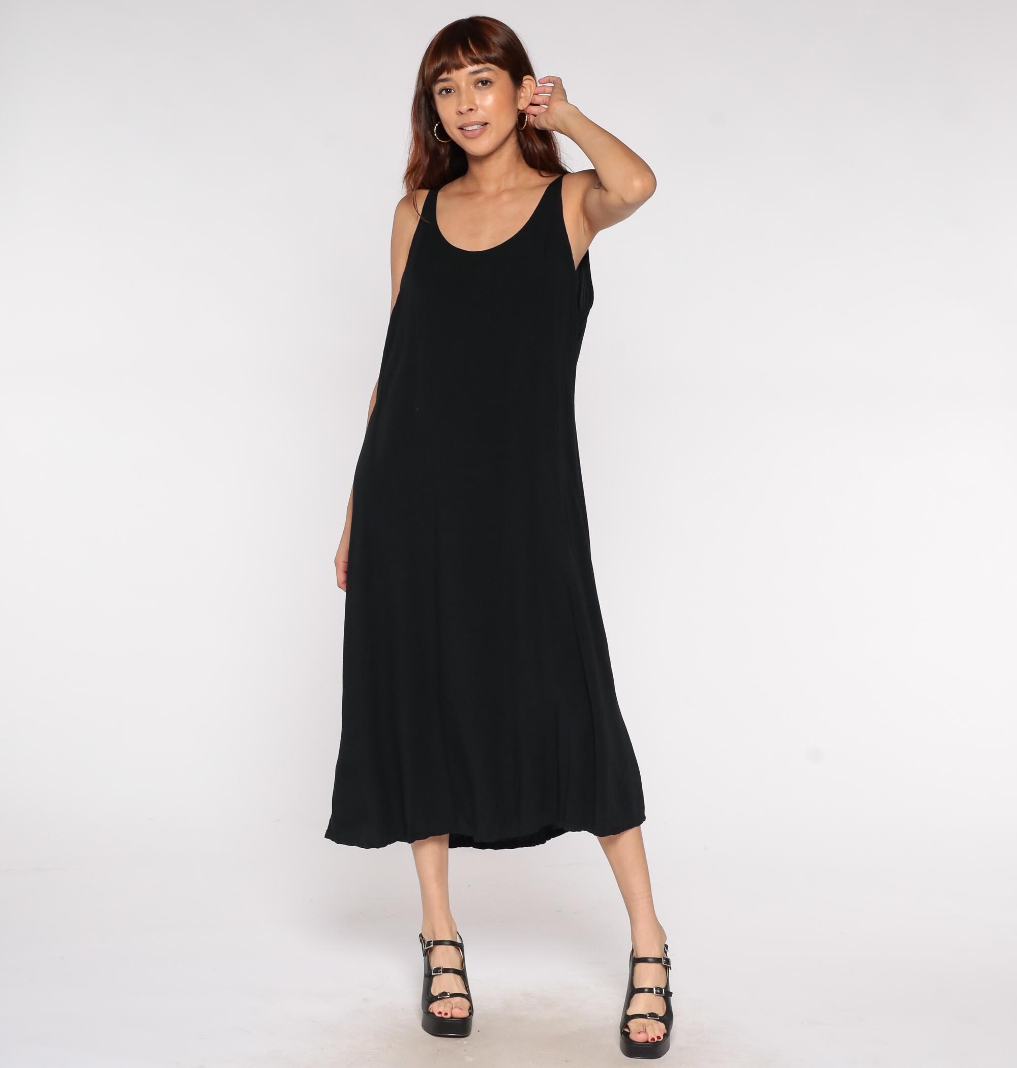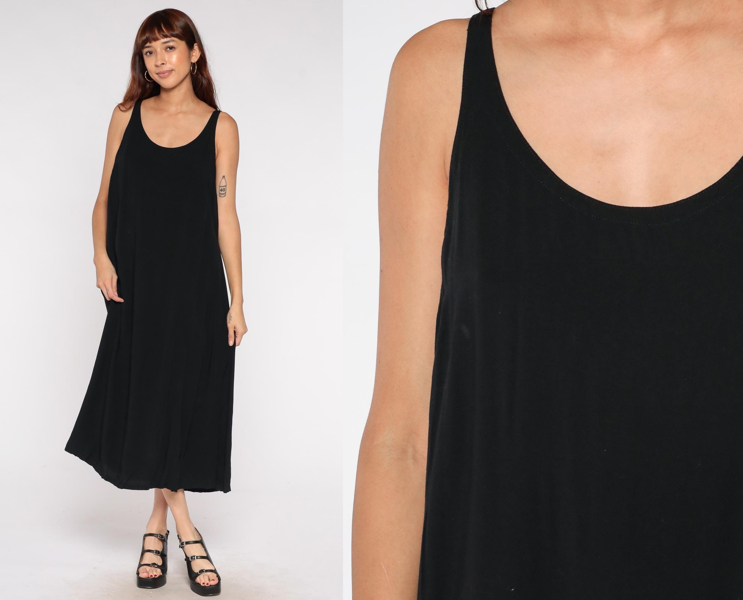 Y2K black rayon maxi dress by Drapers & Damons in a sleeveless tank style with a scoop neckline. Features a simple column silhouette with a flowy, relaxed fit perfect for resort wear or evening occasions.