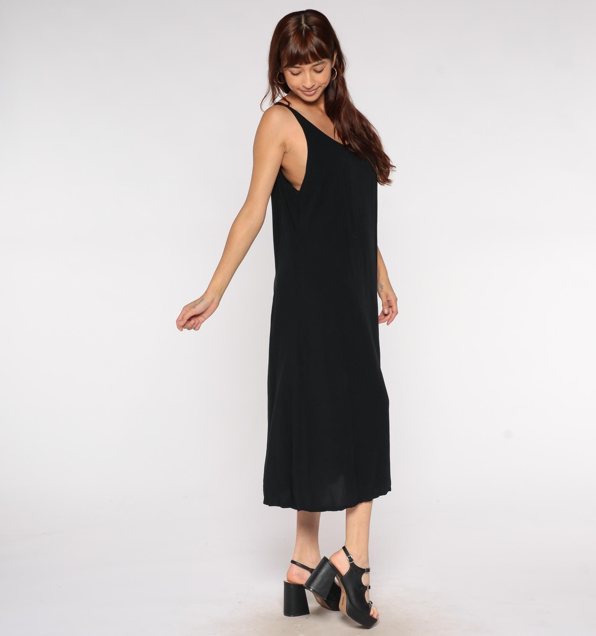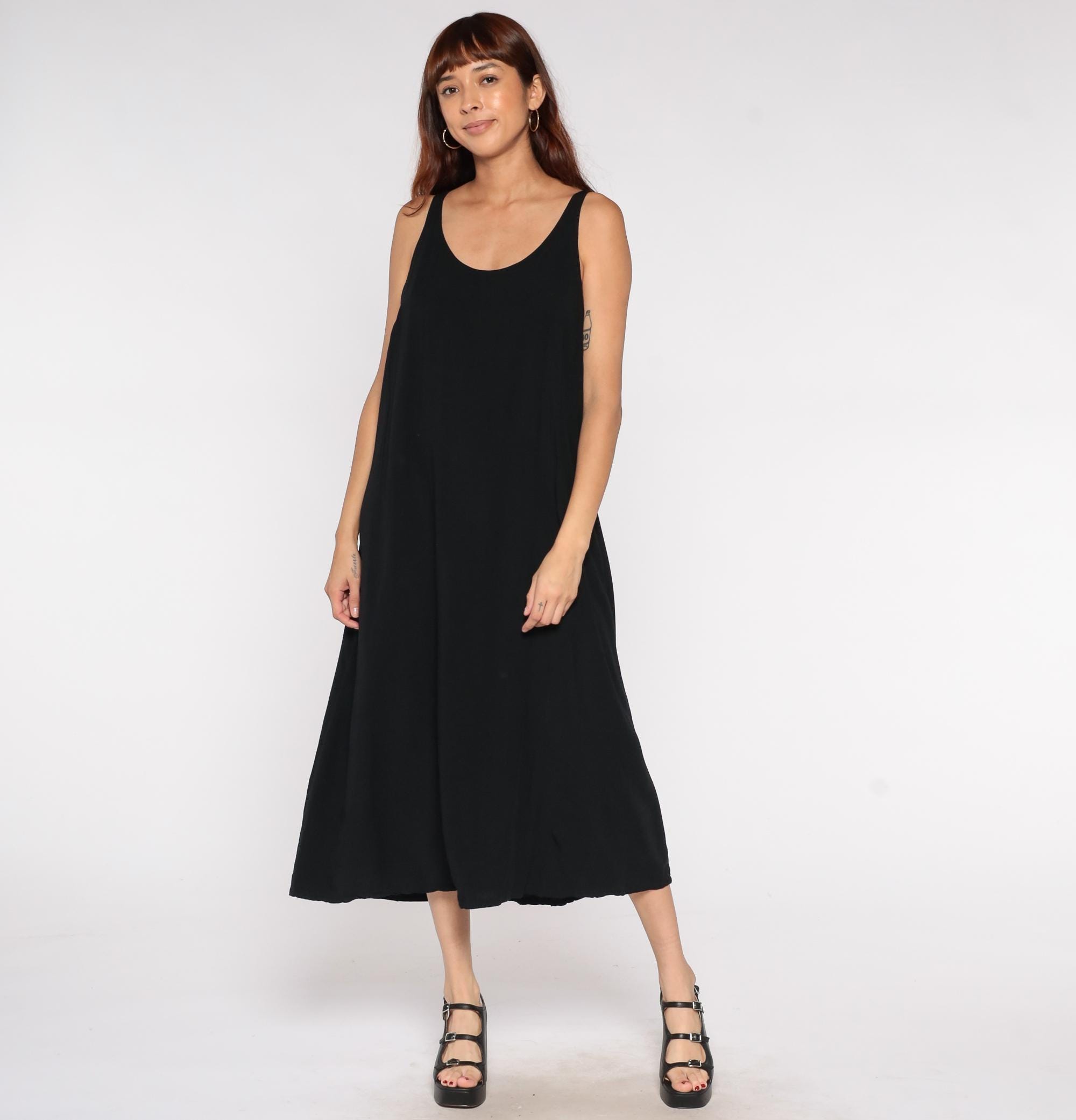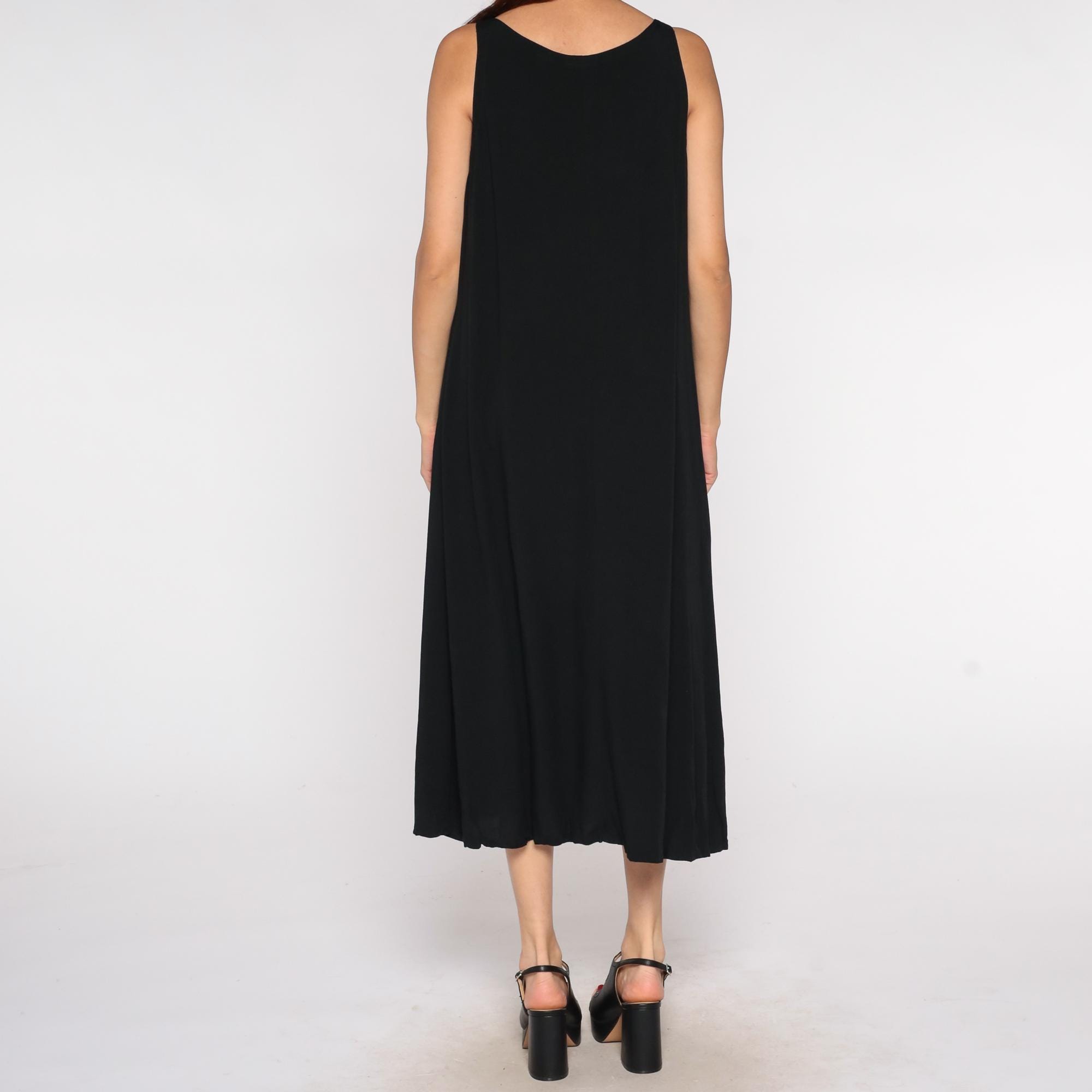Y2K black rayon maxi dress by Drapers & Damons in a sleeveless tank style with a scoop neckline. Features a simple column silhouette with a flowy, relaxed fit perfect for resort wear or evening occasions.