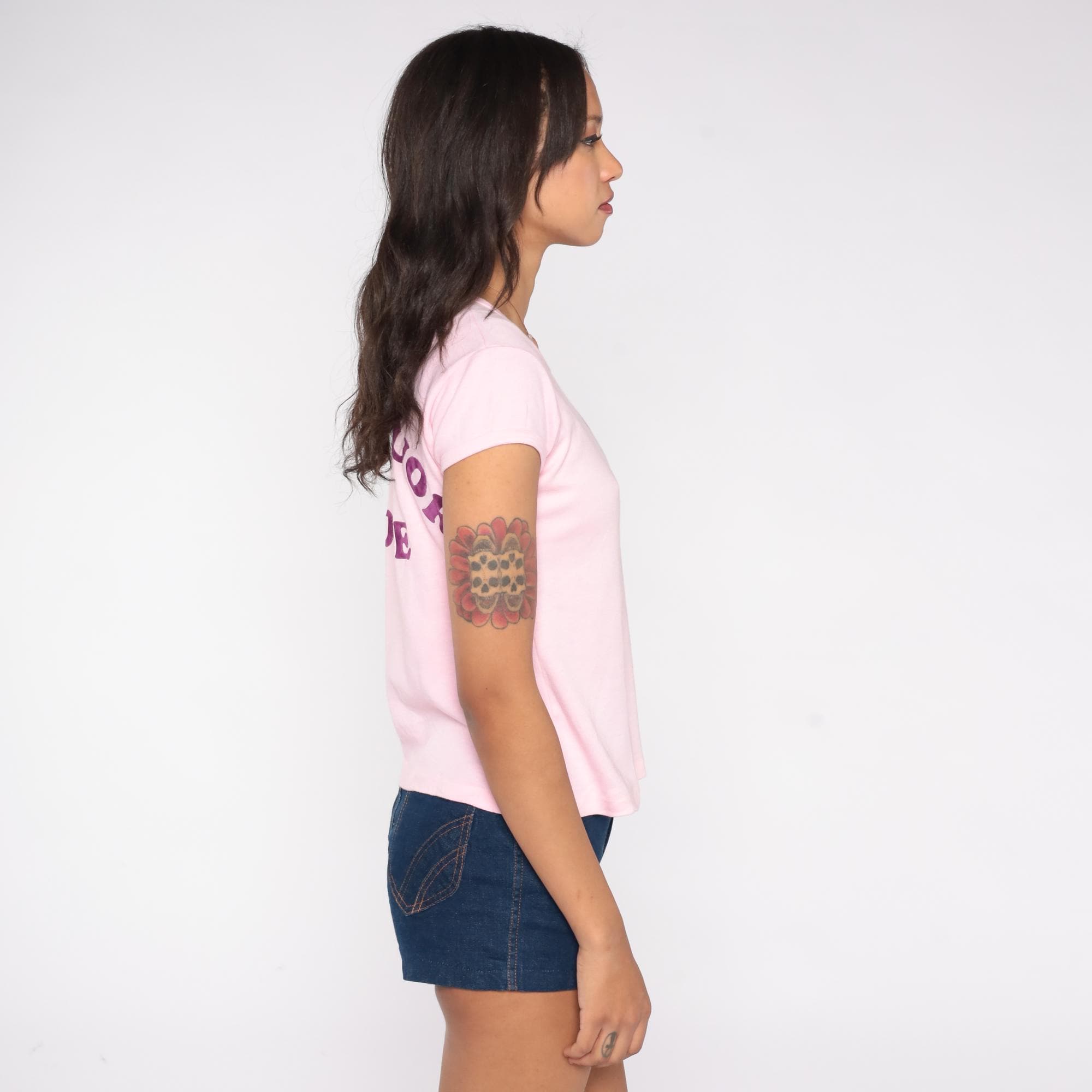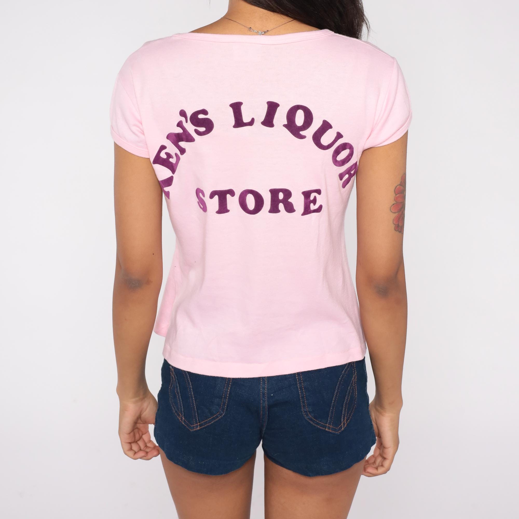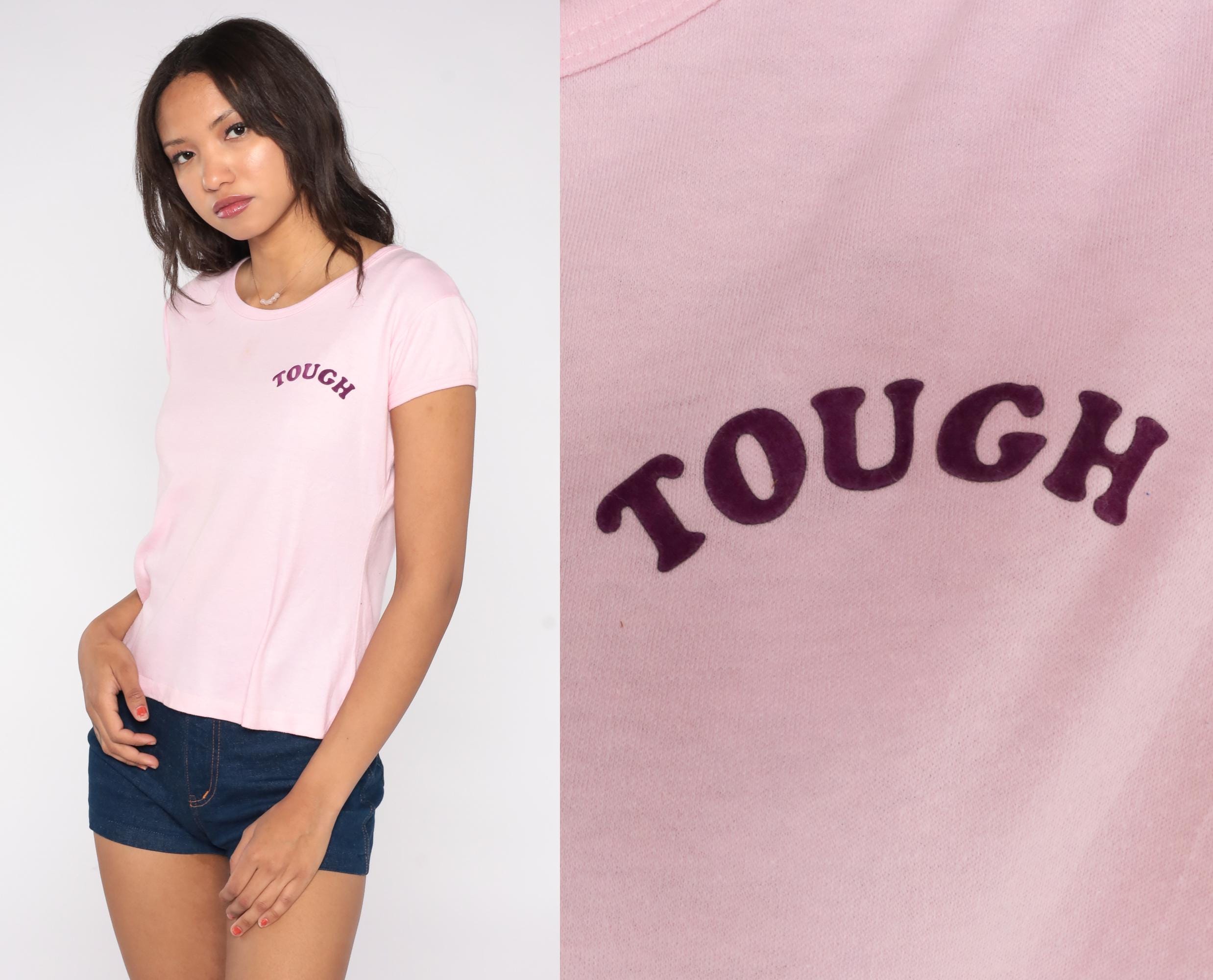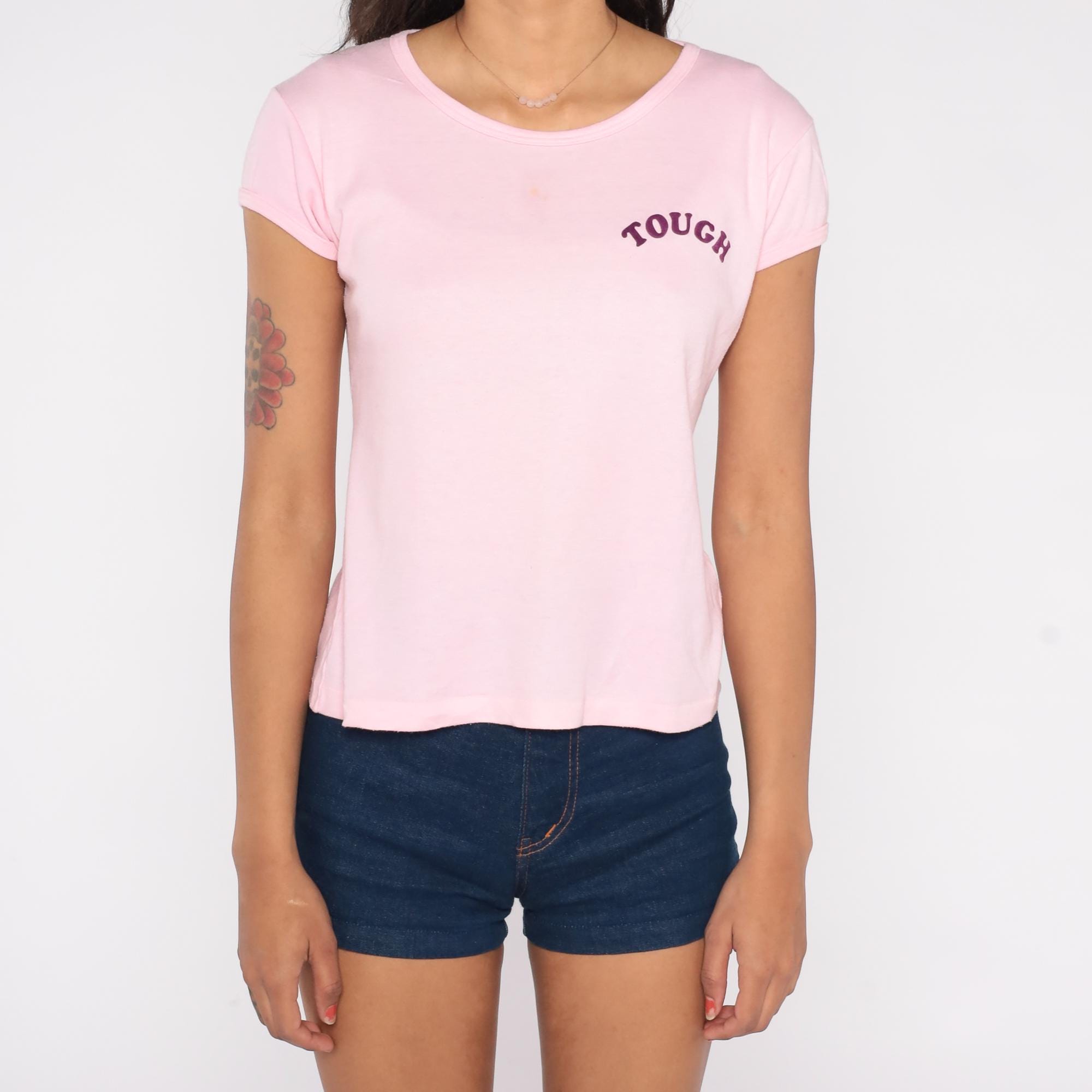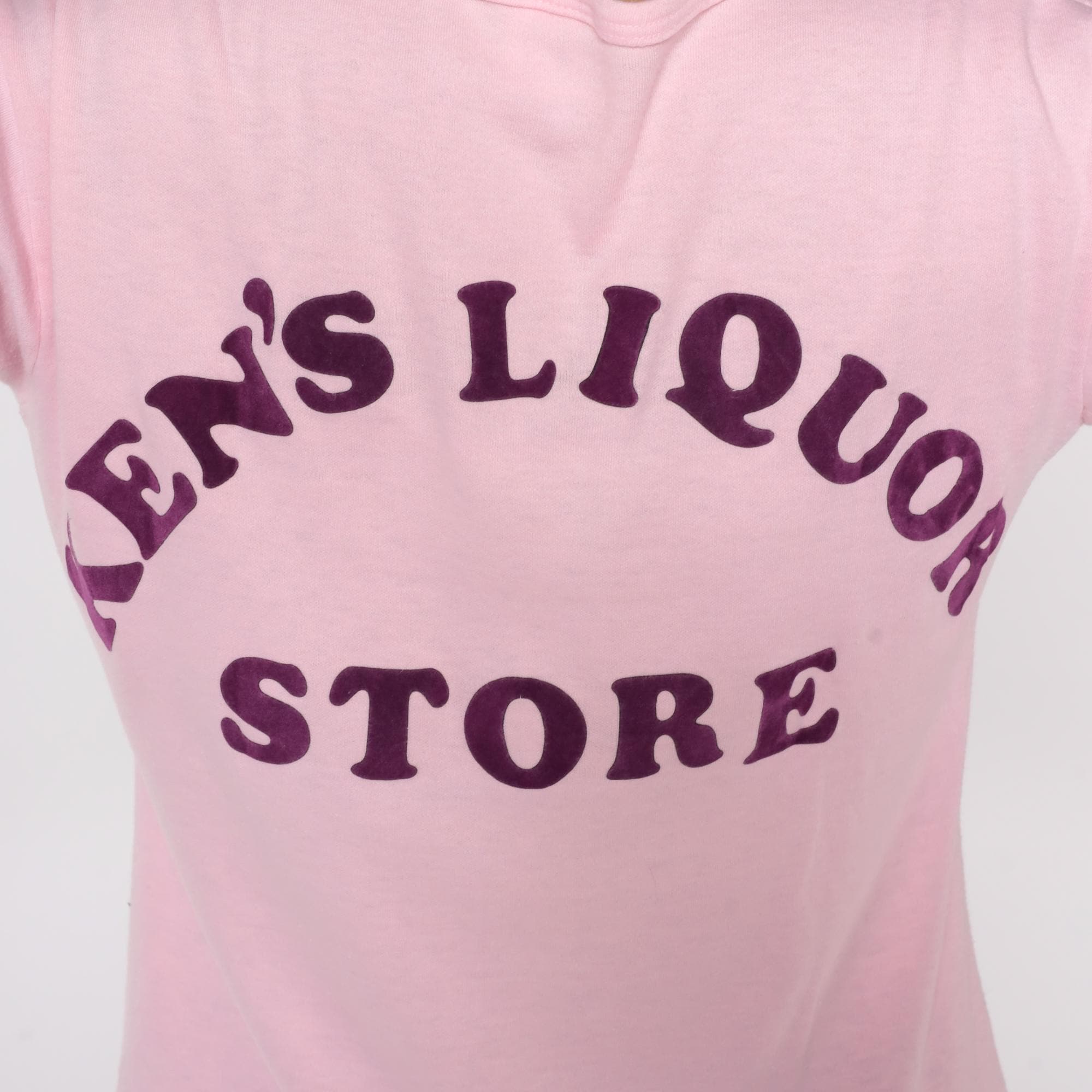80s pink t-shirt features bold burgundy text with "TOUGH" printed on the chest and "MEN'S LIQUOR STORE" across the back. The fabric has a soft, vintage feel with the perfect amount of wear.