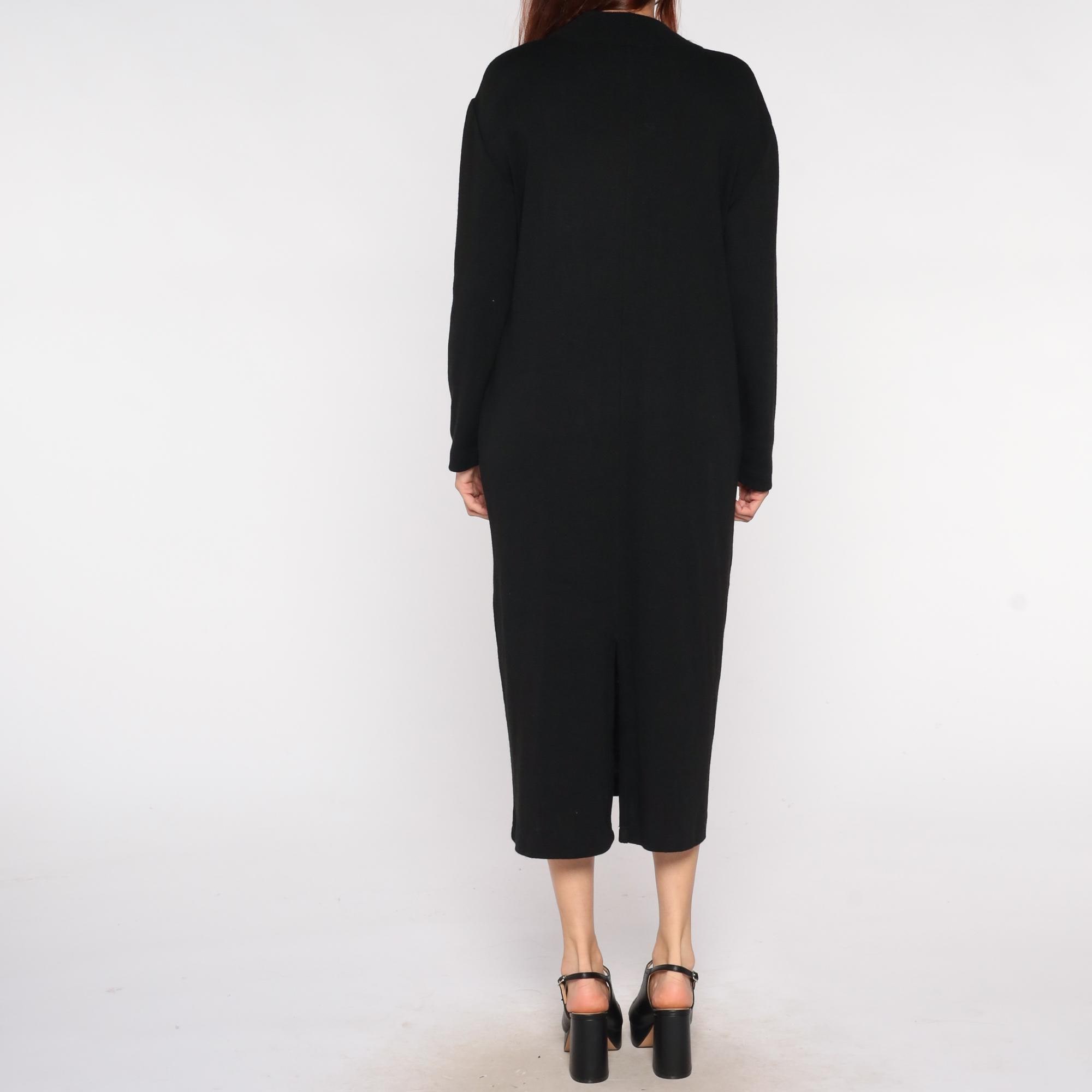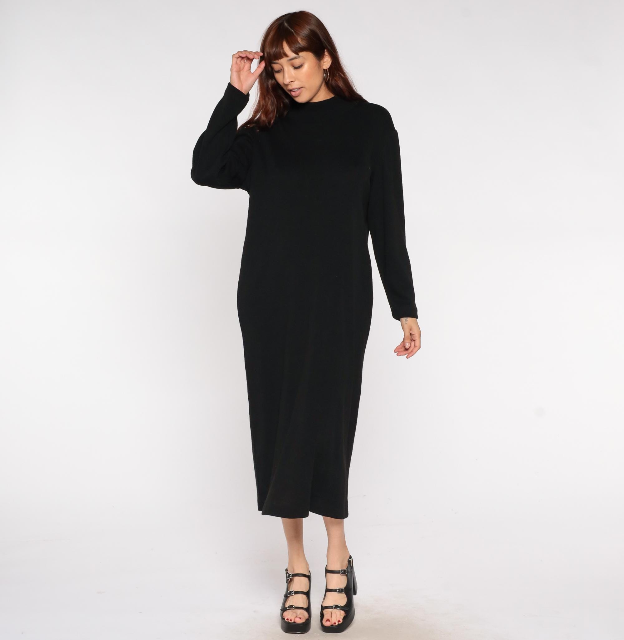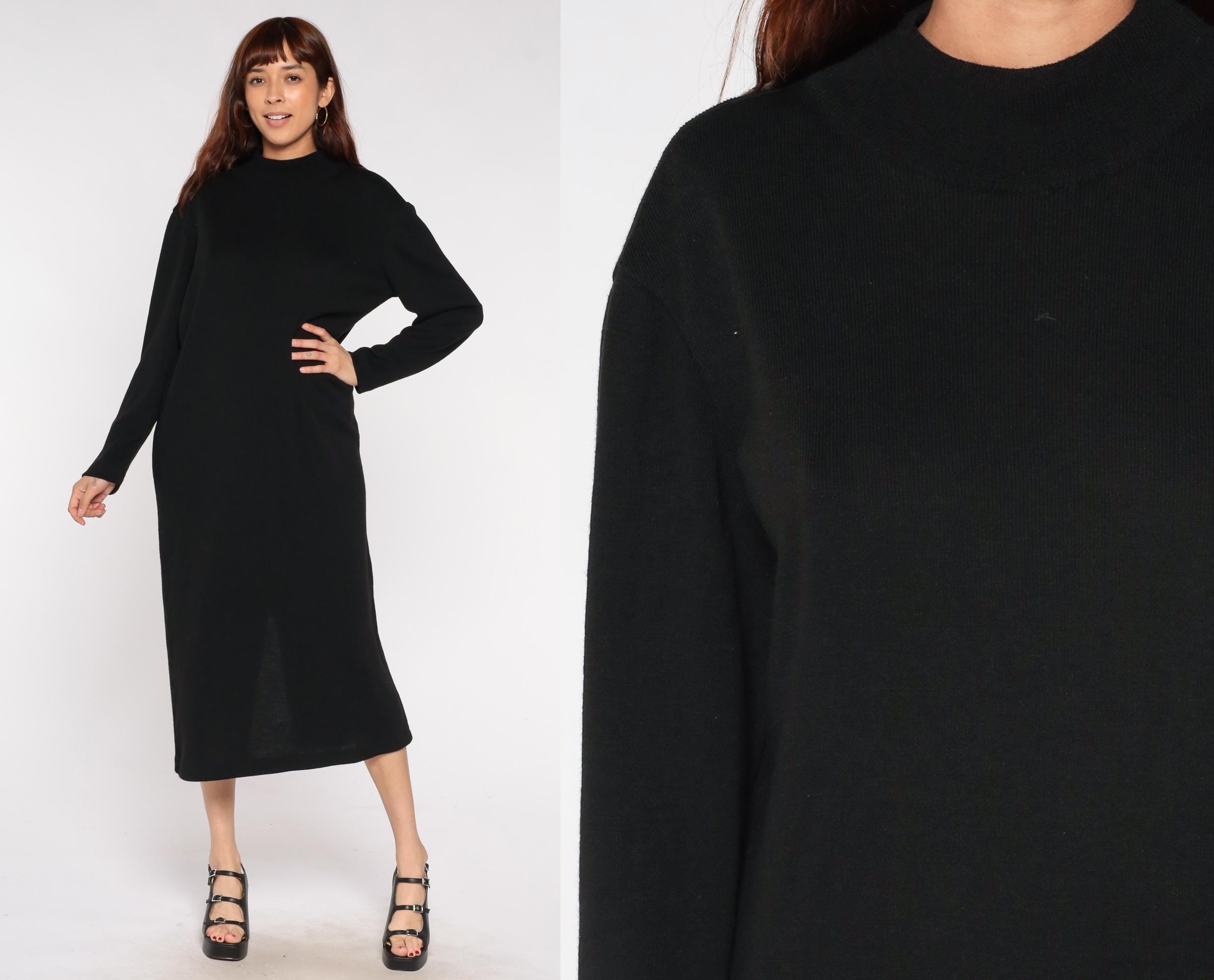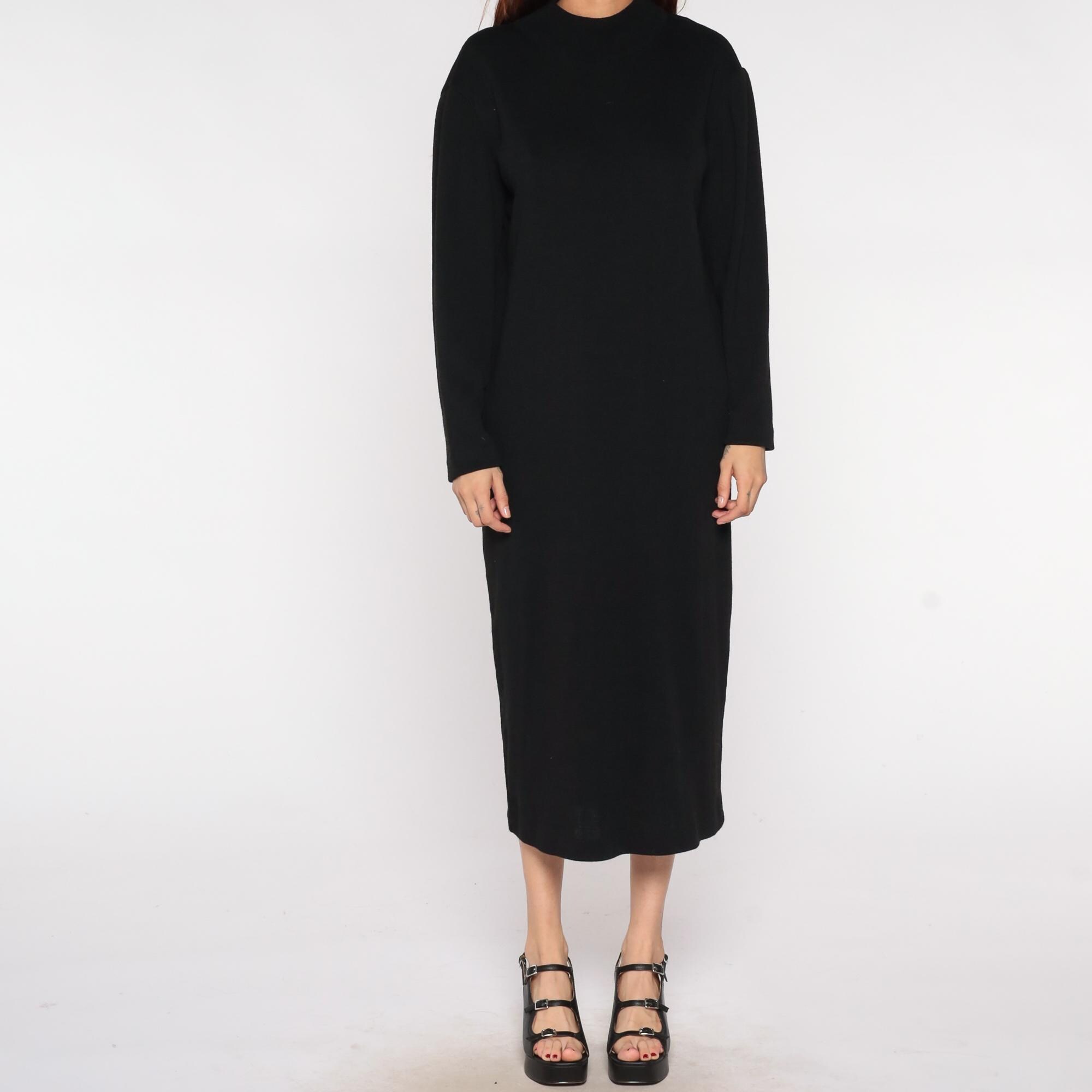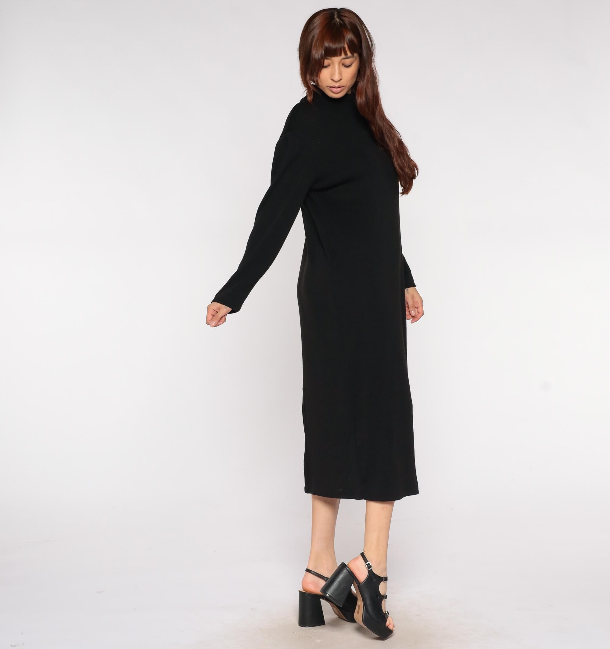 Y2K black acrylic sweater dress featuring a simple minimalist design with mock neck and long sleeves. Midi length with straight column silhouette.