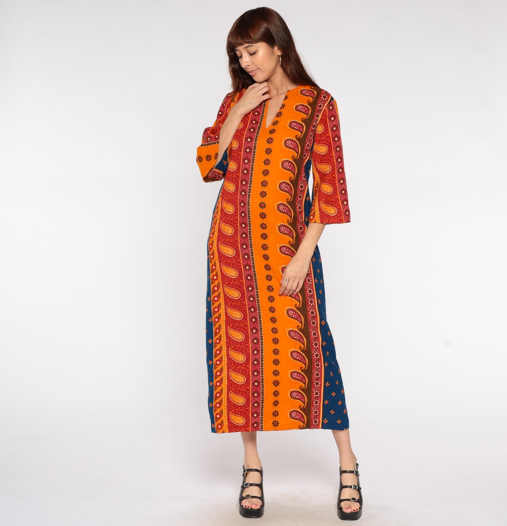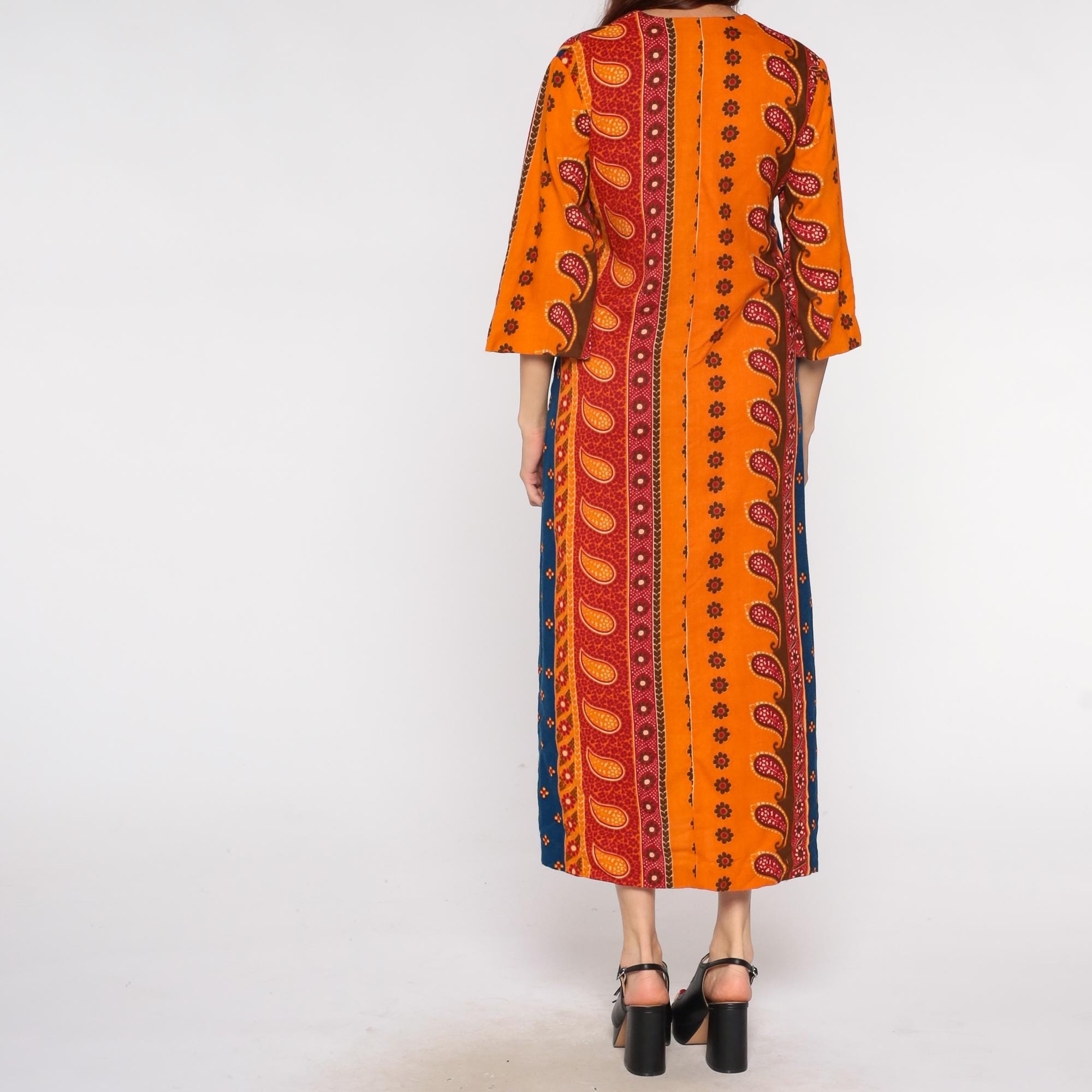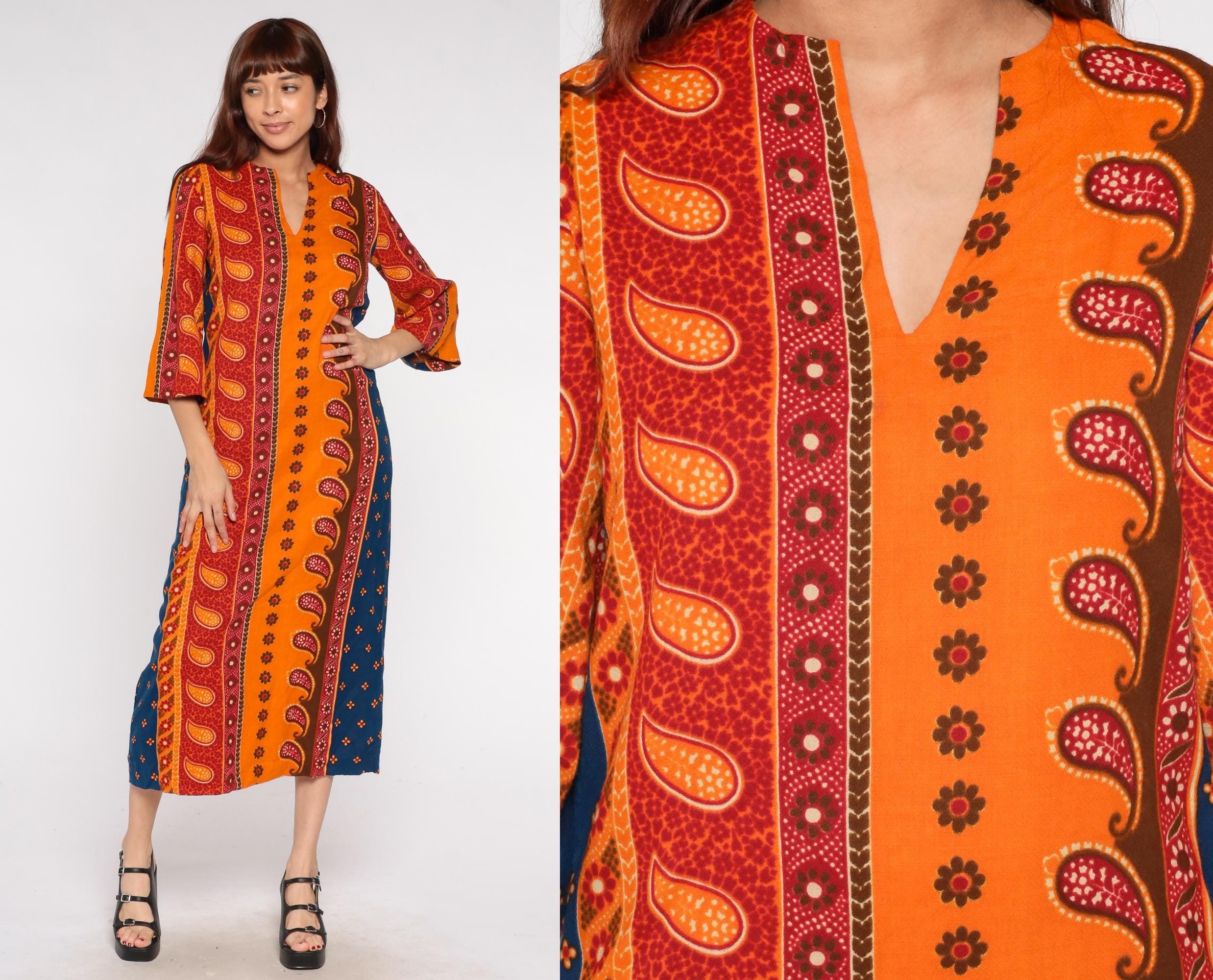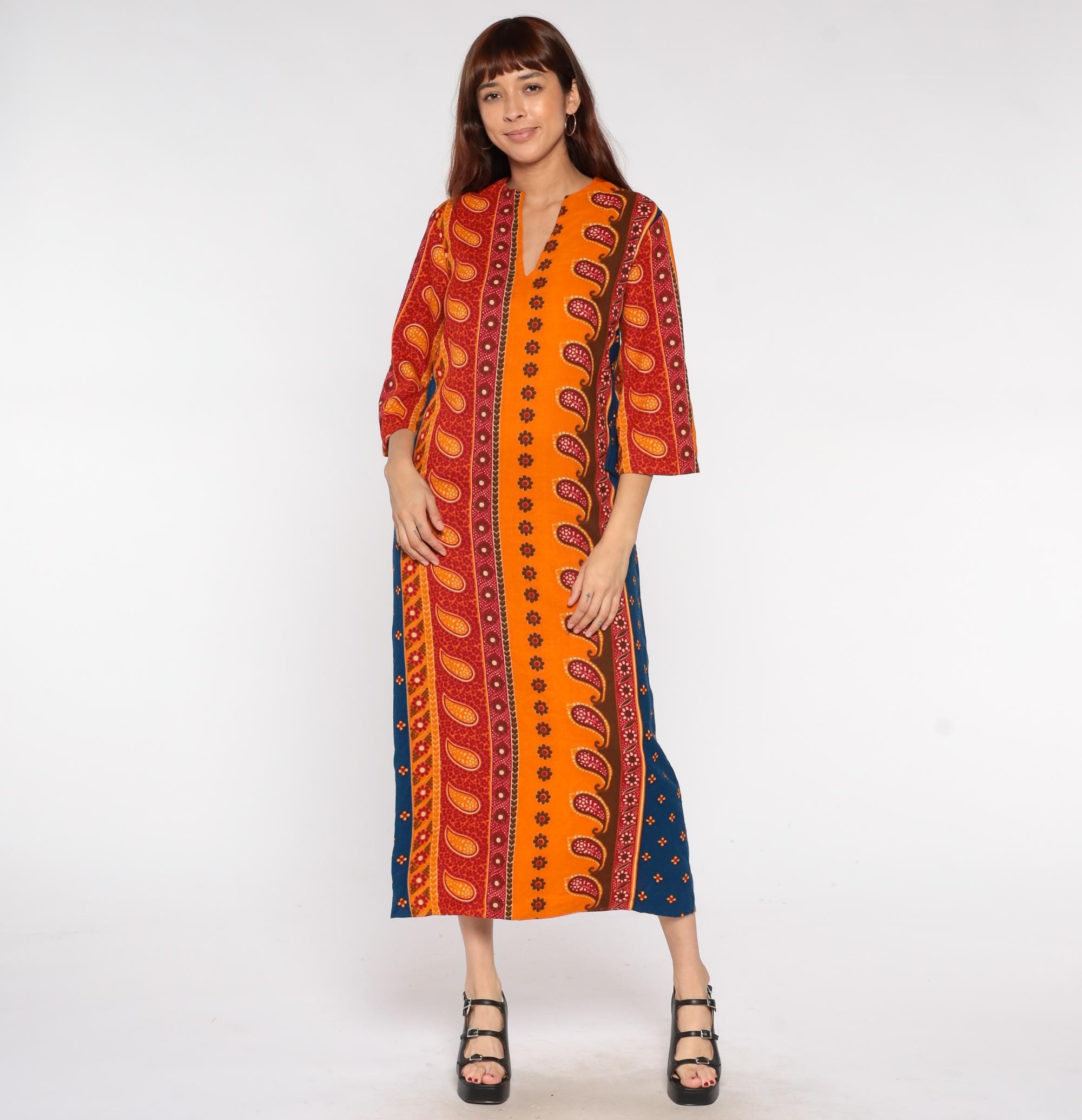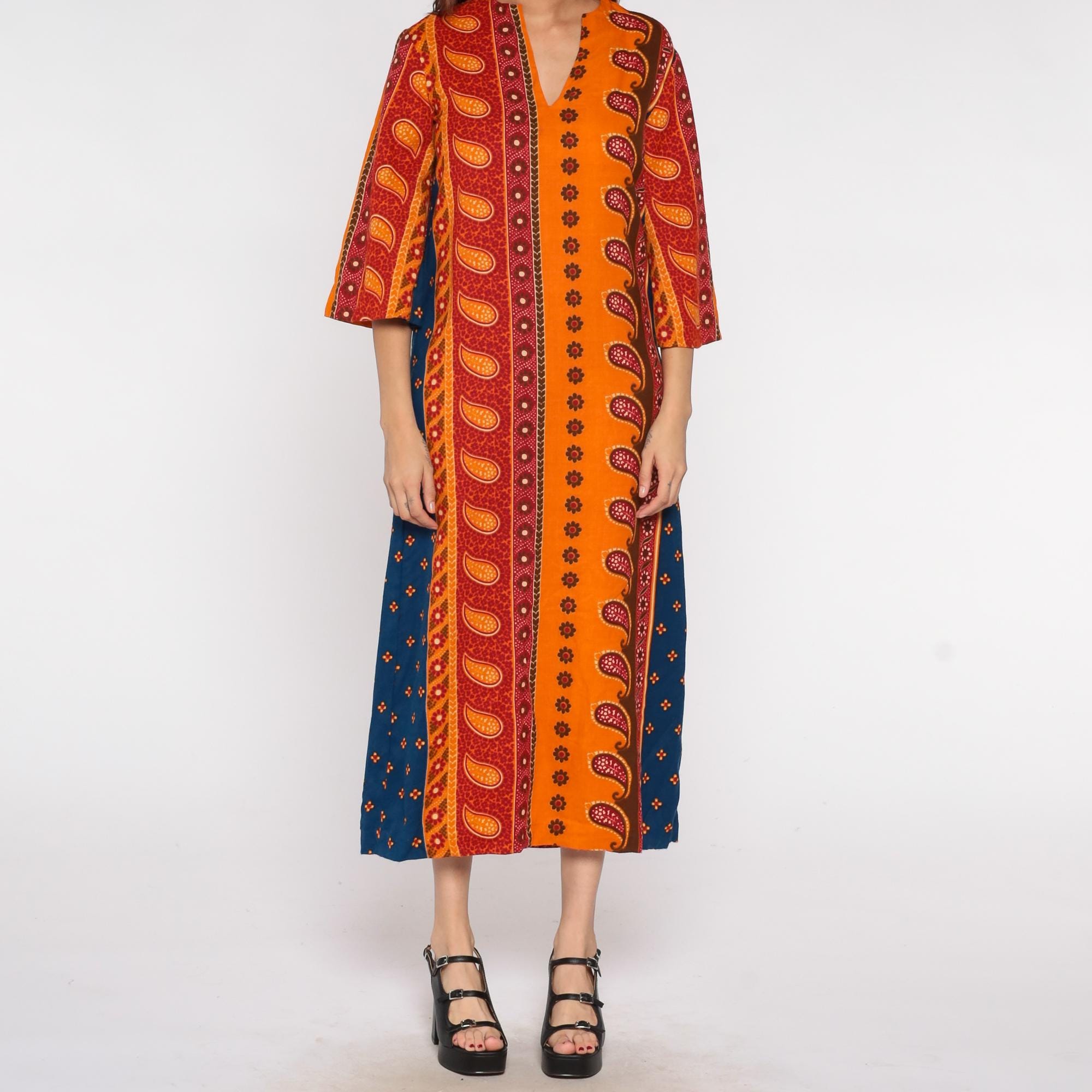 70s acrylic caftan dress featuring vibrant orange, red and blue paisley/block print pattern. V-neckline with 3/4 length sleeves in a pullover style. Loose-fitting maxi length design with Indian-inspired print
